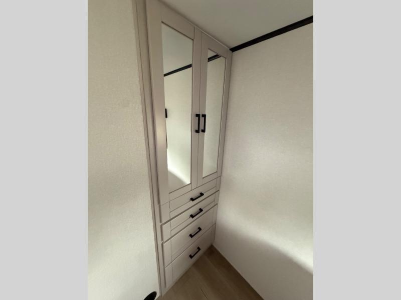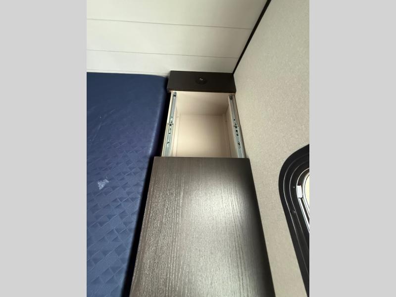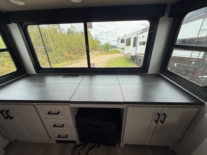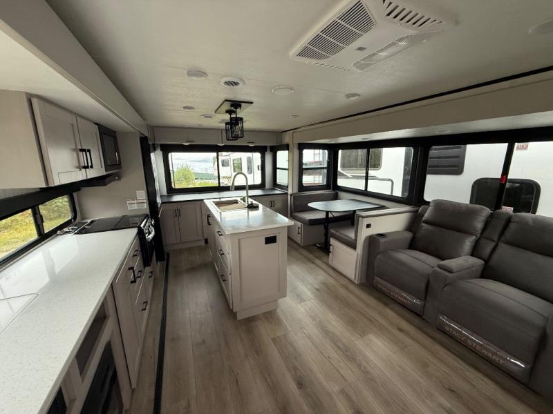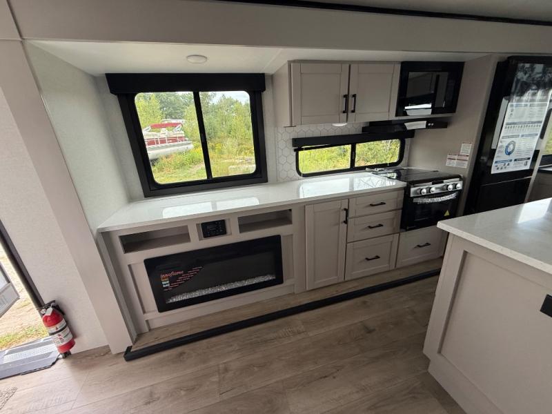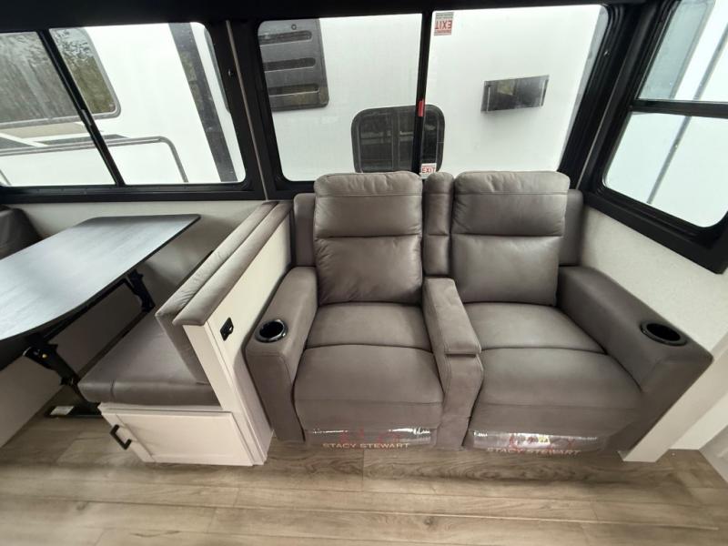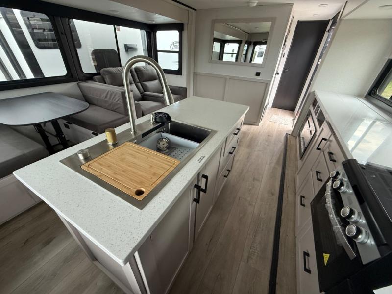 Perfect for weekend trips or extended stays, this travel trailer is the one! You will find a rear desk with an ottoman plus overhead storage if you plan to work while you're away from home. The dual opposing slides in the combined kitchen and living area will create an open floorplan, and the kitchen island will provide the chef of your group with more counter space. There is a tri-fold sofa and booth dinette that double as seating and sleeping space, and the full bath onboard will keep everyone clean. Don't overlook the front private bedroom with a queen bed and plenty of storage space for your belongings!