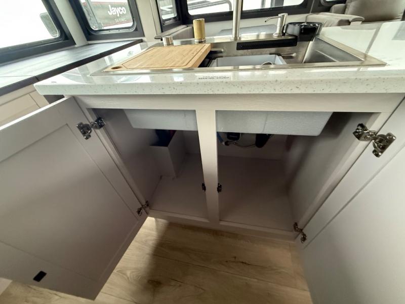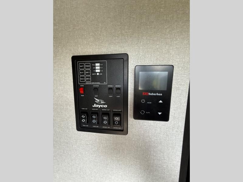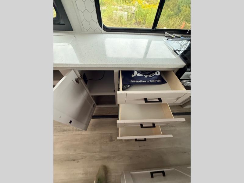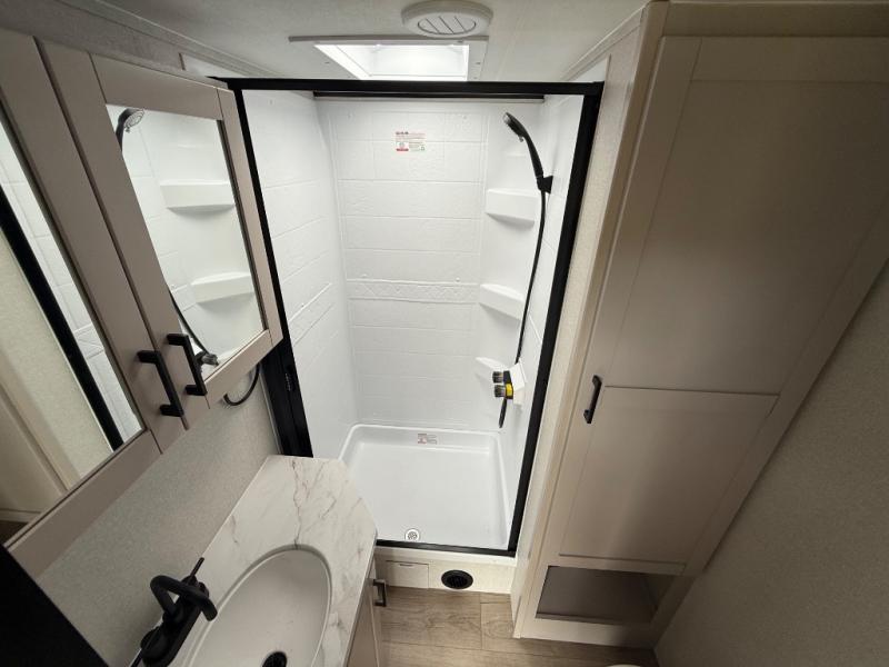 With any Jay Feather travel trailer by Jayco, you will enjoy lightweight towing, convenient exterior amenities, and at-home comforts inside! The Overlander 1 Solar Package included within the Jay Sport Package comes with a 200W solar panel and a 30-amp digital controller so you can enjoy some off-grid camping. There is also a modern graphics package with a dual-colored sidewall, LCI Solid Step fold-down aluminum tread steps on the main entry door, and Climate Shield 0 -100° F tested weather insulation package that will allow you to camp in all sorts of climates. The Customer Value Package will make time outdoors easier than ever with a power tongue jack and a Rock Solid stabilizer system, plus American-made nitro-filled Goodyear tires with self-adjusting electric brakes. More exterior features include a Keyed-Alike locking system, marine grade exterior speakers, a Magnum Truss roof system, and the list goes on! And we haven't even touched on the interior comforts, like the residential style seamless countertops and vinyl flooring throughout, decorative backsplash, handcrafted hardwood door/drawer fronts, and multiple USB charging ports to keep you going!