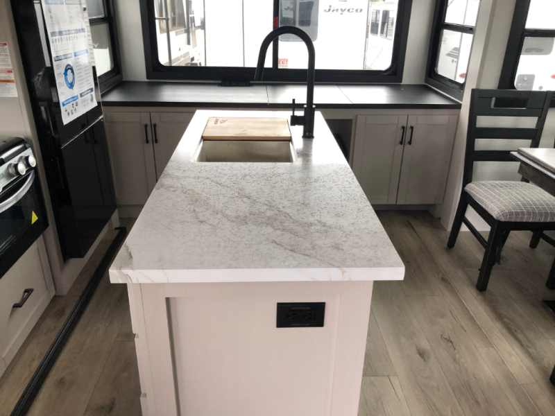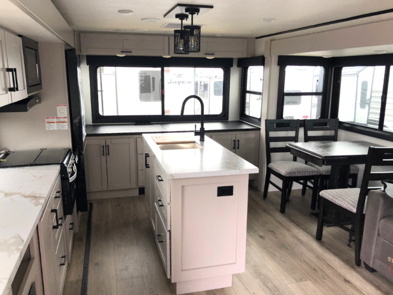 With any Jay Feather travel trailer by Jayco, you will enjoy lightweight towing, convenient exterior amenities, and at-home comforts inside! The Overlander 1 Solar Package included within the Jay Sport Package comes with a 200W solar panel and a 30-amp digital controller so you can enjoy some off-grid camping. There is also a modern graphics package with a dual-colored sidewall, LCI Solid Step fold-down aluminum tread steps on the main entry door, and Climate Shield 0 -100° F tested weather insulation package that will allow you to camp in all sorts of climates. The Customer Value Package will make time outdoors easier than ever with a power tongue jack and a Rock Solid stabilizer system, plus American-made nitro-filled Goodyear tires with self-adjusting electric brakes. More exterior features include a Keyed-Alike locking system, marine grade exterior speakers, a Magnum Truss roof system, and the list goes on! And we haven't even touched on the interior comforts, like the residential style seamless countertops and vinyl flooring throughout, decorative backsplash, handcrafted hardwood door/drawer fronts, and multiple USB charging ports to keep you going!