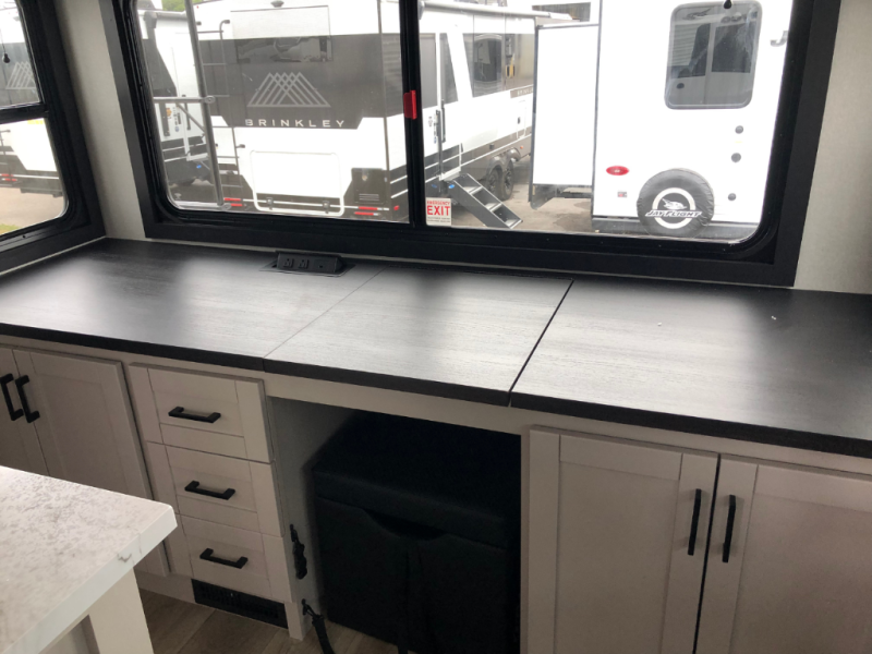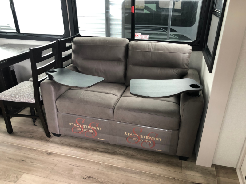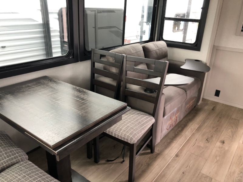 Perfect for weekend trips or extended stays, this travel trailer is the one! You will find a rear desk with an ottoman plus overhead storage if you plan to work while you're away from home. The dual opposing slides in the combined kitchen and living area will create an open floorplan, and the kitchen island will provide the chef of your group with more counter space. There is a tri-fold sofa and booth dinette that double as seating and sleeping space, and the full bath onboard will keep everyone clean. Don't overlook the front private bedroom with a queen bed and plenty of storage space for your belongings!