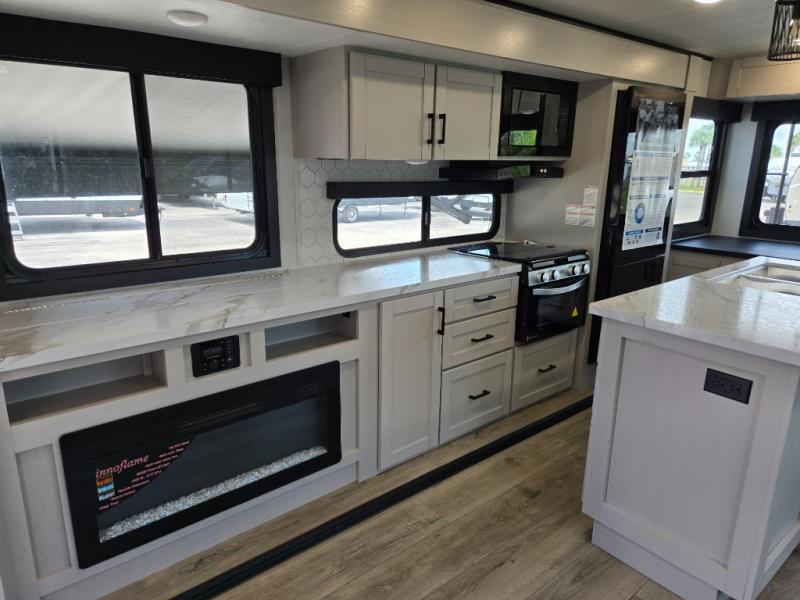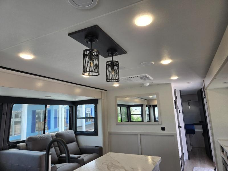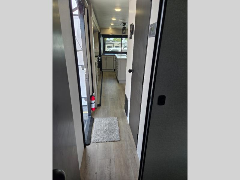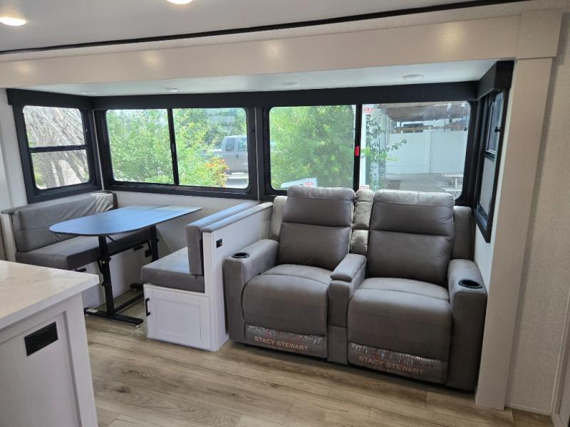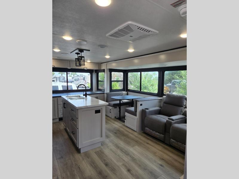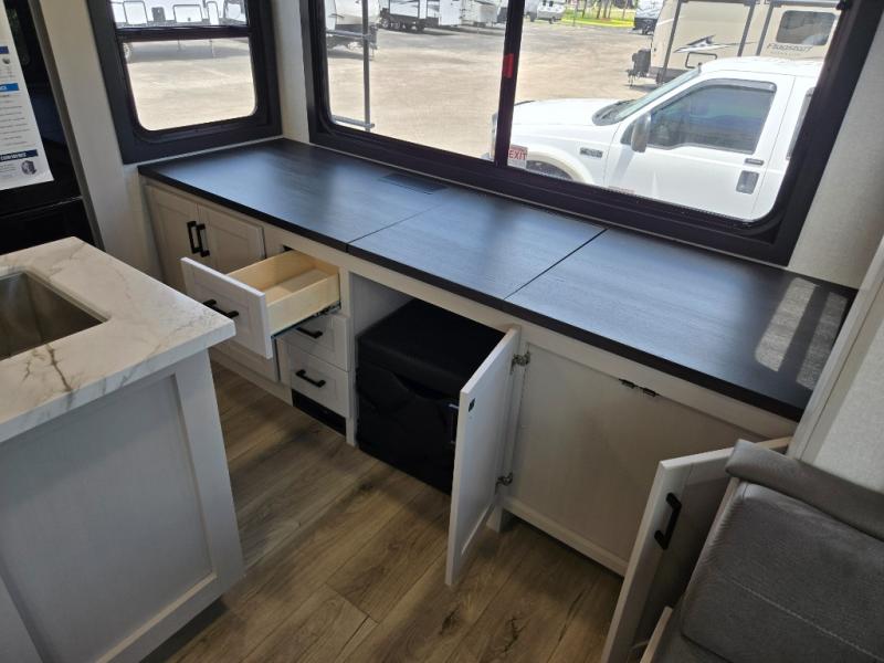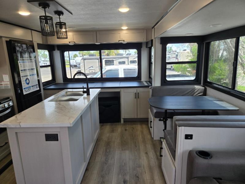 Perfect for weekend trips or extended stays, this travel trailer is the one! You will find a rear desk with an ottoman plus overhead storage if you plan to work while you're away from home. The dual opposing slides in the combined kitchen and living area will create an open floorplan, and the kitchen island will provide the chef of your group with more counter space. There is a tri-fold sofa and booth dinette that double as seating and sleeping space, and the full bath onboard will keep everyone clean. Don't overlook the front private bedroom with a queen bed and plenty of storage space for your belongings!