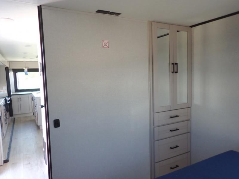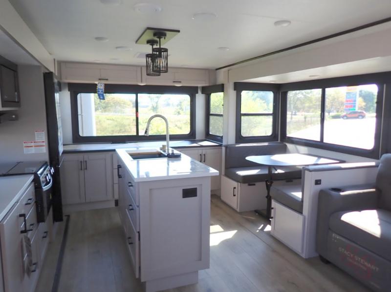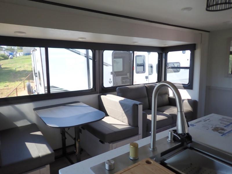 Perfect for weekend trips or extended stays, this travel trailer is the one! You will find a rear desk with an ottoman plus overhead storage if you plan to work while you're away from home. The dual opposing slides in the combined kitchen and living area will create an open floorplan, and the kitchen island will provide the chef of your group with more counter space. There is a tri-fold sofa and booth dinette that double as seating and sleeping space, and the full bath onboard will keep everyone clean. Don't overlook the front private bedroom with a queen bed and plenty of storage space for your belongings!