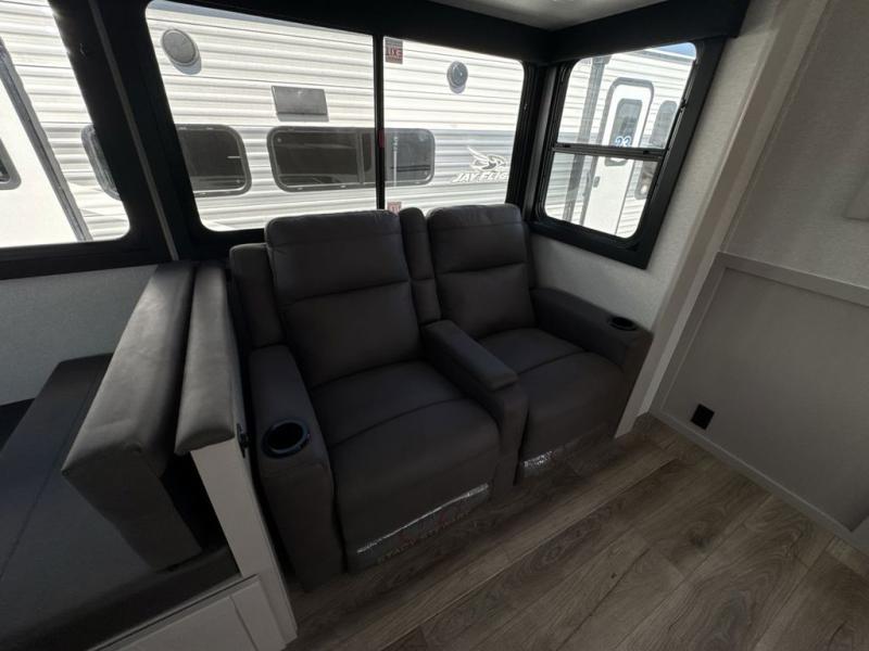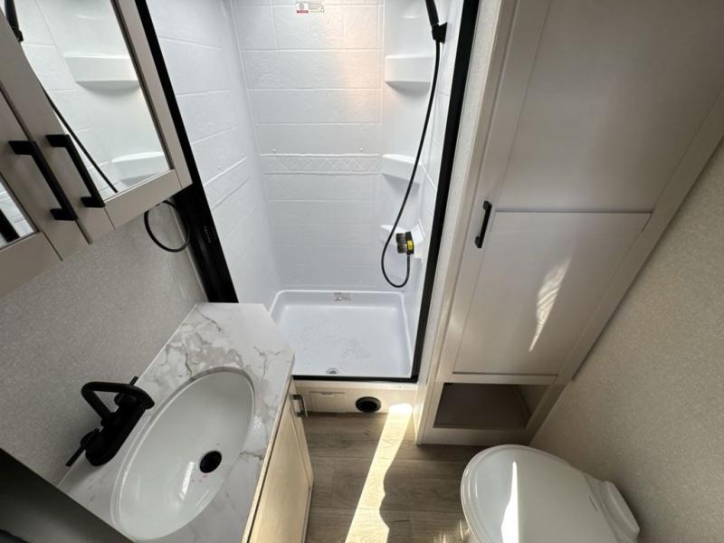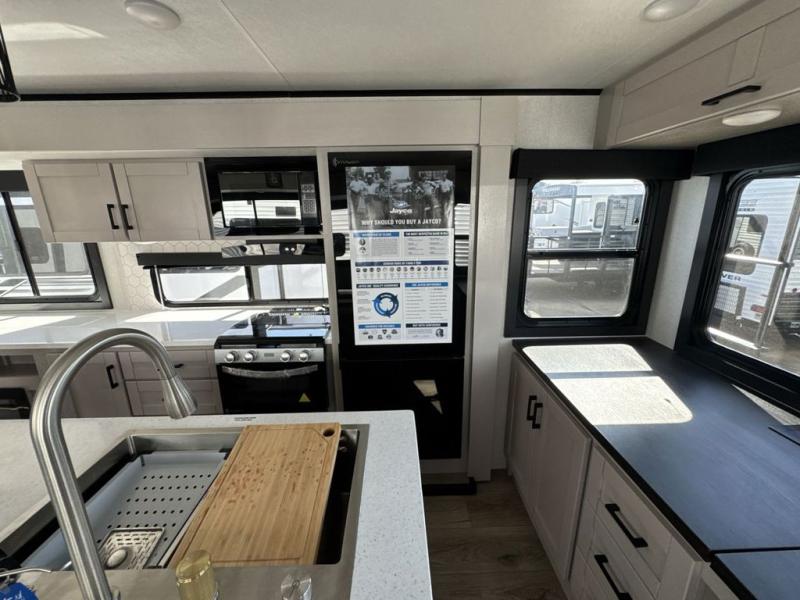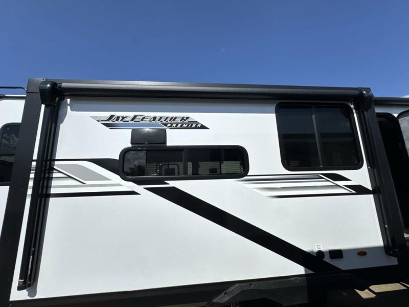 With any Jay Feather travel trailer by Jayco, you will enjoy lightweight towing, convenient exterior amenities, and at-home comforts inside! The Overlander 1 Solar Package included within the Jay Sport Package comes with a 200W solar panel and a 30-amp digital controller so you can enjoy some off-grid camping. There is also a modern graphics package with a dual-colored sidewall, LCI Solid Step fold-down aluminum tread steps on the main entry door, and Climate Shield 0 -100° F tested weather insulation package that will allow you to camp in all sorts of climates. The Customer Value Package will make time outdoors easier than ever with a power tongue jack and a Rock Solid stabilizer system, plus American-made nitro-filled Goodyear tires with self-adjusting electric brakes. More exterior features include a Keyed-Alike locking system, marine grade exterior speakers, a Magnum Truss roof system, and the list goes on! And we haven't even touched on the interior comforts, like the residential style seamless countertops and vinyl flooring throughout, decorative backsplash, handcrafted hardwood door/drawer fronts, and multiple USB charging ports to keep you going!