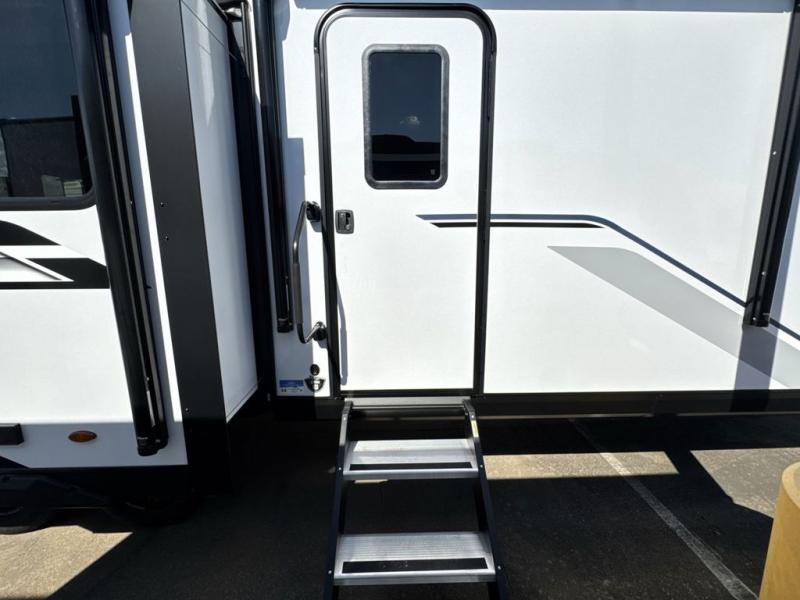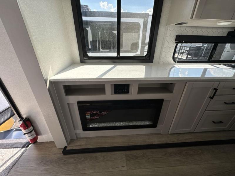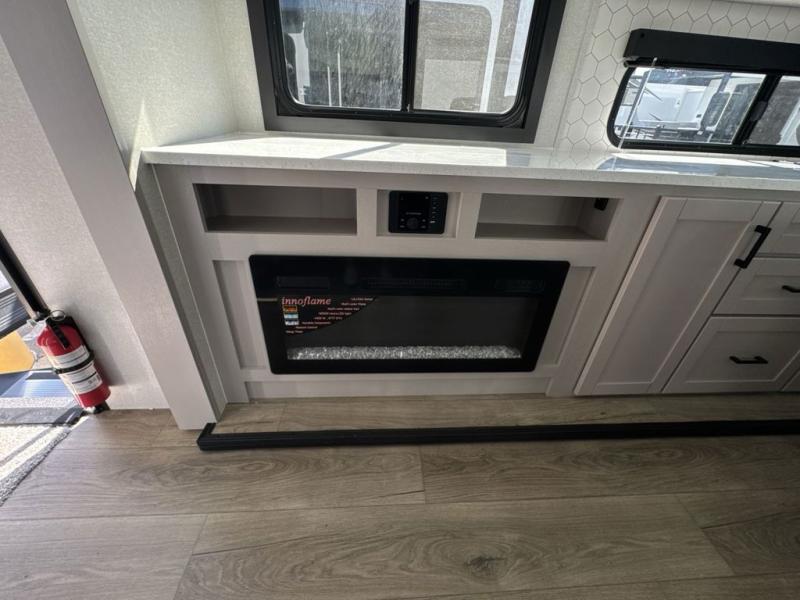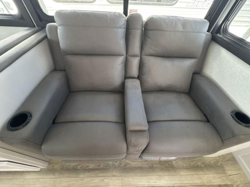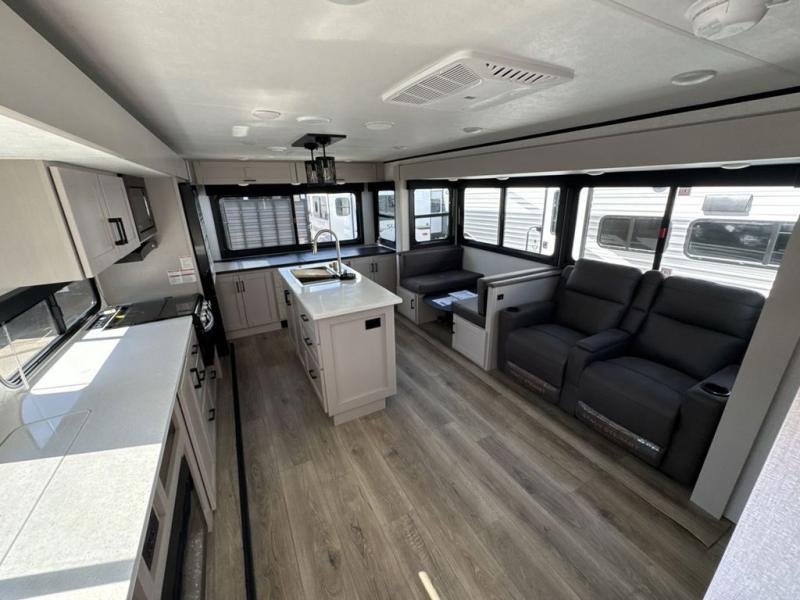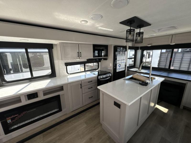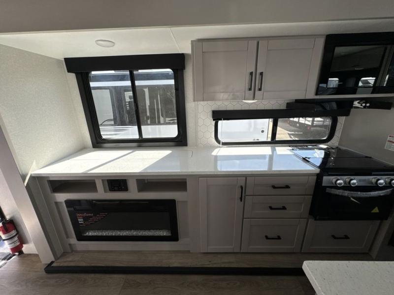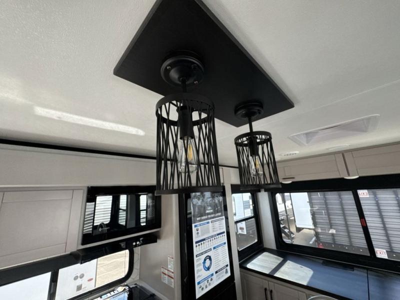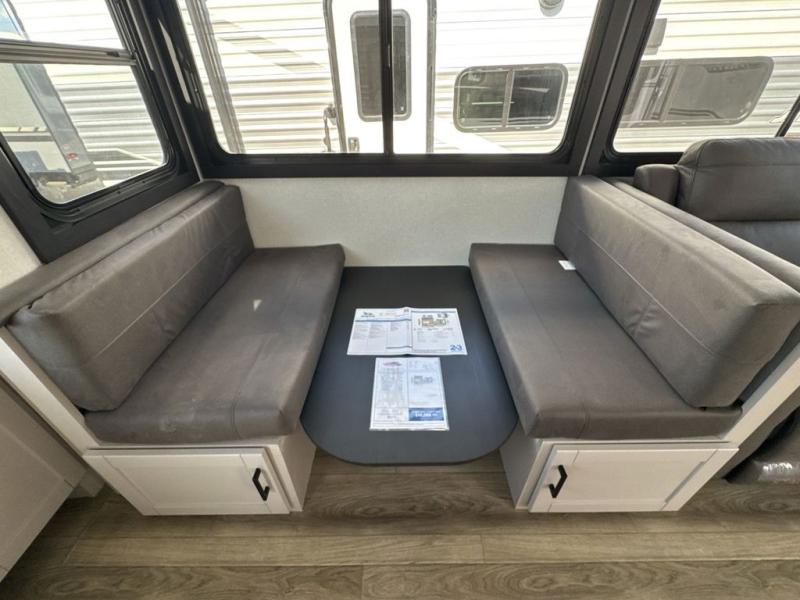 Perfect for weekend trips or extended stays, this travel trailer is the one! You will find a rear desk with an ottoman plus overhead storage if you plan to work while you're away from home. The dual opposing slides in the combined kitchen and living area will create an open floorplan, and the kitchen island will provide the chef of your group with more counter space. There is a tri-fold sofa and booth dinette that double as seating and sleeping space, and the full bath onboard will keep everyone clean. Don't overlook the front private bedroom with a queen bed and plenty of storage space for your belongings!
