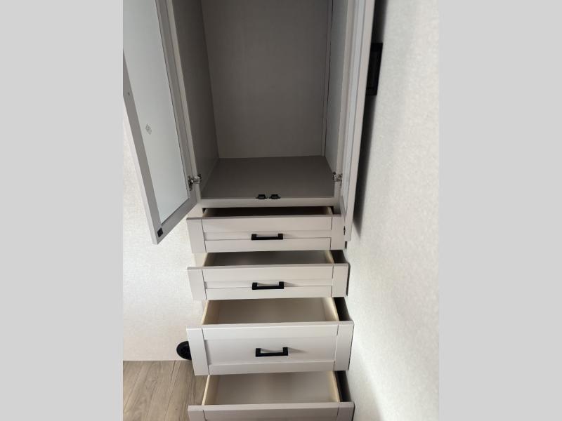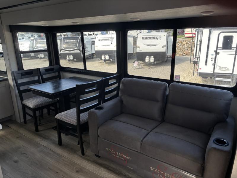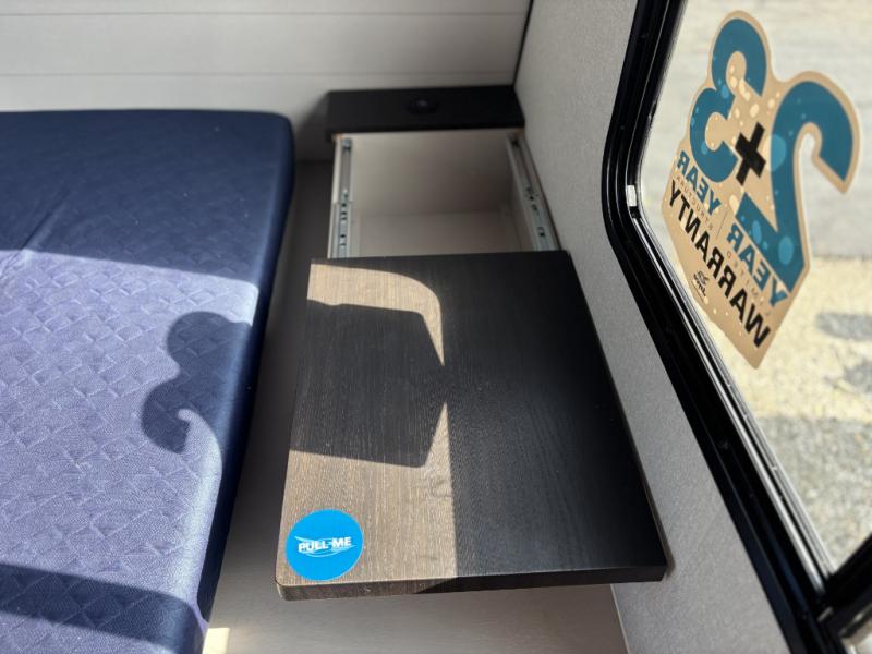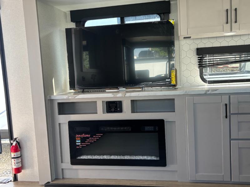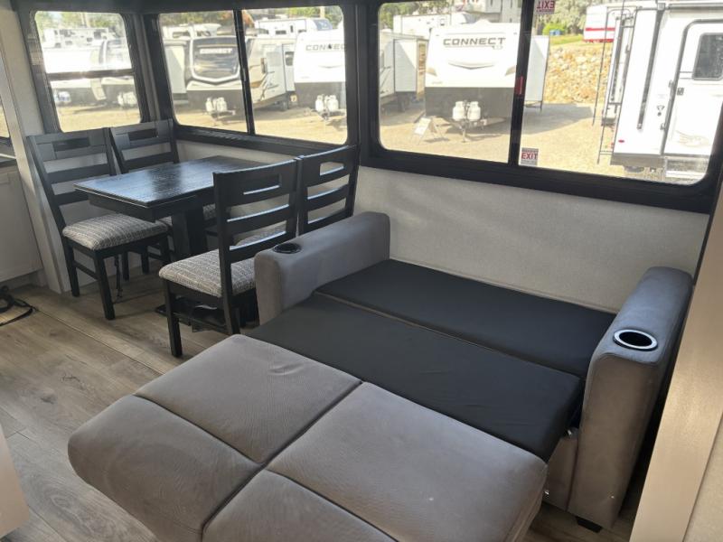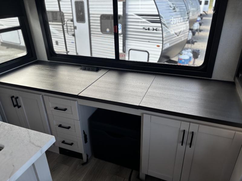 Perfect for weekend trips or extended stays, this travel trailer is the one! You will find a rear desk with an ottoman plus overhead storage if you plan to work while you're away from home. The dual opposing slides in the combined kitchen and living area will create an open floorplan, and the kitchen island will provide the chef of your group with more counter space. There is a tri-fold sofa and booth dinette that double as seating and sleeping space, and the full bath onboard will keep everyone clean. Don't overlook the front private bedroom with a queen bed and plenty of storage space for your belongings!