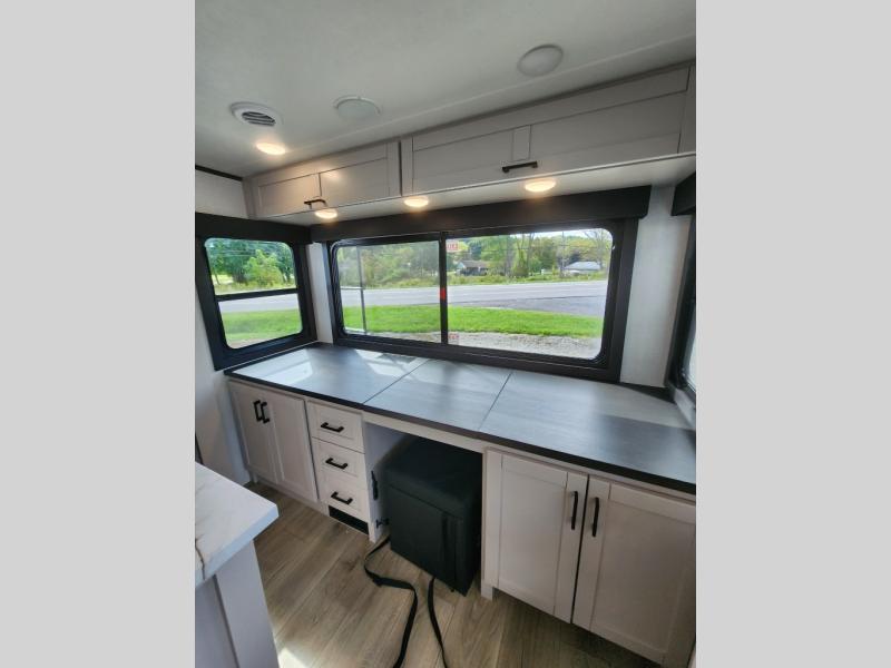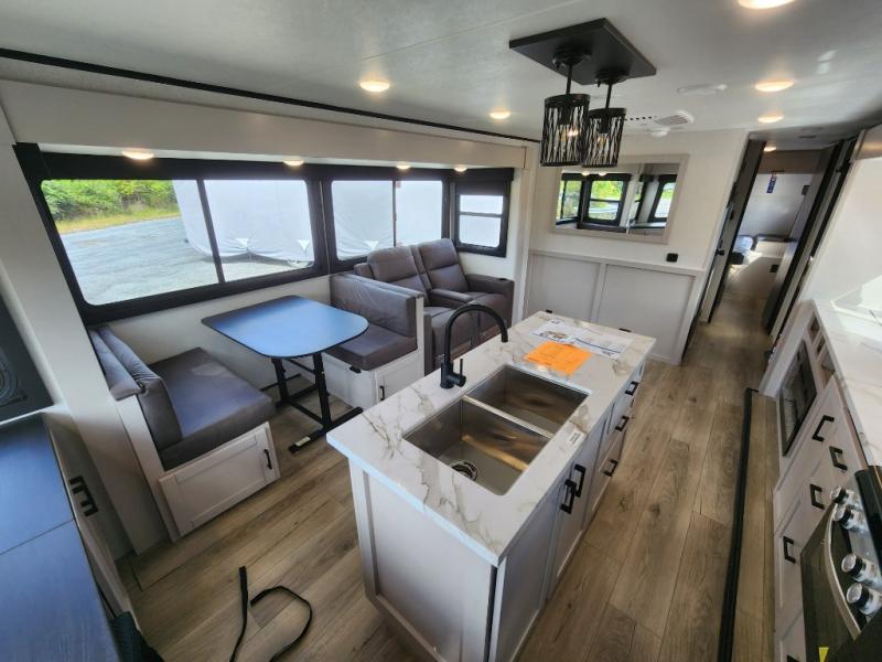 Perfect for weekend trips or extended stays, this travel trailer is the one! You will find a rear desk with an ottoman plus overhead storage if you plan to work while you're away from home. The dual opposing slides in the combined kitchen and living area will create an open floorplan, and the kitchen island will provide the chef of your group with more counter space. There is a tri-fold sofa and booth dinette that double as seating and sleeping space, and the full bath onboard will keep everyone clean. Don't overlook the front private bedroom with a queen bed and plenty of storage space for your belongings!