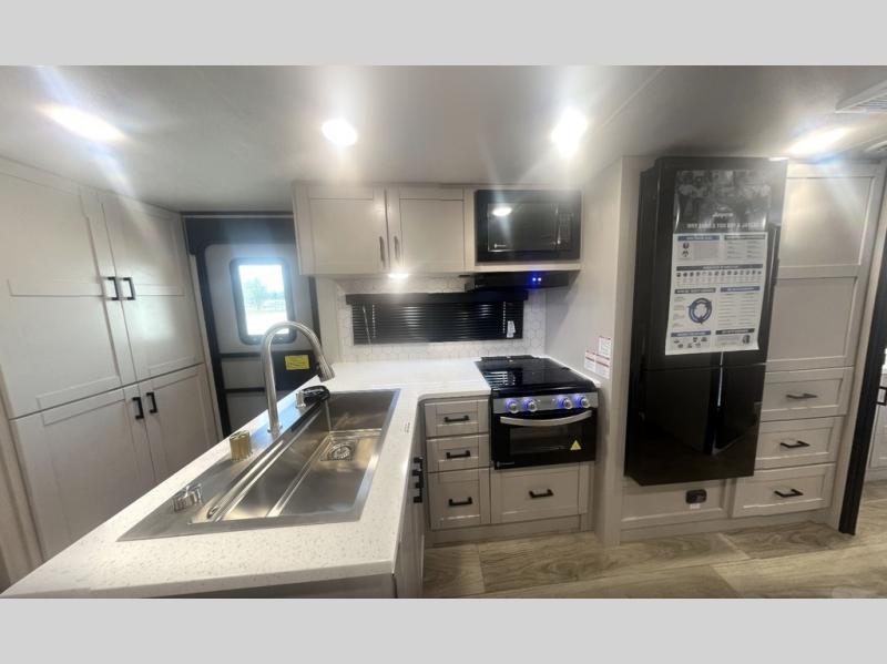 With any Jay Feather travel trailer by Jayco, you will enjoy lightweight towing, convenient exterior amenities, and at-home comforts inside! The Overlander 1 Solar Package included within the Jay Sport Package comes with a 200W solar panel and a 30-amp digital controller so you can enjoy some off-grid camping. There is also a modern graphics package with a dual-colored sidewall, LCI Solid Step fold-down aluminum tread steps on the main entry door, and Climate Shield 0 -100° F tested weather insulation package that will allow you to camp in all sorts of climates. The Customer Value Package will make time outdoors easier than ever with a power tongue jack and a Rock Solid stabilizer system, plus American-made nitro-filled Goodyear tires with self-adjusting electric brakes. More exterior features include a Keyed-Alike locking system, marine grade exterior speakers, a Magnum Truss roof system, and the list goes on! And we haven't even touched on the interior comforts, like the residential style seamless countertops and vinyl flooring throughout, decorative backsplash, handcrafted hardwood door/drawer fronts, and multiple USB charging ports to keep you going!