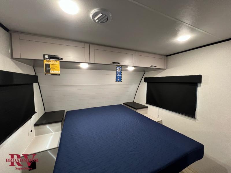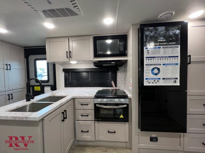 With any Jay Feather travel trailer by Jayco, you will enjoy lightweight towing, convenient exterior amenities, and at-home comforts inside! The Overlander 1 Solar Package included within the Jay Sport Package comes with a 200W solar panel and a 30-amp digital controller so you can enjoy some off-grid camping. There is also a modern graphics package with a dual-colored sidewall, LCI Solid Step fold-down aluminum tread steps on the main entry door, and Climate Shield 0 -100° F tested weather insulation package that will allow you to camp in all sorts of climates. The Customer Value Package will make time outdoors easier than ever with a power tongue jack and a Rock Solid stabilizer system, plus American-made nitro-filled Goodyear tires with self-adjusting electric brakes. More exterior features include a Keyed-Alike locking system, marine grade exterior speakers, a Magnum Truss roof system, and the list goes on! And we haven't even touched on the interior comforts, like the residential style seamless countertops and vinyl flooring throughout, decorative backsplash, handcrafted hardwood door/drawer fronts, and multiple USB charging ports to keep you going!