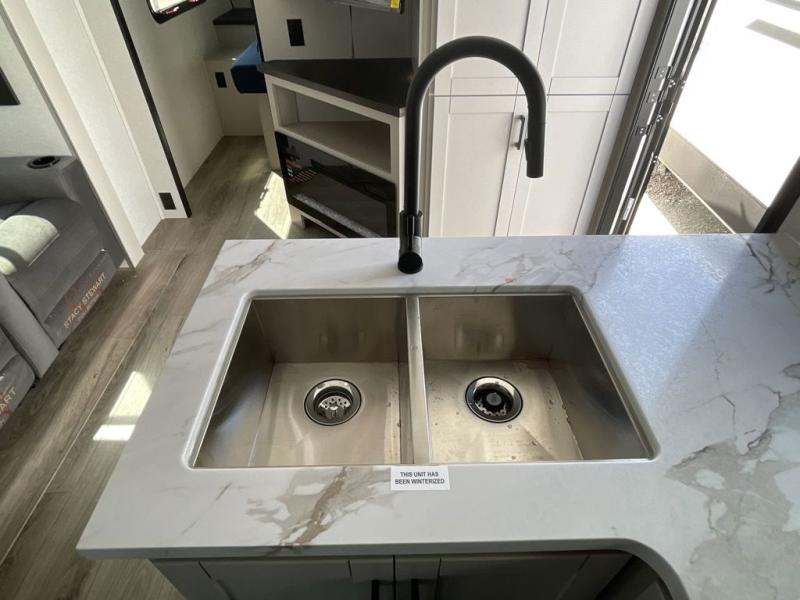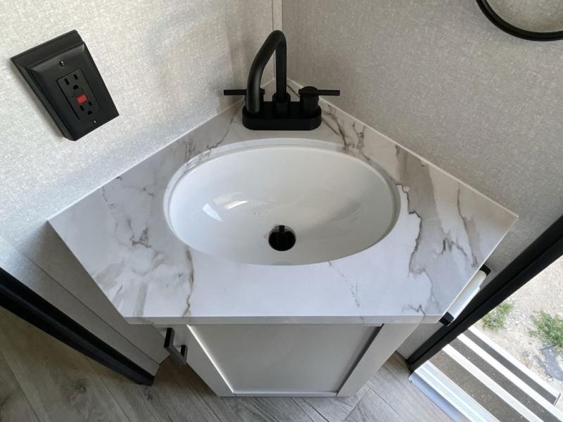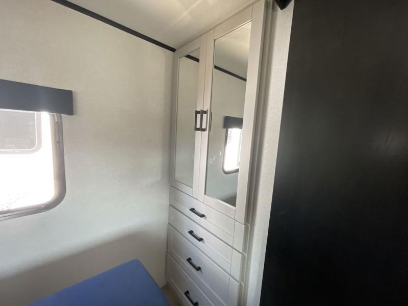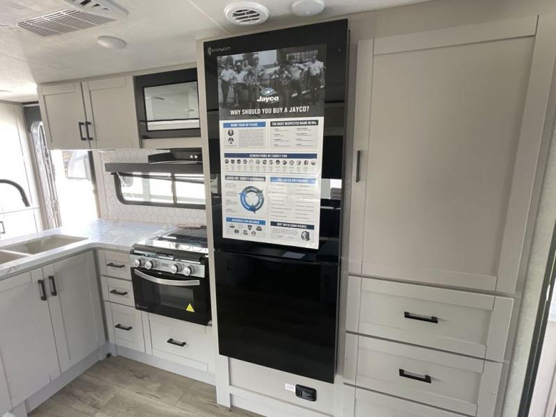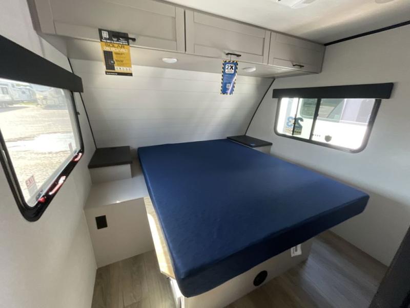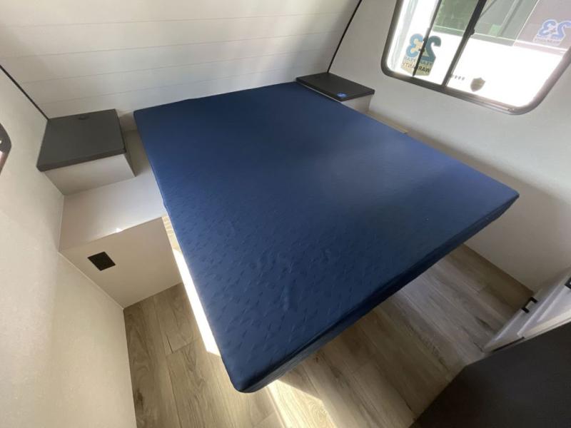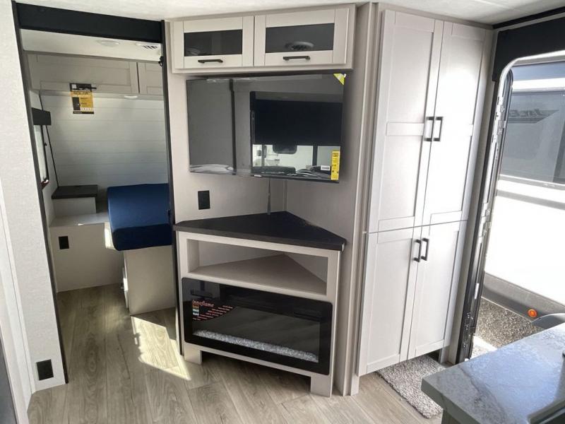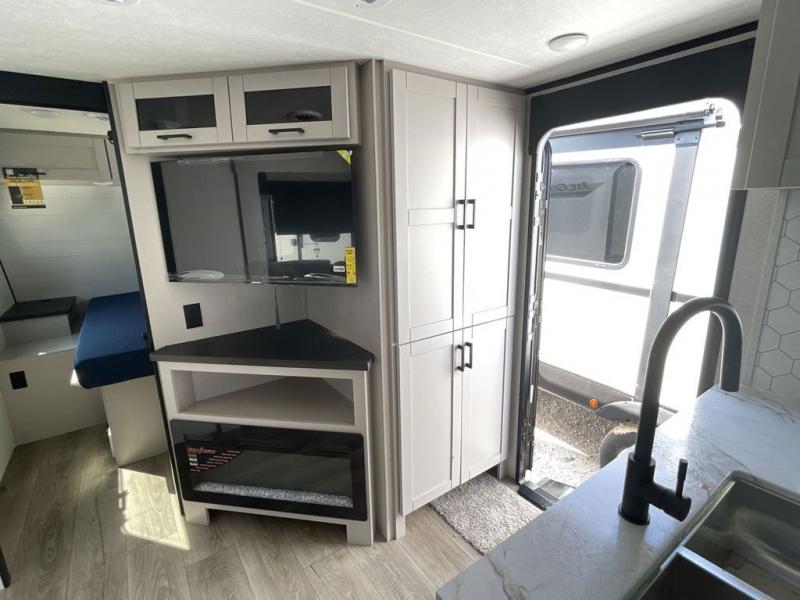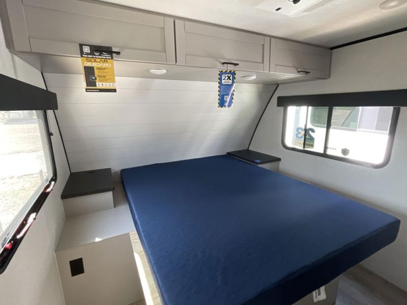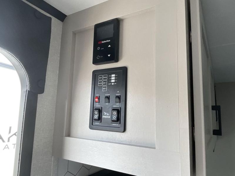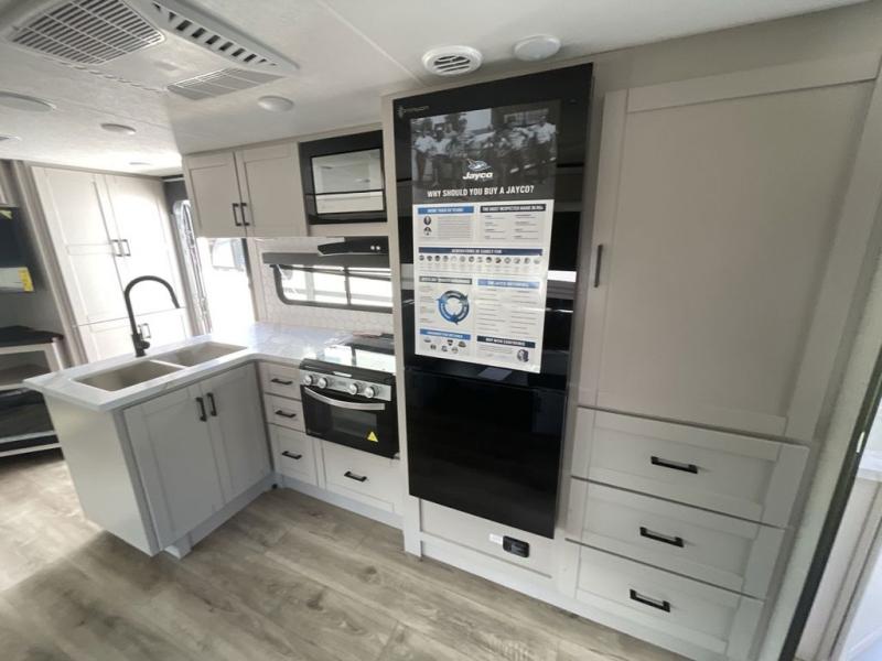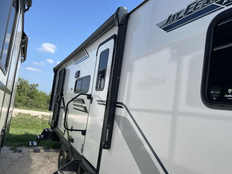 With any Jay Feather travel trailer by Jayco, you will enjoy lightweight towing, convenient exterior amenities, and at-home comforts inside! The Overlander 1 Solar Package included within the Jay Sport Package comes with a 200W solar panel and a 30-amp digital controller so you can enjoy some off-grid camping. There is also a modern graphics package with a dual-colored sidewall, LCI Solid Step fold-down aluminum tread steps on the main entry door, and Climate Shield 0 -100° F tested weather insulation package that will allow you to camp in all sorts of climates. The Customer Value Package will make time outdoors easier than ever with a power tongue jack and a Rock Solid stabilizer system, plus American-made nitro-filled Goodyear tires with self-adjusting electric brakes. More exterior features include a Keyed-Alike locking system, marine grade exterior speakers, a Magnum Truss roof system, and the list goes on! And we haven't even touched on the interior comforts, like the residential style seamless countertops and vinyl flooring throughout, decorative backsplash, handcrafted hardwood door/drawer fronts, and multiple USB charging ports to keep you going!