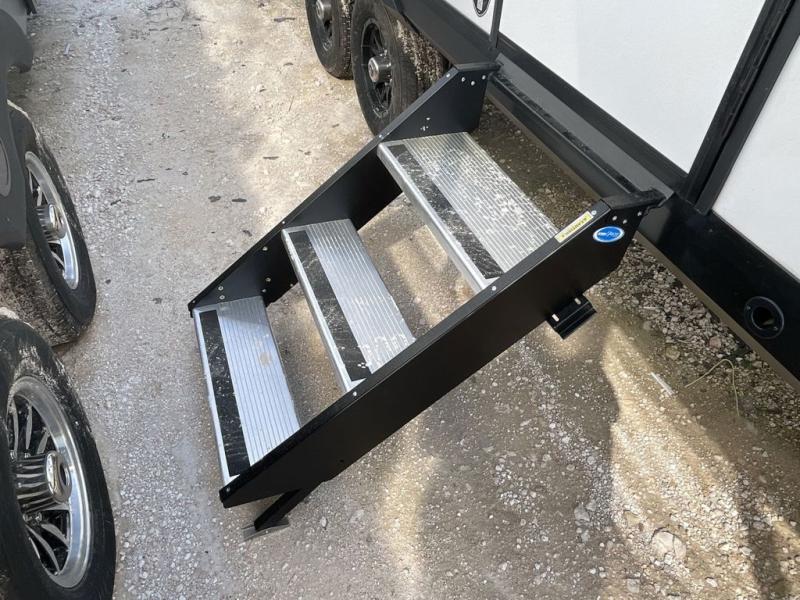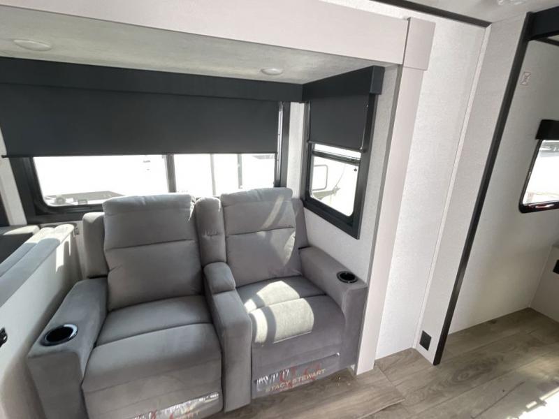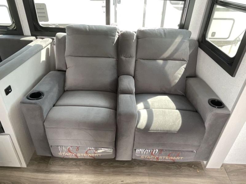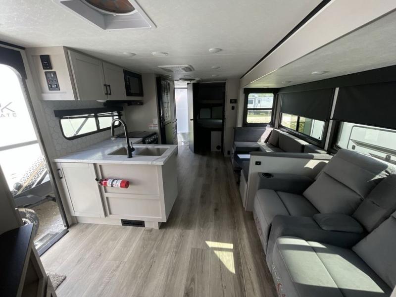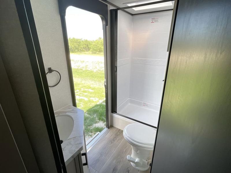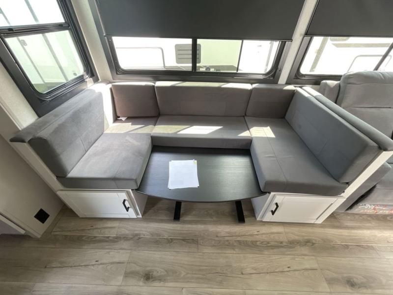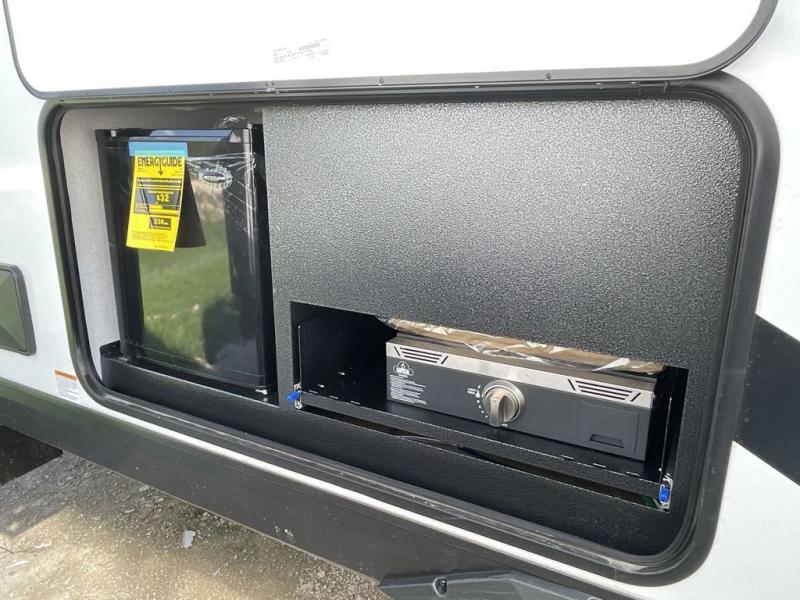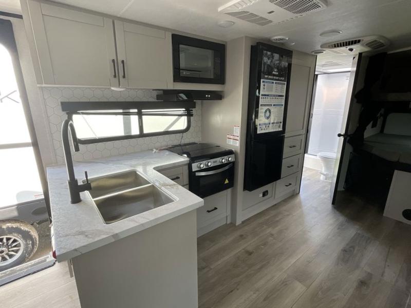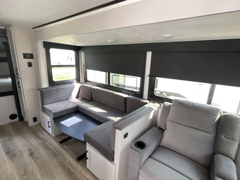 Your whole crew can join along on camping trips with this travel trailer that can sleep ten each night! Not only are there double-size bunks, but also a U-shaped dinette, tri-fold sofa, plus a queen bed in the front bedroom! There is also pass-thru storage under the bed so luggage, board games, and blankets can be kept out of the way. The chef of your group can cook indoors on the three burner cooktop or at the outside kitchen on the pull-out griddle. This model also includes a full bath with one of the dual entry doors for added convenience!