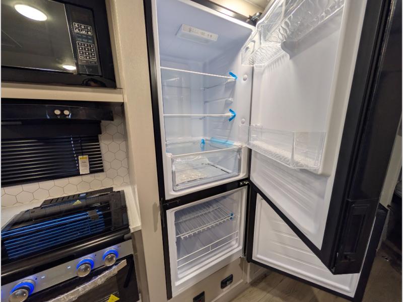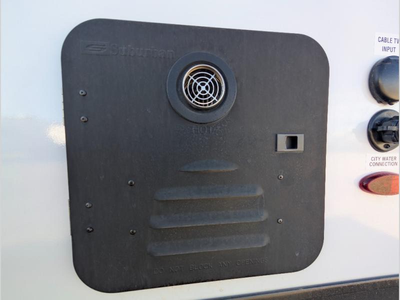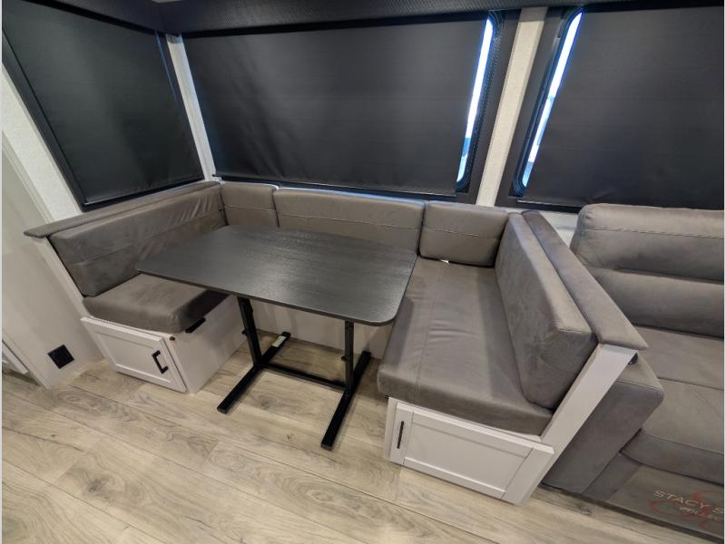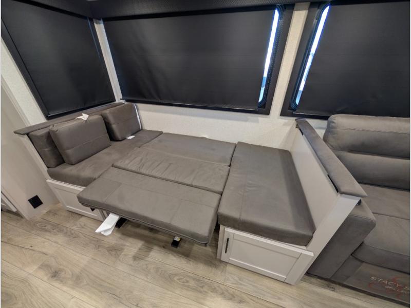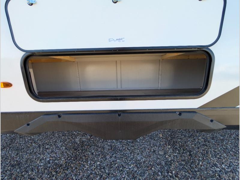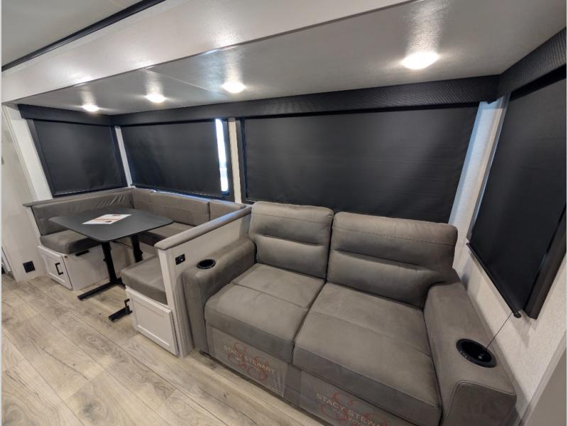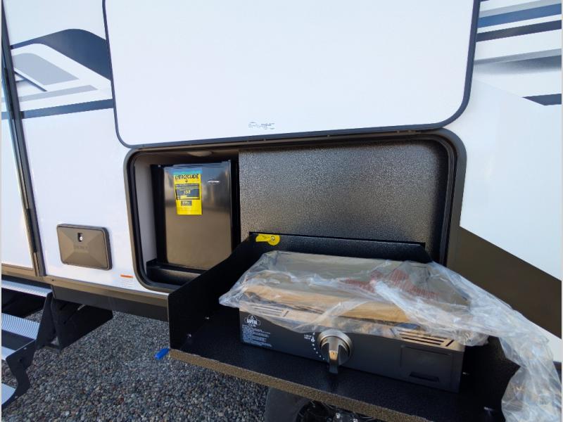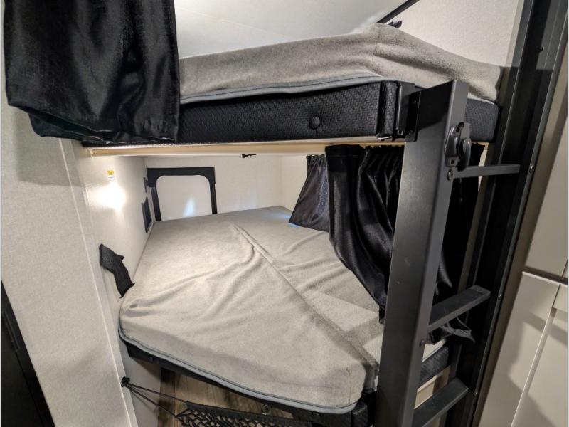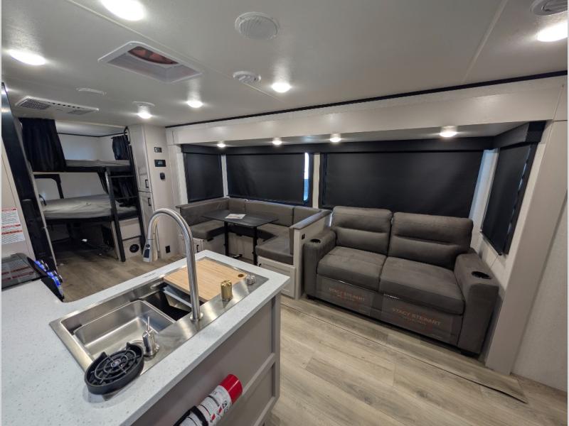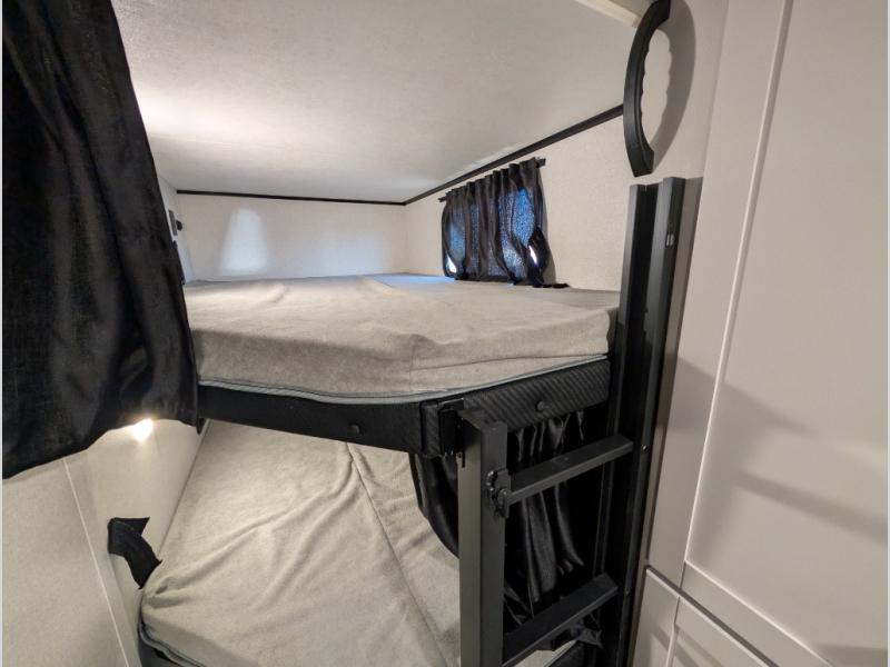Your whole crew can join along on camping trips with this travel trailer that can sleep ten each night! Not only are there double-size bunks, but also a U-shaped dinette, tri-fold sofa, plus a queen bed in the front bedroom! There is also pass-thru storage under the bed so luggage, board games, and blankets can be kept out of the way. The chef of your group can cook indoors on the three burner cooktop or at the outside kitchen on the pull-out griddle. This model also includes a full bath with one of the dual entry doors for added convenience!