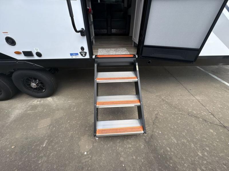 Your whole crew can join along on camping trips with this travel trailer that can sleep ten each night! Not only are there double-size bunks, but also a U-shaped dinette, tri-fold sofa, plus a queen bed in the front bedroom! There is also pass-thru storage under the bed so luggage, board games, and blankets can be kept out of the way. The chef of your group can cook indoors on the three burner cooktop or at the outside kitchen on the pull-out griddle. This model also includes a full bath with one of the dual entry doors for added convenience!