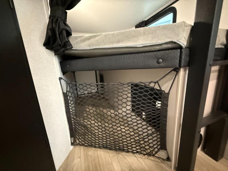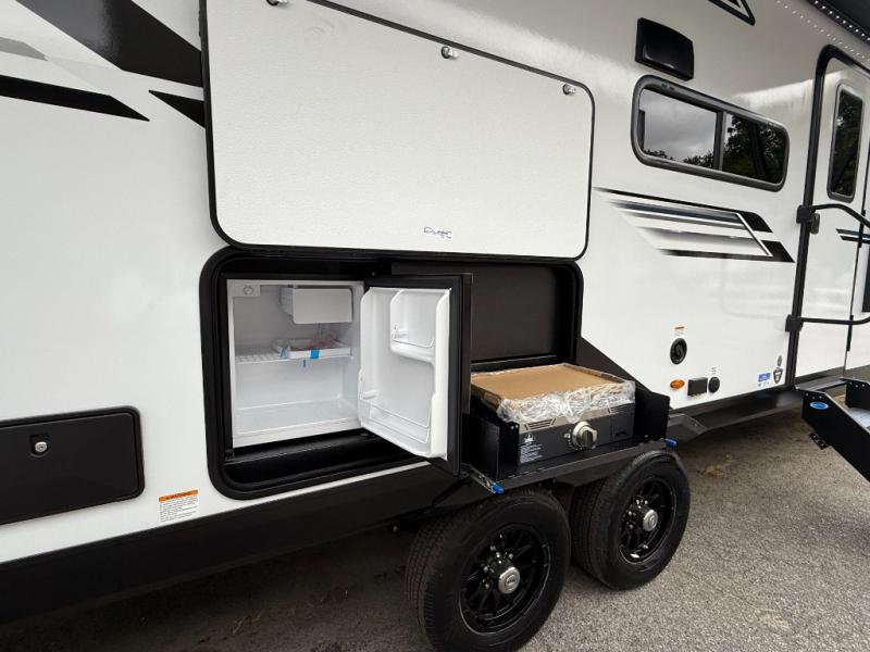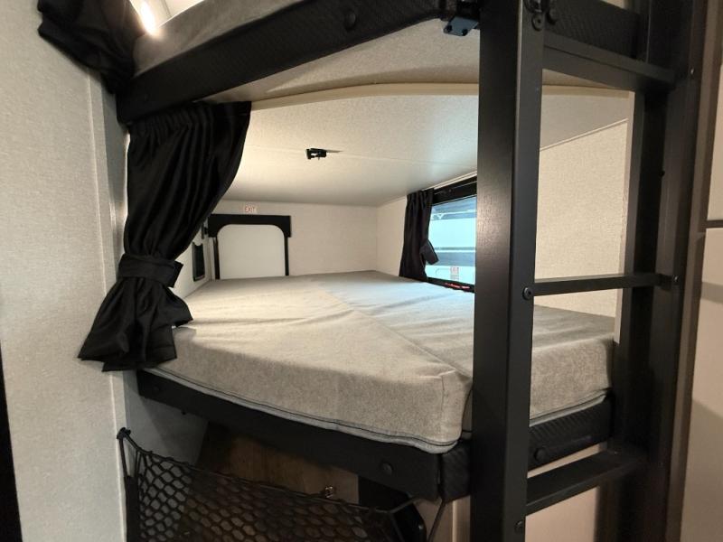 Your whole crew can join along on camping trips with this travel trailer that can sleep ten each night! Not only are there double-size bunks, but also a U-shaped dinette, tri-fold sofa, plus a queen bed in the front bedroom! There is also pass-thru storage under the bed so luggage, board games, and blankets can be kept out of the way. The chef of your group can cook indoors on the three burner cooktop or at the outside kitchen on the pull-out griddle. This model also includes a full bath with one of the dual entry doors for added convenience!