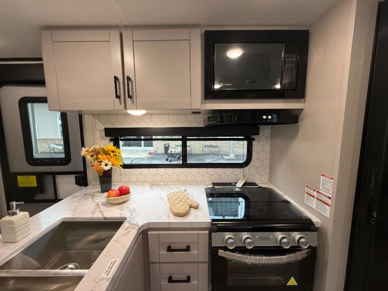 With any Jay Feather travel trailer by Jayco, you will enjoy lightweight towing, convenient exterior amenities, and at-home comforts inside! The Overlander 1 Solar Package included within the Jay Sport Package comes with a 200W solar panel and a 30-amp digital controller so you can enjoy some off-grid camping. There is also a modern graphics package with a dual-colored sidewall, LCI Solid Step fold-down aluminum tread steps on the main entry door, and Climate Shield 0 -100° F tested weather insulation package that will allow you to camp in all sorts of climates. The Customer Value Package will make time outdoors easier than ever with a power tongue jack and a Rock Solid stabilizer system, plus American-made nitro-filled Goodyear tires with self-adjusting electric brakes. More exterior features include a Keyed-Alike locking system, marine grade exterior speakers, a Magnum Truss roof system, and the list goes on! And we haven't even touched on the interior comforts, like the residential style seamless countertops and vinyl flooring throughout, decorative backsplash, handcrafted hardwood door/drawer fronts, and multiple USB charging ports to keep you going!