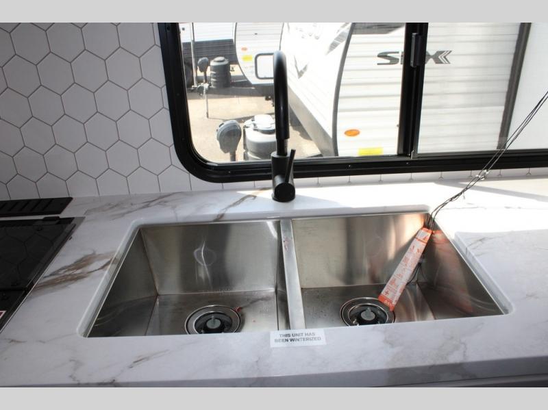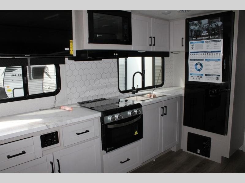 With any Jay Feather travel trailer by Jayco, you will enjoy lightweight towing, convenient exterior amenities, and at-home comforts inside! The Overlander 1 Solar Package included within the Jay Sport Package comes with a 200W solar panel and a 30-amp digital controller so you can enjoy some off-grid camping. There is also a modern graphics package with a dual-colored sidewall, LCI Solid Step fold-down aluminum tread steps on the main entry door, and Climate Shield 0 -100° F tested weather insulation package that will allow you to camp in all sorts of climates. The Customer Value Package will make time outdoors easier than ever with a power tongue jack and a Rock Solid stabilizer system, plus American-made nitro-filled Goodyear tires with self-adjusting electric brakes. More exterior features include a Keyed-Alike locking system, marine grade exterior speakers, a Magnum Truss roof system, and the list goes on! And we haven't even touched on the interior comforts, like the residential style seamless countertops and vinyl flooring throughout, decorative backsplash, handcrafted hardwood door/drawer fronts, and multiple USB charging ports to keep you going!