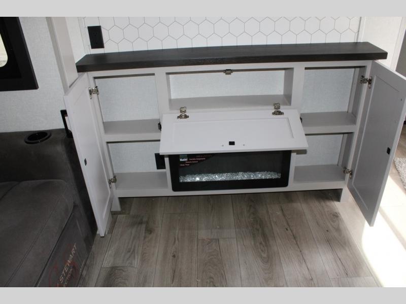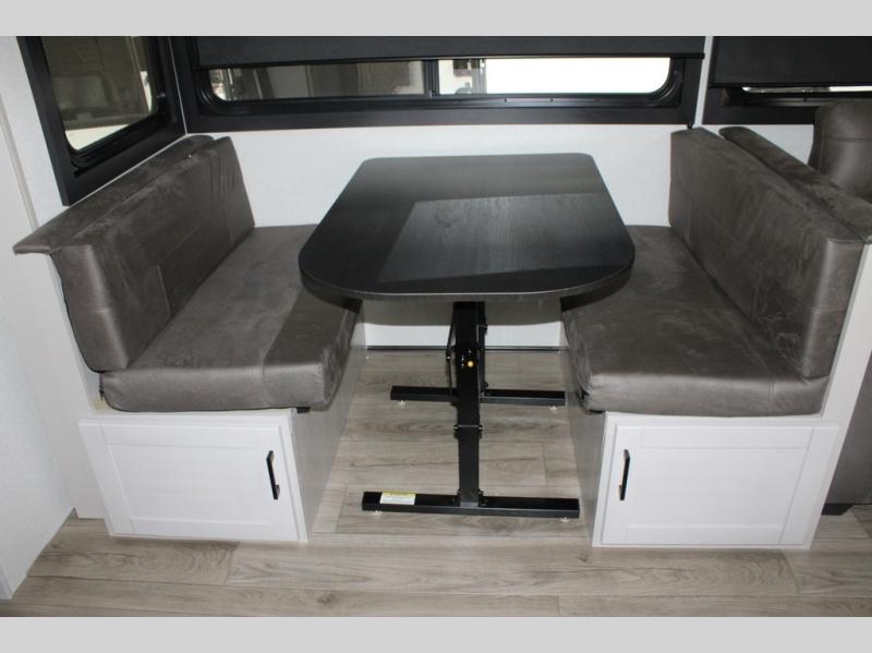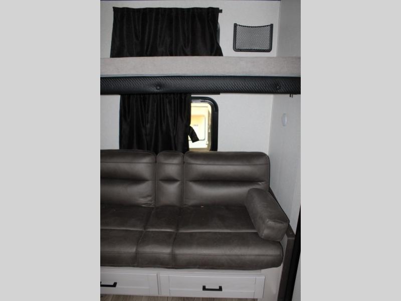 If you've been searching for a travel trailer that will fit your whole gang, this is the one! Because there is a rear private bunkhouse with three bunks and a jackknife sofa, your guests or kids will have their own space each night. There is also an exterior cargo door so you can pack camp gear directly into the bunkhouse for convenience! The combined living area and kitchen is open and spacious thanks to the large slide out, and here you'll enjoy the tri-fold sofa and booth dinette. There is also a pantry plus additional storage, an entertainment center with an LED Smart TV, and a full bath where you can clean up after lake swimming. The owners will love the front private bedroom with a queen bed, a wardrobe, dual nightstands, and overhead storage so everything has its place!