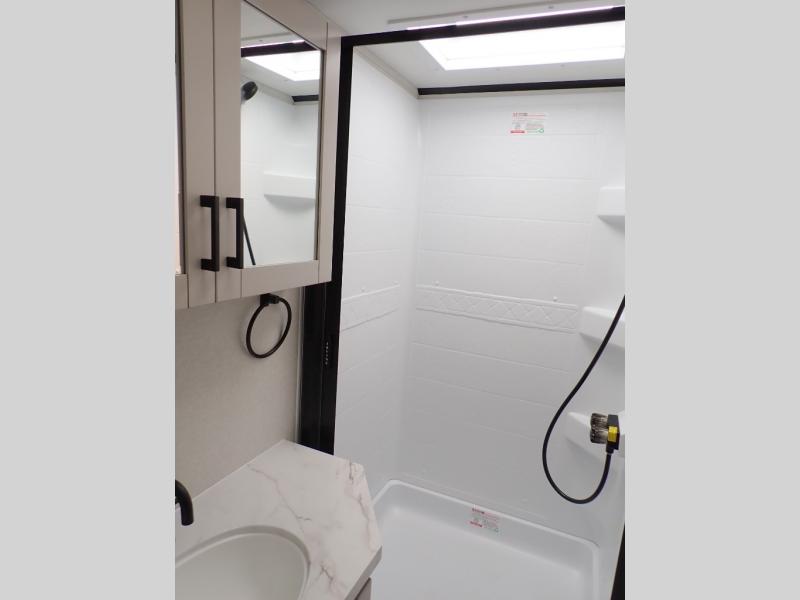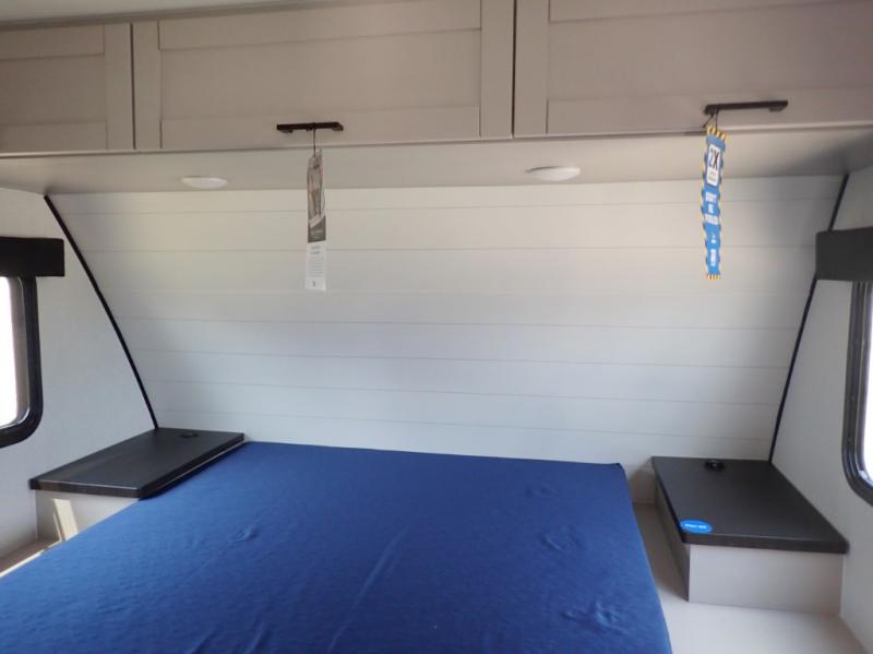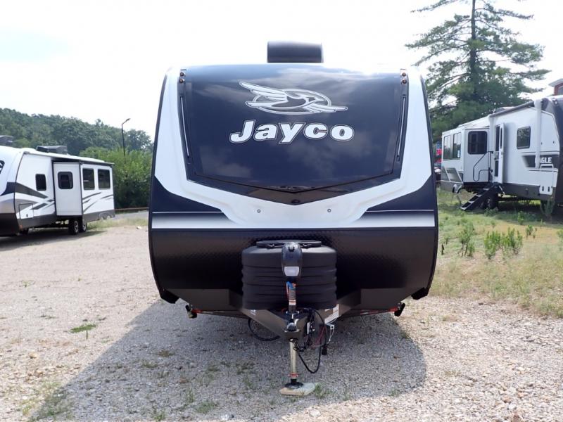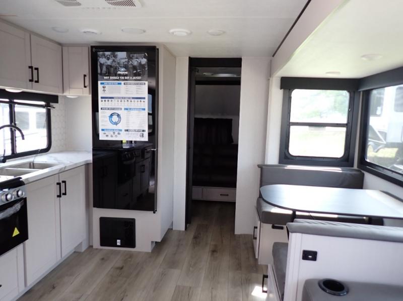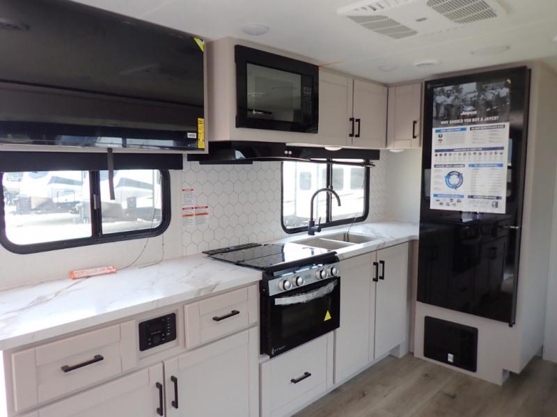 With any Jay Feather travel trailer by Jayco, you will enjoy lightweight towing, convenient exterior amenities, and at-home comforts inside! The Overlander 1 Solar Package included within the Jay Sport Package comes with a 200W solar panel and a 30-amp digital controller so you can enjoy some off-grid camping. There is also a modern graphics package with a dual-colored sidewall, LCI Solid Step fold-down aluminum tread steps on the main entry door, and Climate Shield 0 -100° F tested weather insulation package that will allow you to camp in all sorts of climates. The Customer Value Package will make time outdoors easier than ever with a power tongue jack and a Rock Solid stabilizer system, plus American-made nitro-filled Goodyear tires with self-adjusting electric brakes. More exterior features include a Keyed-Alike locking system, marine grade exterior speakers, a Magnum Truss roof system, and the list goes on! And we haven't even touched on the interior comforts, like the residential style seamless countertops and vinyl flooring throughout, decorative backsplash, handcrafted hardwood door/drawer fronts, and multiple USB charging ports to keep you going!