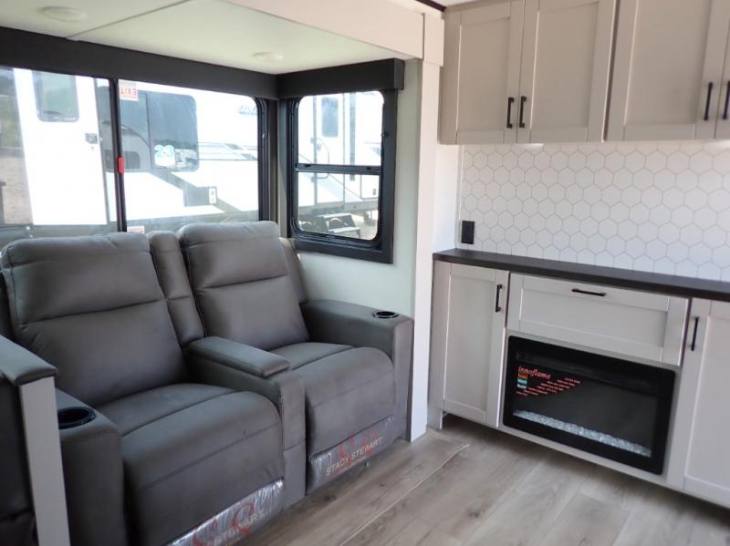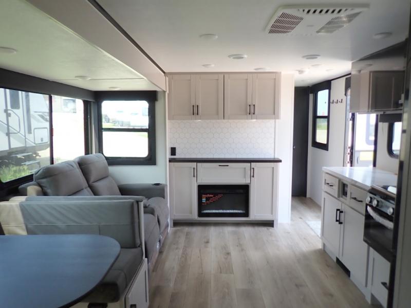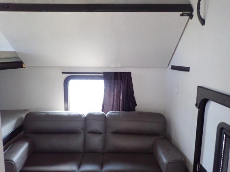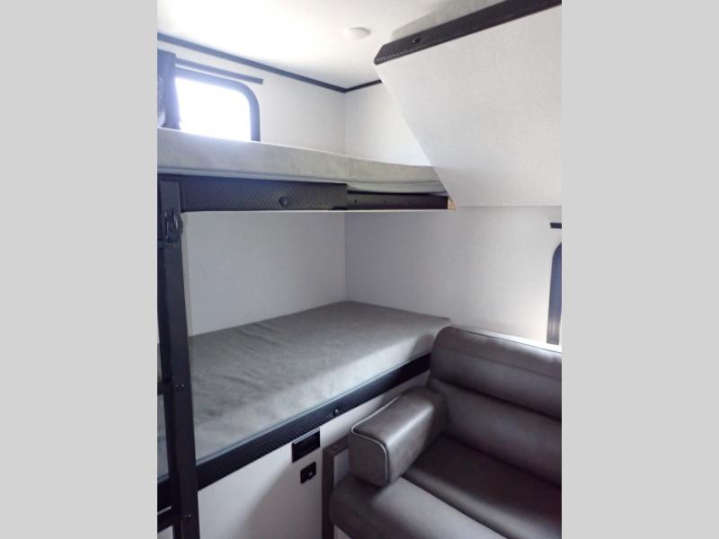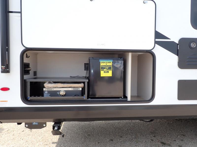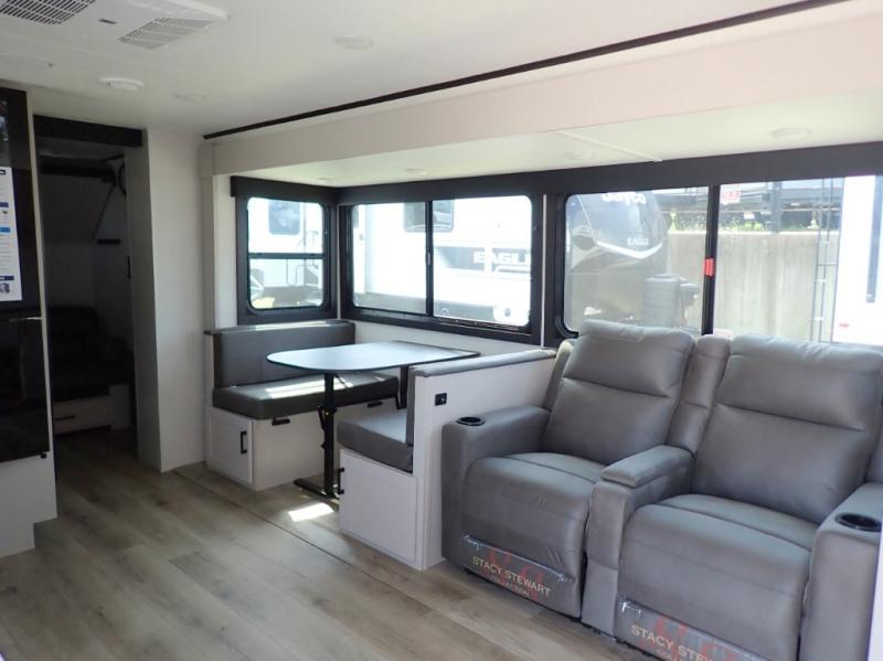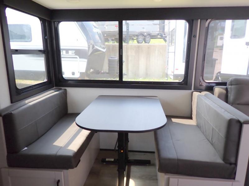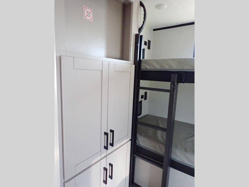 If you've been searching for a travel trailer that will fit your whole gang, this is the one! Because there is a rear private bunkhouse with three bunks and a jackknife sofa, your guests or kids will have their own space each night. There is also an exterior cargo door so you can pack camp gear directly into the bunkhouse for convenience! The combined living area and kitchen is open and spacious thanks to the large slide out, and here you'll enjoy the tri-fold sofa and booth dinette. There is also a pantry plus additional storage, an entertainment center with an LED Smart TV, and a full bath where you can clean up after lake swimming. The owners will love the front private bedroom with a queen bed, a wardrobe, dual nightstands, and overhead storage so everything has its place!