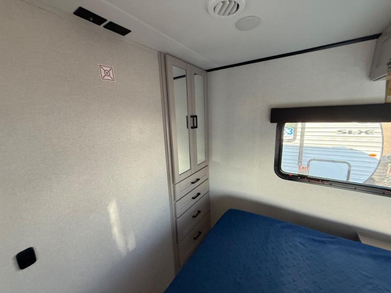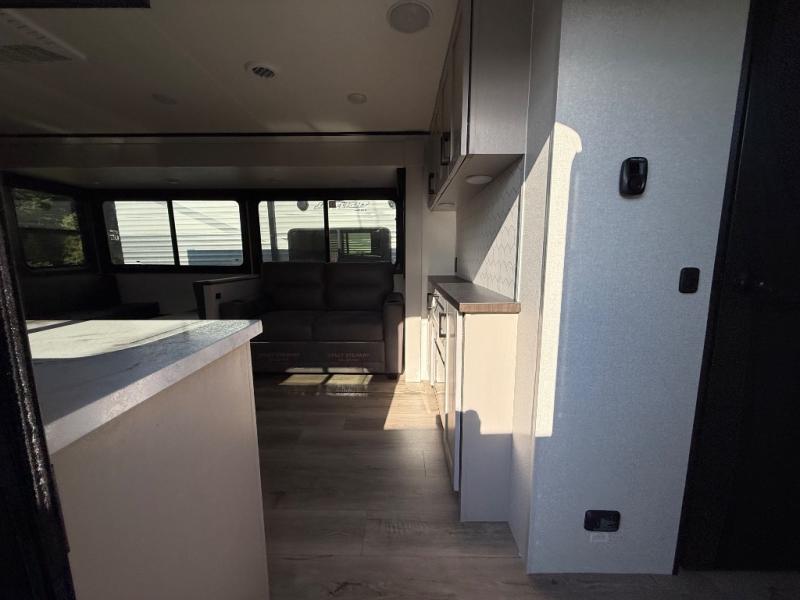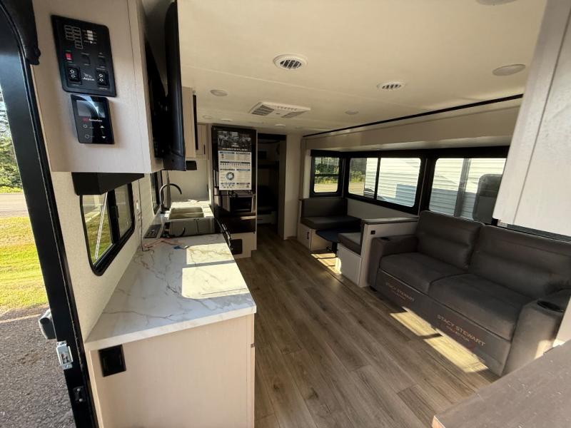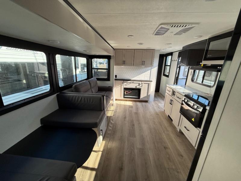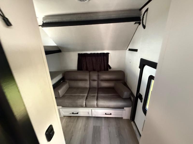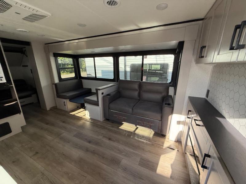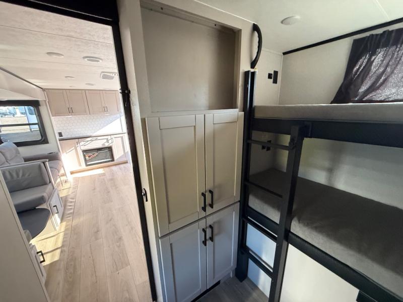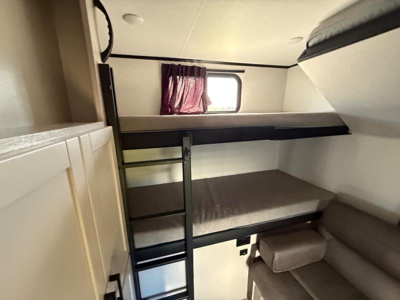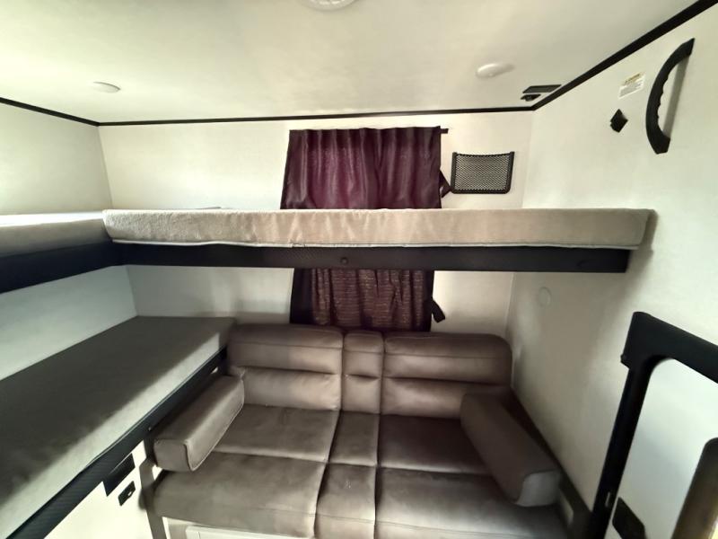 If you've been searching for a travel trailer that will fit your whole gang, this is the one! Because there is a rear private bunkhouse with three bunks and a jackknife sofa, your guests or kids will have their own space each night. There is also an exterior cargo door so you can pack camp gear directly into the bunkhouse for convenience! The combined living area and kitchen is open and spacious thanks to the large slide out, and here you'll enjoy the tri-fold sofa and booth dinette. There is also a pantry plus additional storage, an entertainment center with an LED Smart TV, and a full bath where you can clean up after lake swimming. The owners will love the front private bedroom with a queen bed, a wardrobe, dual nightstands, and overhead storage so everything has its place!