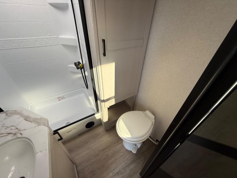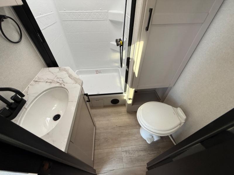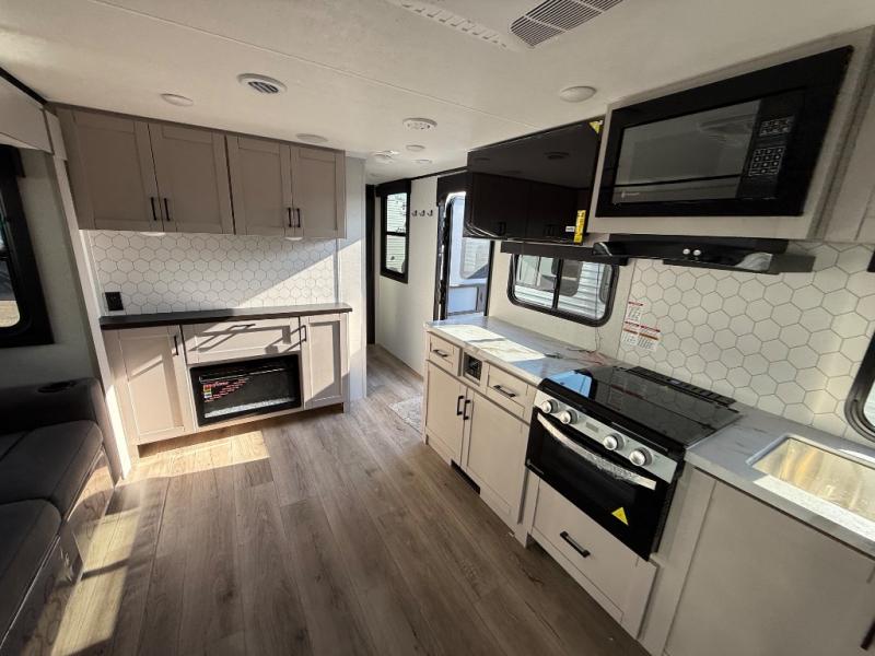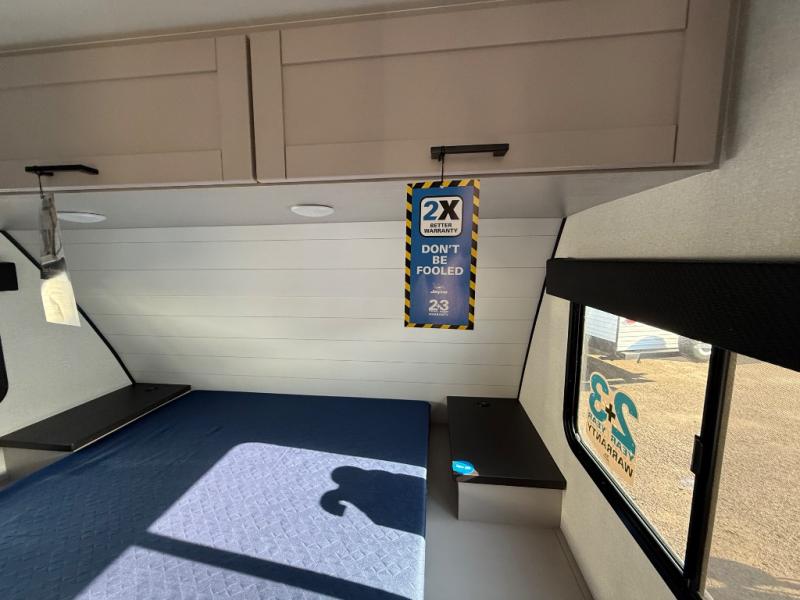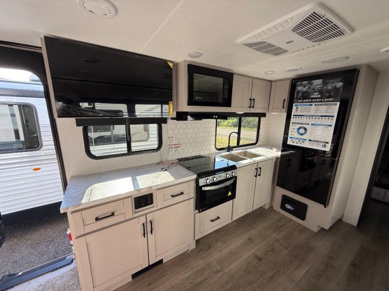 With any Jay Feather travel trailer by Jayco, you will enjoy lightweight towing, convenient exterior amenities, and at-home comforts inside! The Overlander 1 Solar Package included within the Jay Sport Package comes with a 200W solar panel and a 30-amp digital controller so you can enjoy some off-grid camping. There is also a modern graphics package with a dual-colored sidewall, LCI Solid Step fold-down aluminum tread steps on the main entry door, and Climate Shield 0 -100° F tested weather insulation package that will allow you to camp in all sorts of climates. The Customer Value Package will make time outdoors easier than ever with a power tongue jack and a Rock Solid stabilizer system, plus American-made nitro-filled Goodyear tires with self-adjusting electric brakes. More exterior features include a Keyed-Alike locking system, marine grade exterior speakers, a Magnum Truss roof system, and the list goes on! And we haven't even touched on the interior comforts, like the residential style seamless countertops and vinyl flooring throughout, decorative backsplash, handcrafted hardwood door/drawer fronts, and multiple USB charging ports to keep you going!