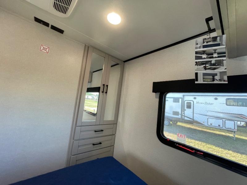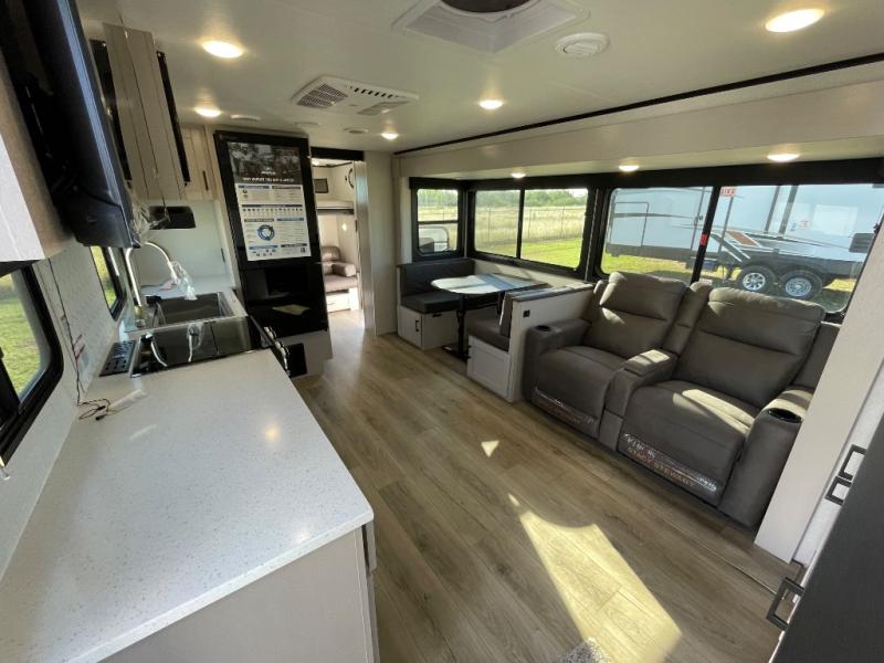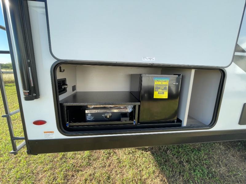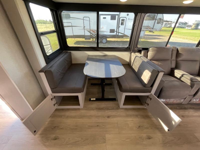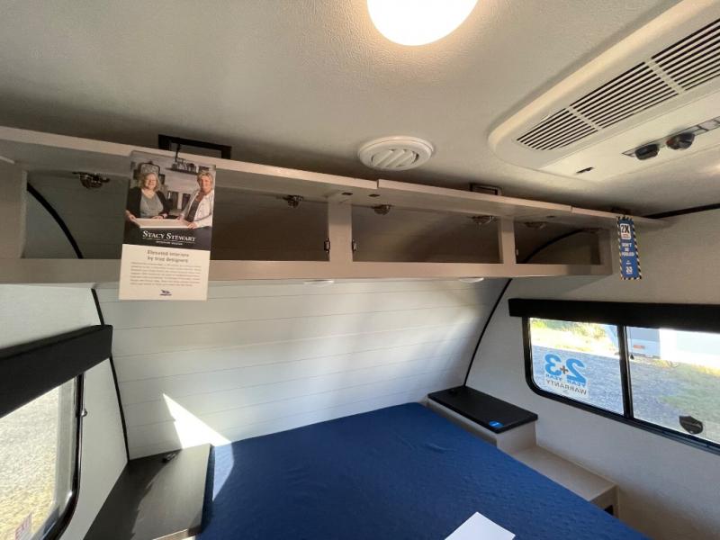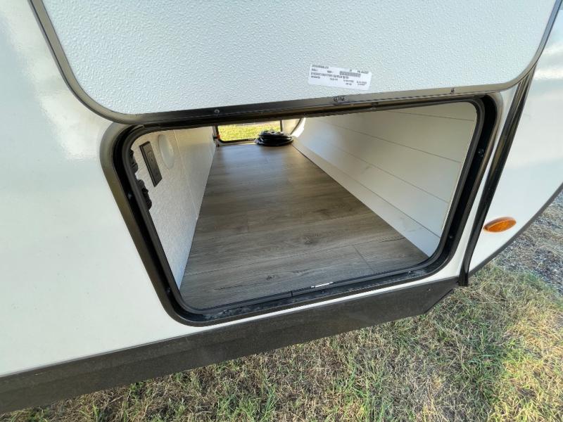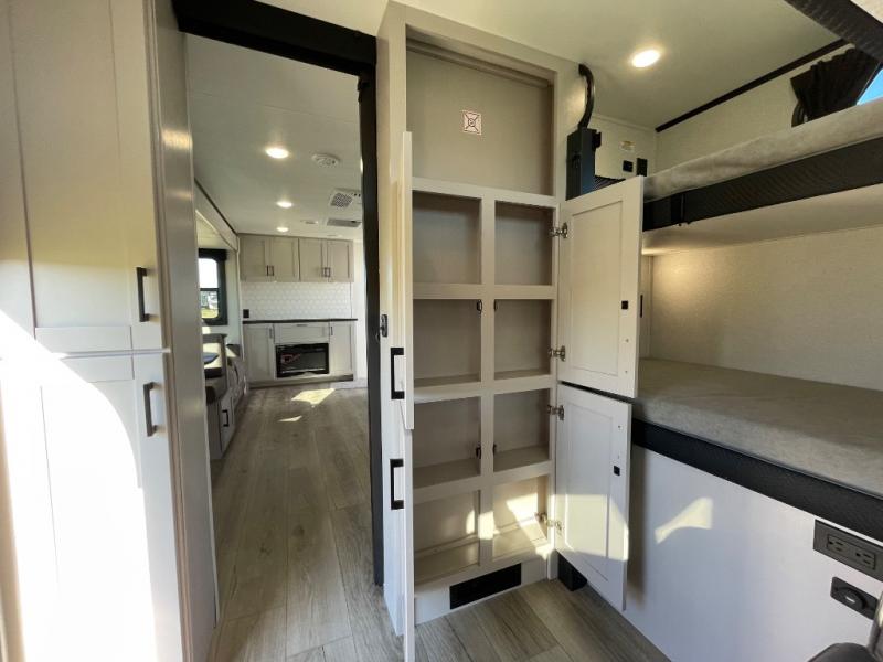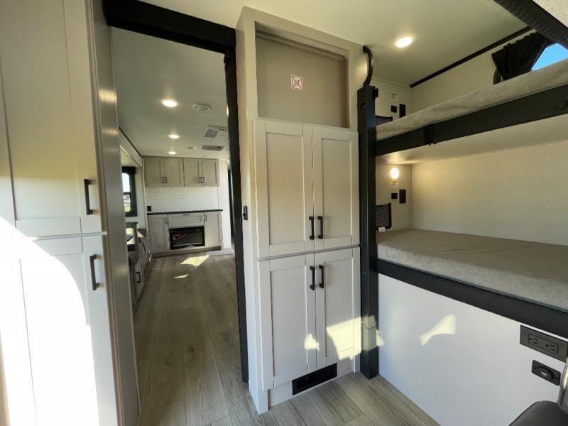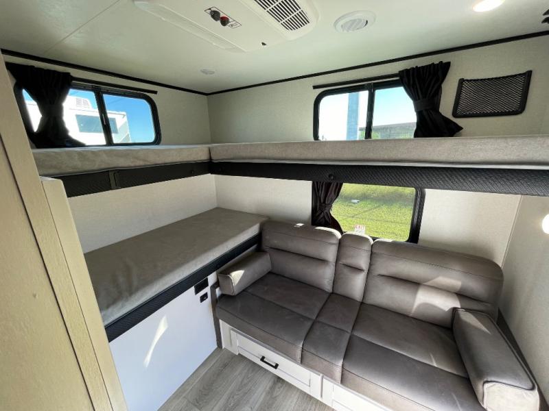 If you've been searching for a travel trailer that will fit your whole gang, this is the one! Because there is a rear private bunkhouse with three bunks and a jackknife sofa, your guests or kids will have their own space each night. There is also an exterior cargo door so you can pack camp gear directly into the bunkhouse for convenience! The combined living area and kitchen is open and spacious thanks to the large slide out, and here you'll enjoy the tri-fold sofa and booth dinette. There is also a pantry plus additional storage, an entertainment center with an LED Smart TV, and a full bath where you can clean up after lake swimming. The owners will love the front private bedroom with a queen bed, a wardrobe, dual nightstands, and overhead storage so everything has its place!