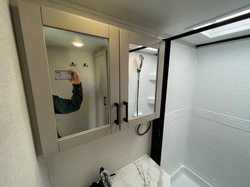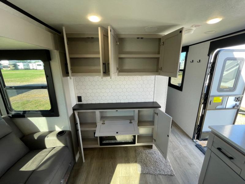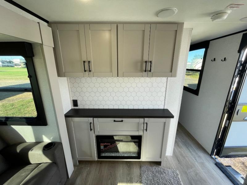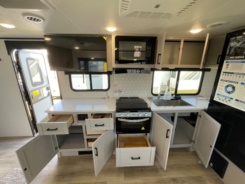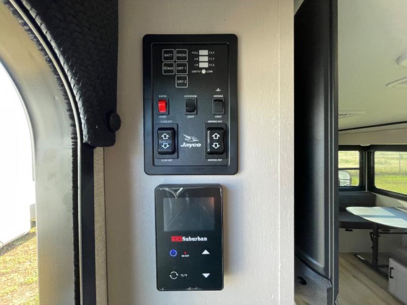 With any Jay Feather travel trailer by Jayco, you will enjoy lightweight towing, convenient exterior amenities, and at-home comforts inside! The Overlander 1 Solar Package included within the Jay Sport Package comes with a 200W solar panel and a 30-amp digital controller so you can enjoy some off-grid camping. There is also a modern graphics package with a dual-colored sidewall, LCI Solid Step fold-down aluminum tread steps on the main entry door, and Climate Shield 0 -100° F tested weather insulation package that will allow you to camp in all sorts of climates. The Customer Value Package will make time outdoors easier than ever with a power tongue jack and a Rock Solid stabilizer system, plus American-made nitro-filled Goodyear tires with self-adjusting electric brakes. More exterior features include a Keyed-Alike locking system, marine grade exterior speakers, a Magnum Truss roof system, and the list goes on! And we haven't even touched on the interior comforts, like the residential style seamless countertops and vinyl flooring throughout, decorative backsplash, handcrafted hardwood door/drawer fronts, and multiple USB charging ports to keep you going!