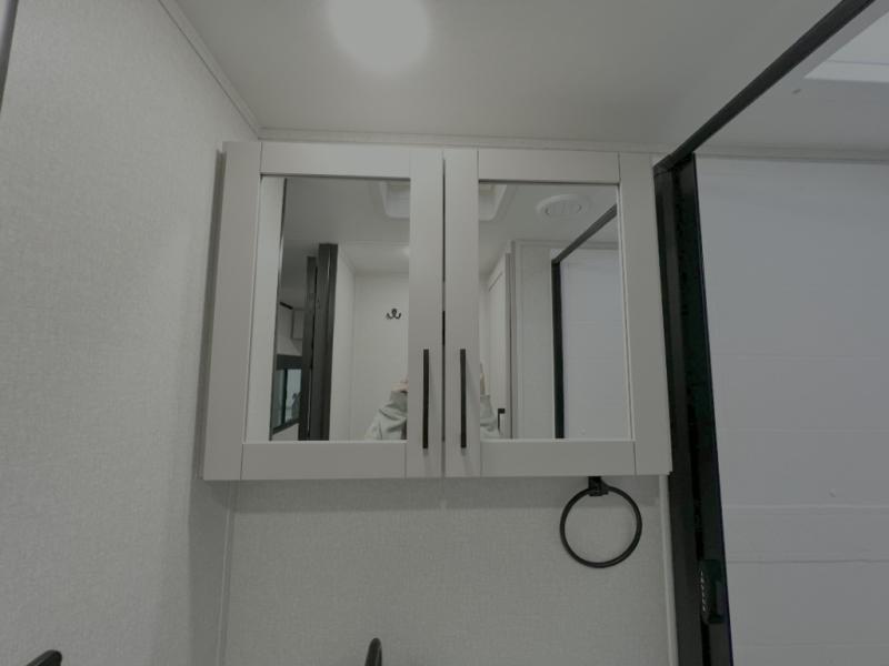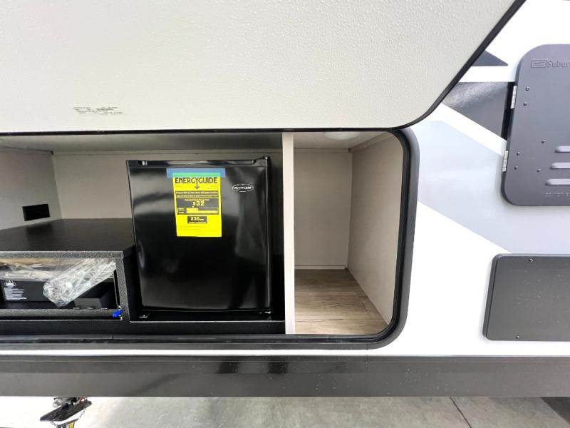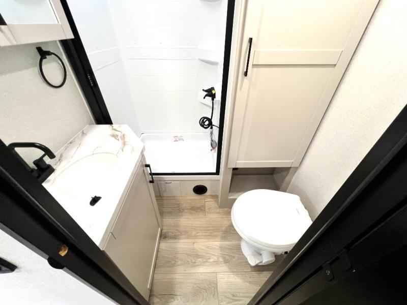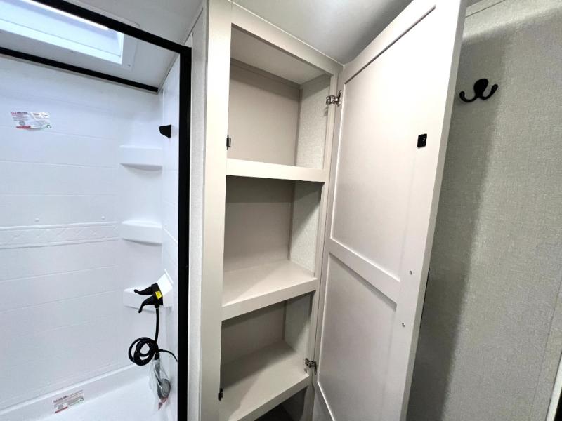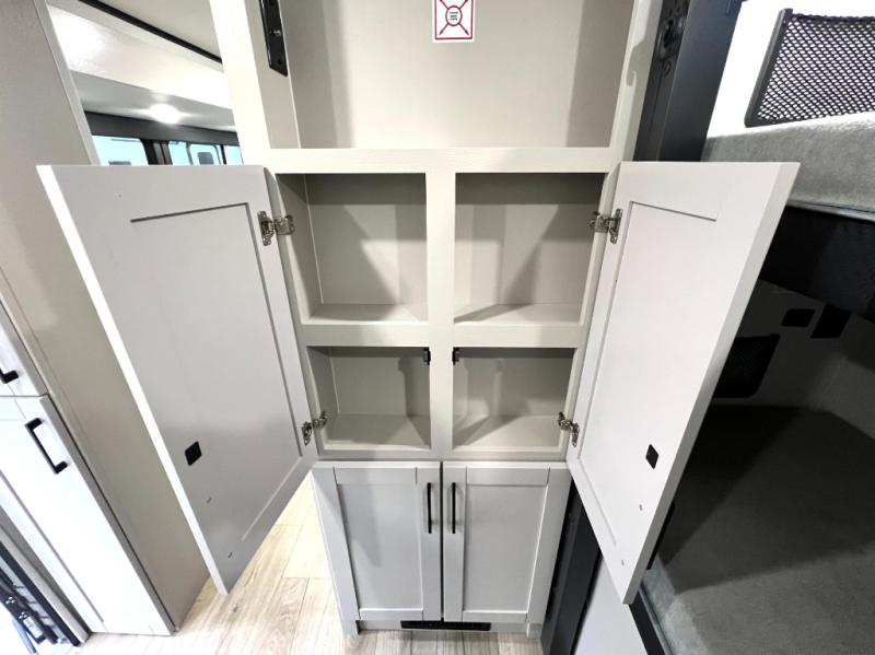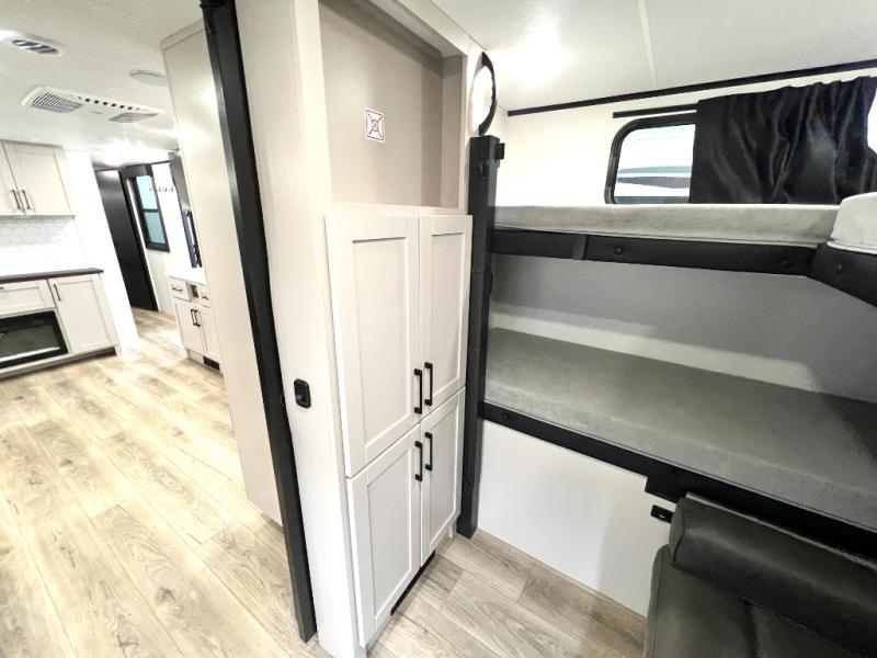 If you've been searching for a travel trailer that will fit your whole gang, this is the one! Because there is a rear private bunkhouse with three bunks and a jackknife sofa, your guests or kids will have their own space each night. There is also an exterior cargo door so you can pack camp gear directly into the bunkhouse for convenience! The combined living area and kitchen is open and spacious thanks to the large slide out, and here you'll enjoy the tri-fold sofa and booth dinette that can also serve as even more sleeping space if needed. There is also a pantry plus additional storage, along with a stainless-steel sink and a 11 cubic ft refrigerator to store your groceries. There is an entertainment center with an LED Smart TV, and a full bath with a 30" x 36" where you can clean up after lake swimming. You will love the front private bedroom with a queen bed, a wardrobe, dual nightstands, and overhead storage so everything has its place!