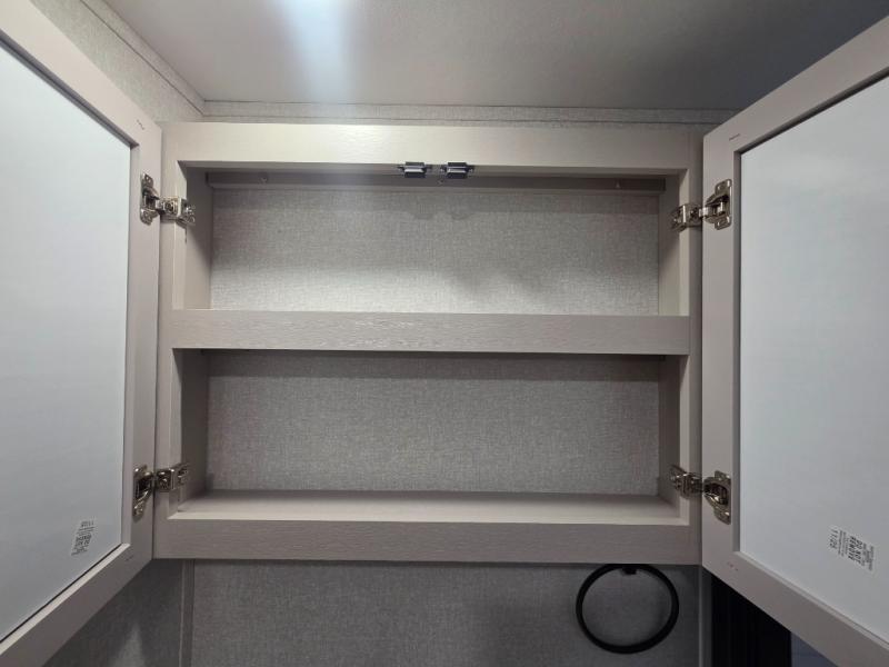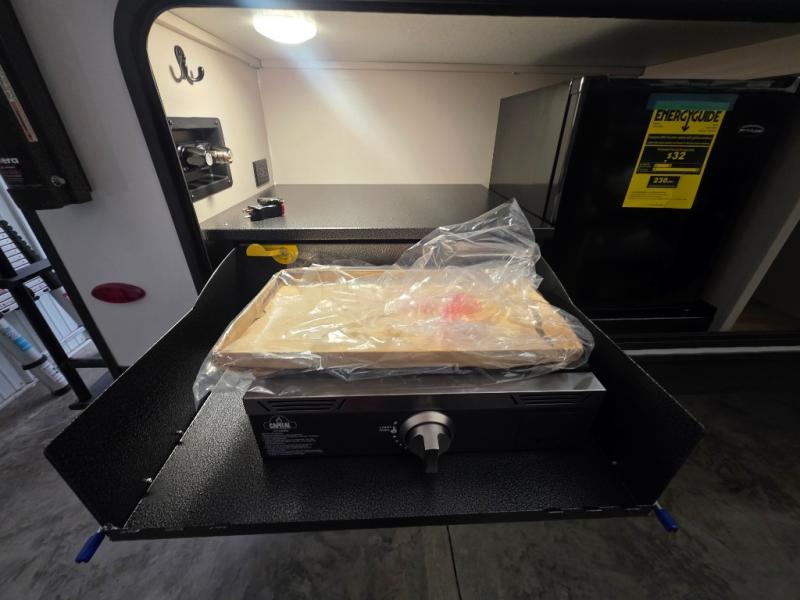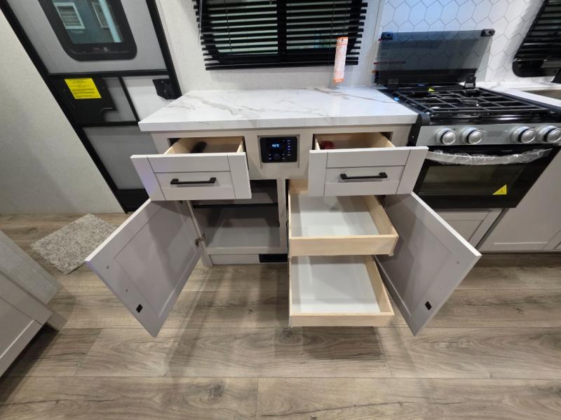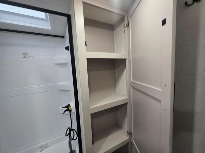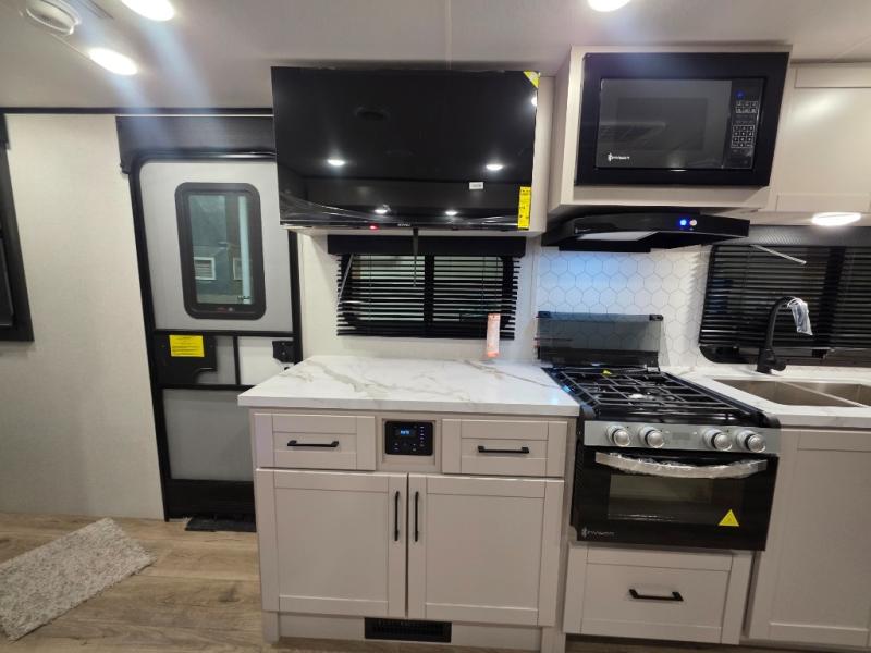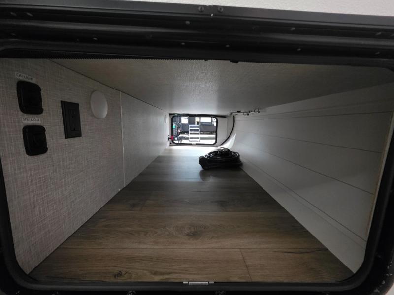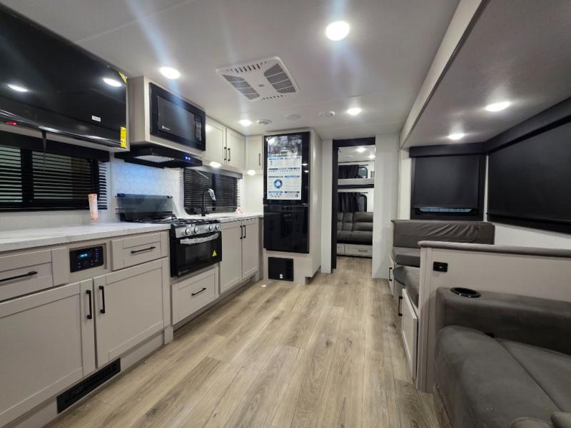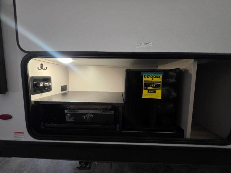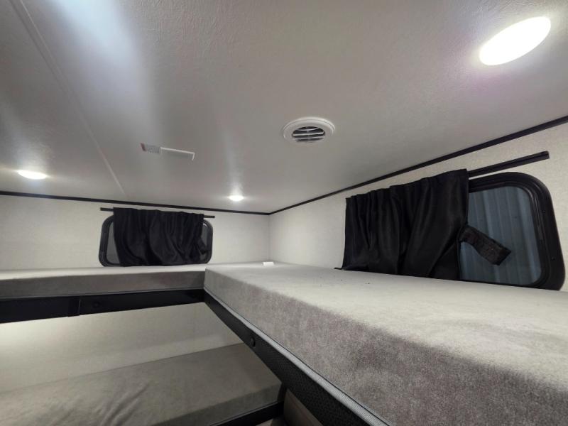 If you've been searching for a travel trailer that will fit your whole gang, this is the one! Because there is a rear private bunkhouse with three bunks and a jackknife sofa, your guests or kids will have their own space each night. There is also an exterior cargo door so you can pack camp gear directly into the bunkhouse for convenience! The combined living area and kitchen is open and spacious thanks to the large slide out, and here you'll enjoy the tri-fold sofa and booth dinette that can also serve as even more sleeping space if needed. There is also a pantry plus additional storage, along with a stainless-steel sink and a 11 cubic ft refrigerator to store your groceries. There is an entertainment center with an LED Smart TV, and a full bath with a 30" x 36" where you can clean up after lake swimming. You will love the front private bedroom with a queen bed, a wardrobe, dual nightstands, and overhead storage so everything has its place!