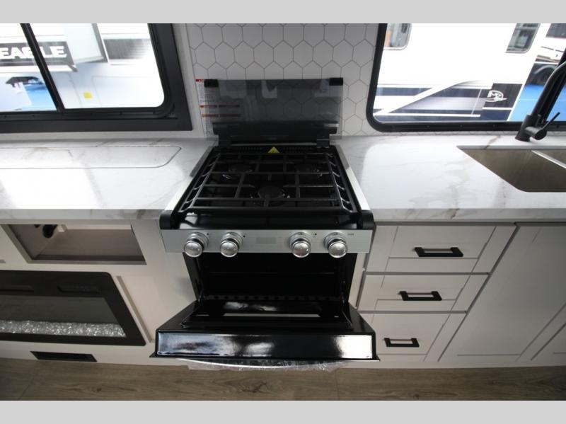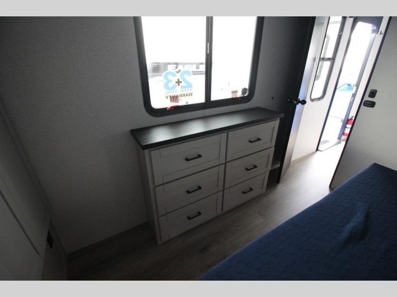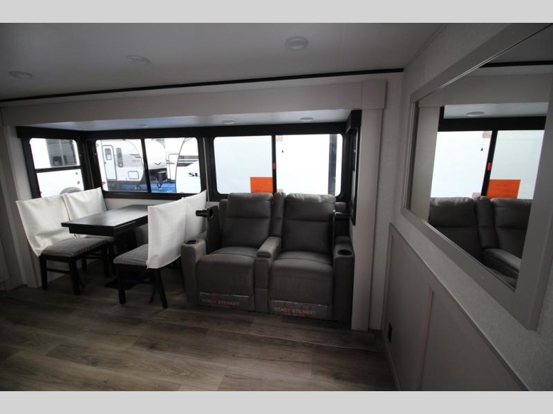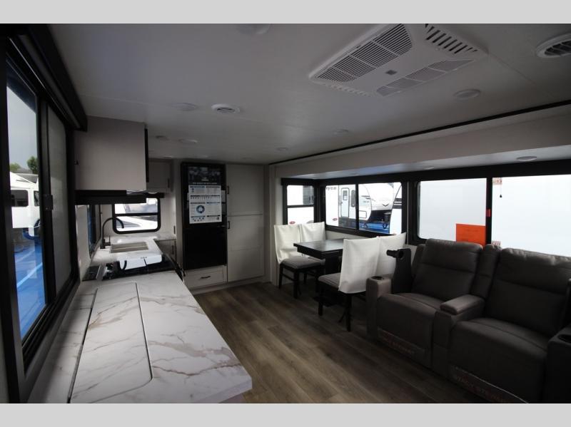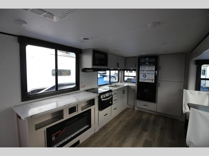 Experience the ultimate in RV living with our luxurious travel trailer, featuring a spacious rear kitchen perfect for meal prep. The pantry and fridge provide ample grocery storage, and the overhead cabinets add extra space for cookware and dishes. Plus, the microwave makes cooking and reheating meals a breeze, and the dinette is a great spot to enjoy meals or play games with family and friends. In the nice living room, you will find a trifold sofa, a perfect place to relax and unwind, and an entertainment center with a fireplace adding warmth and ambiance to the space. The full bathroom is beautifully appointed and provides all the essentials for a comfortable stay. Furthermore, the front bedroom is a serene retreat, featuring a spacious queen bed, dresser, wardrobe, and nightstands beside the bed for ultimate convenience. This travel trailer also features washer and dryer prep, making it easy to hook up to laundry facilities on the go, and with an outside kitchen, you can cook up a storm while enjoying the fresh air and scenery.