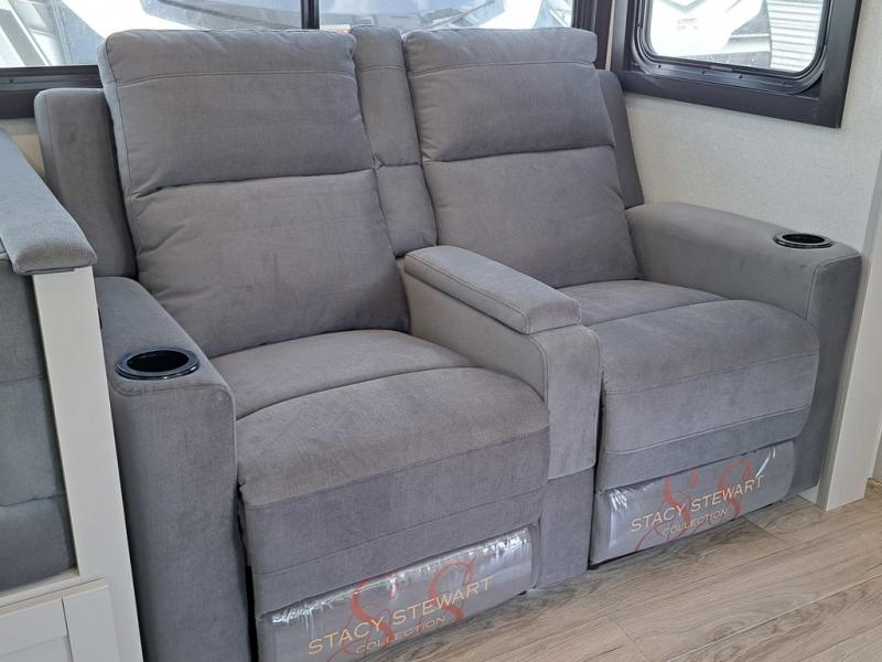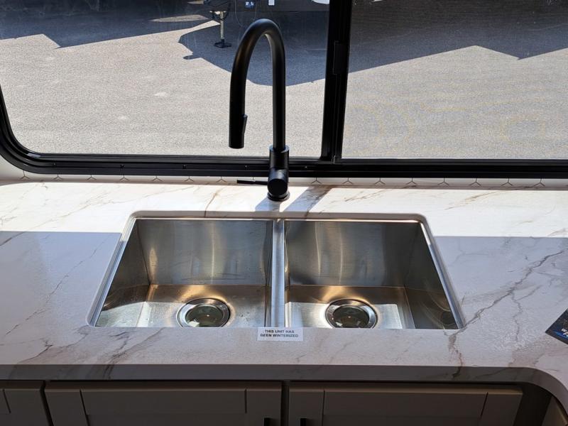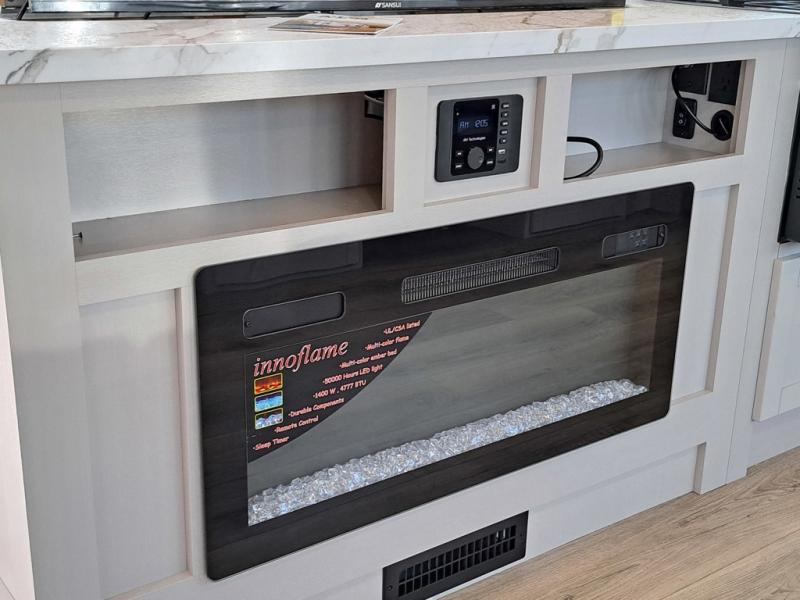 Experience the ultimate in RV living with our luxurious travel trailer, featuring a spacious rear kitchen perfect for meal prep. The pantry and fridge provide ample grocery storage, and the overhead cabinets add extra space for cookware and dishes. Plus, the microwave makes cooking and reheating meals a breeze, and the dinette is a great spot to enjoy meals or play games with family and friends. In the nice living room, you will find a trifold sofa, a perfect place to relax and unwind, and an entertainment center with a fireplace adding warmth and ambiance to the space. The full bathroom is beautifully appointed and provides all the essentials for a comfortable stay. Furthermore, the front bedroom is a serene retreat, featuring a spacious queen bed, dresser, wardrobe, and nightstands beside the bed for ultimate convenience. This travel trailer also features washer and dryer prep, making it easy to hook up to laundry facilities on the go, and with an outside kitchen, you can cook up a storm while enjoying the fresh air and scenery.