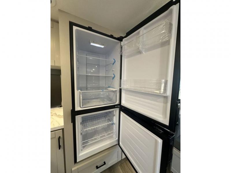 Experience the ultimate in RV living with our luxurious travel trailer, featuring a spacious rear kitchen perfect for meal prep. The pantry and fridge provide ample grocery storage, and the overhead cabinets add extra space for cookware and dishes. Plus, the microwave makes cooking and reheating meals a breeze, and the dinette is a great spot to enjoy meals or play games with family and friends. In the nice living room, you will find a trifold sofa, a perfect place to relax and unwind, and an entertainment center with a fireplace adding warmth and ambiance to the space. The full bathroom is beautifully appointed and provides all the essentials for a comfortable stay. Furthermore, the front bedroom is a serene retreat, featuring a spacious queen bed, dresser, wardrobe, and nightstands beside the bed for ultimate convenience. This travel trailer also features washer and dryer prep, making it easy to hook up to laundry facilities on the go, and with an outside kitchen, you can cook up a storm while enjoying the fresh air and scenery.