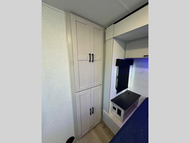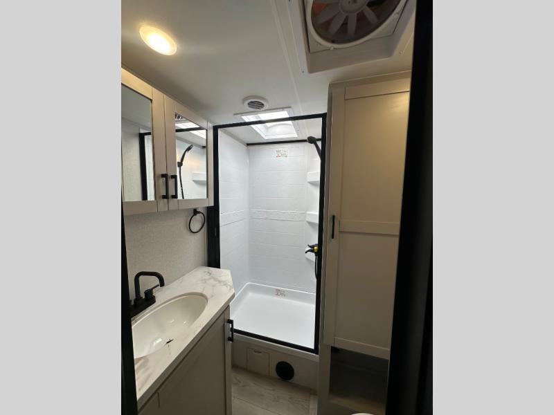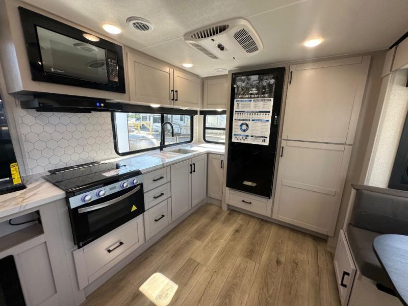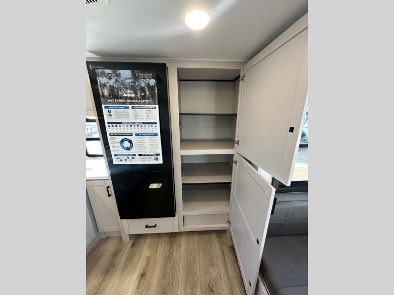 With any Jay Feather travel trailer by Jayco, you will enjoy lightweight towing, convenient exterior amenities, and at-home comforts inside! The Overlander 1 Solar Package included within the Jay Sport Package comes with a 200W solar panel and a 30-amp digital controller so you can enjoy some off-grid camping. There is also a modern graphics package with a dual-colored sidewall, LCI Solid Step fold-down aluminum tread steps on the main entry door, and Climate Shield 0 -100° F tested weather insulation package that will allow you to camp in all sorts of climates. The Customer Value Package will make time outdoors easier than ever with a power tongue jack and a Rock Solid stabilizer system, plus American-made nitro-filled Goodyear tires with self-adjusting electric brakes. More exterior features include a Keyed-Alike locking system, marine grade exterior speakers, a Magnum Truss roof system, and the list goes on! And we haven't even touched on the interior comforts, like the residential style seamless countertops and vinyl flooring throughout, decorative backsplash, handcrafted hardwood door/drawer fronts, and multiple USB charging ports to keep you going!