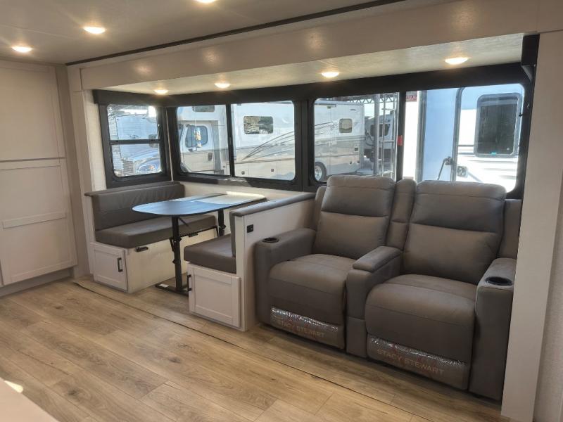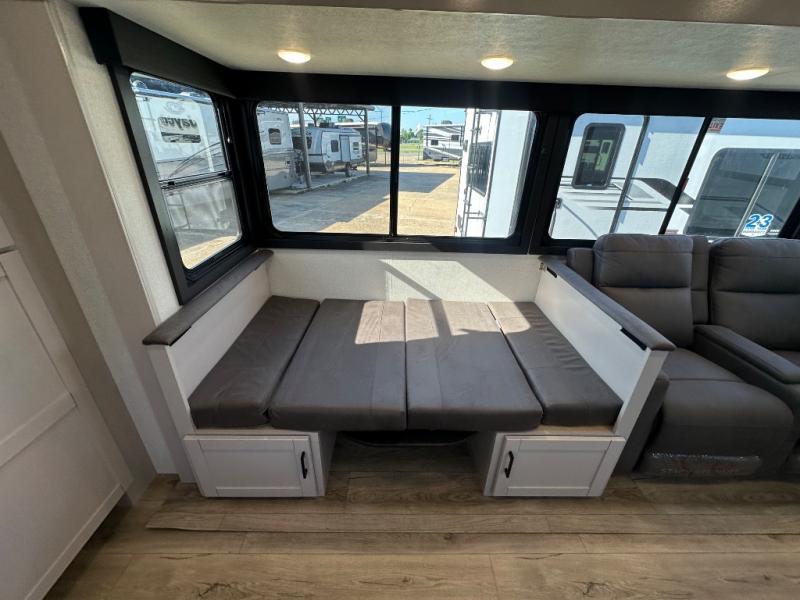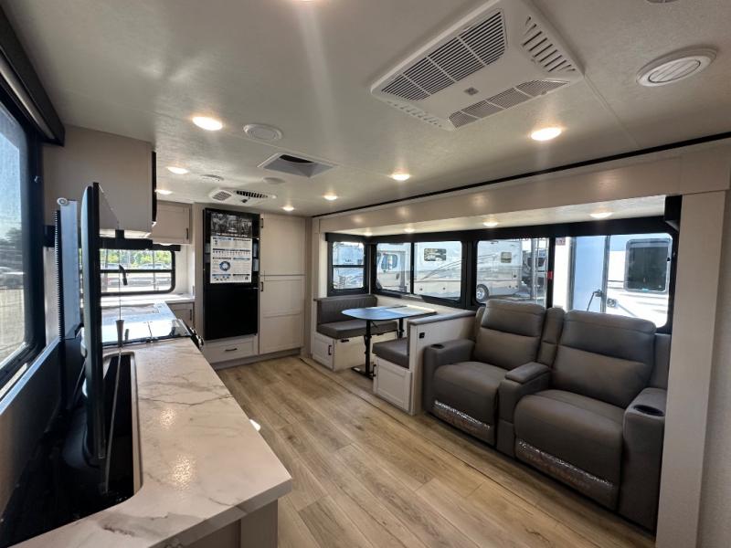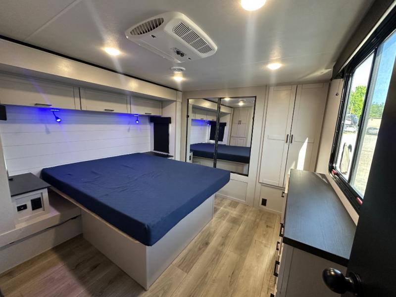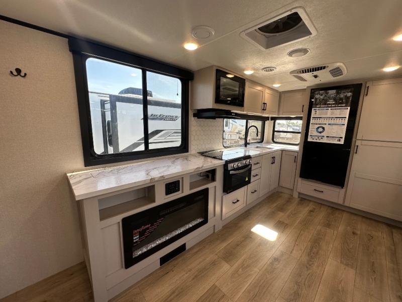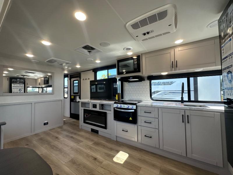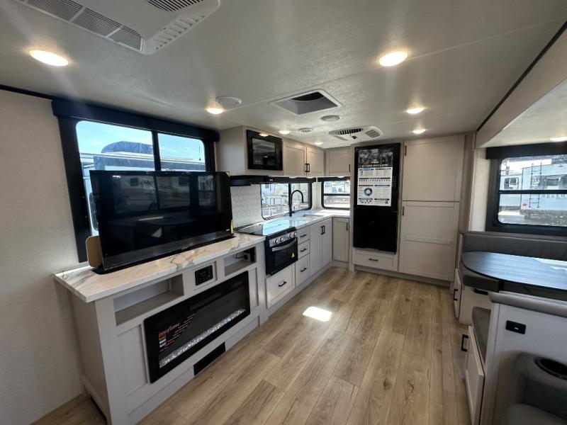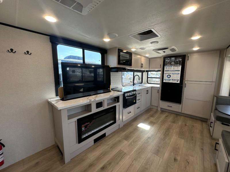 Experience the ultimate in RV living with our luxurious travel trailer, featuring a spacious rear kitchen perfect for meal prep. The pantry and fridge provide ample grocery storage, and the overhead cabinets add extra space for cookware and dishes. Plus, the microwave makes cooking and reheating meals a breeze, and the dinette is a great spot to enjoy meals or play games with family and friends. In the nice living room, you will find a trifold sofa, a perfect place to relax and unwind, and an entertainment center with a fireplace adding warmth and ambiance to the space. The full bathroom is beautifully appointed and provides all the essentials for a comfortable stay. Furthermore, the front bedroom is a serene retreat, featuring a spacious queen bed, dresser, wardrobe, and nightstands beside the bed for ultimate convenience. This travel trailer also features washer and dryer prep, making it easy to hook up to laundry facilities on the go, and with an outside kitchen, you can cook up a storm while enjoying the fresh air and scenery.