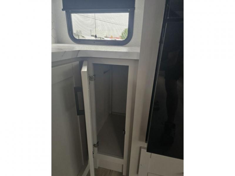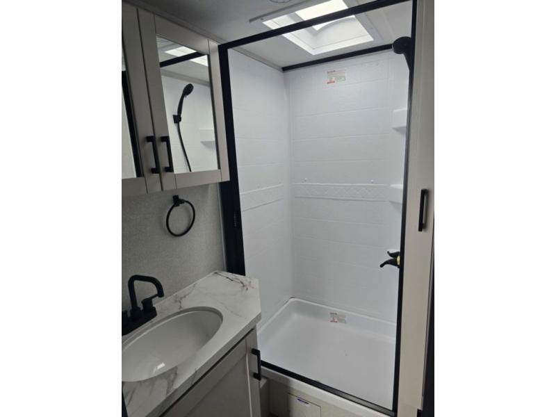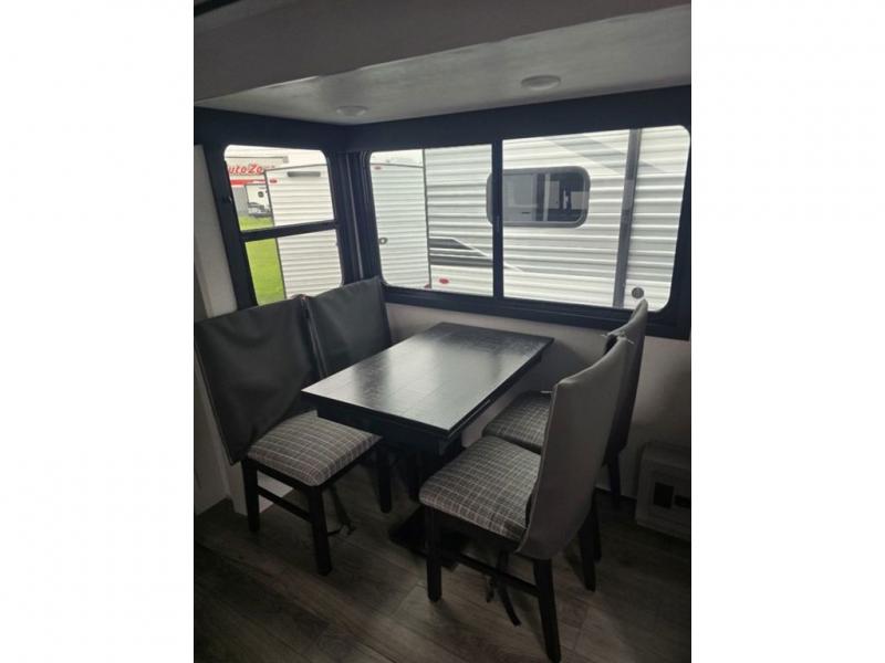 Experience the ultimate in RV living with our luxurious travel trailer, featuring a spacious rear kitchen perfect for meal prep. The pantry and fridge provide ample grocery storage, and the overhead cabinets add extra space for cookware and dishes. Plus, the microwave makes cooking and reheating meals a breeze, and the dinette is a great spot to enjoy meals or play games with family and friends. In the nice living room, you will find a trifold sofa, a perfect place to relax and unwind, and an entertainment center with a fireplace adding warmth and ambiance to the space. The full bathroom is beautifully appointed and provides all the essentials for a comfortable stay. Furthermore, the front bedroom is a serene retreat, featuring a spacious queen bed, dresser, wardrobe, and nightstands beside the bed for ultimate convenience. This travel trailer also features washer and dryer prep, making it easy to hook up to laundry facilities on the go, and with an outside kitchen, you can cook up a storm while enjoying the fresh air and scenery.