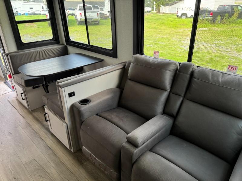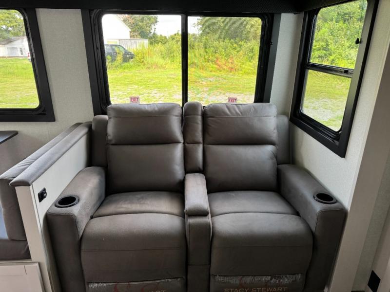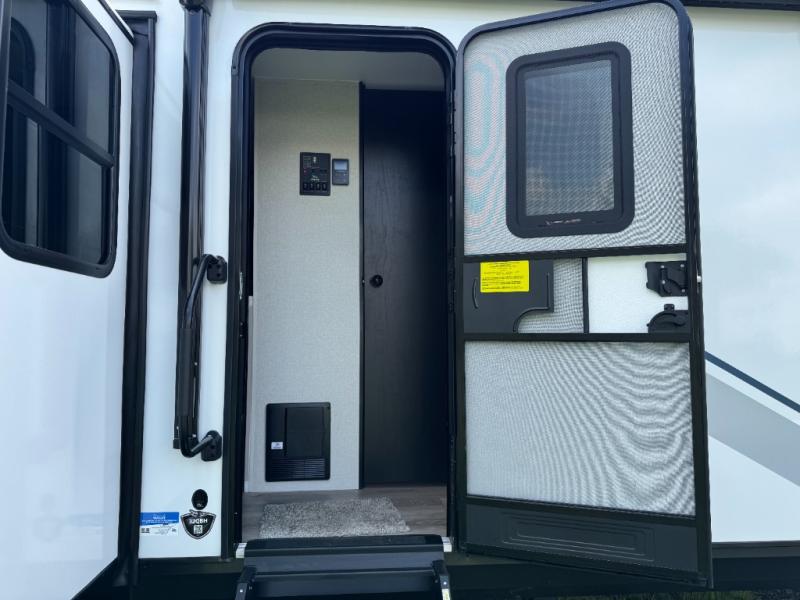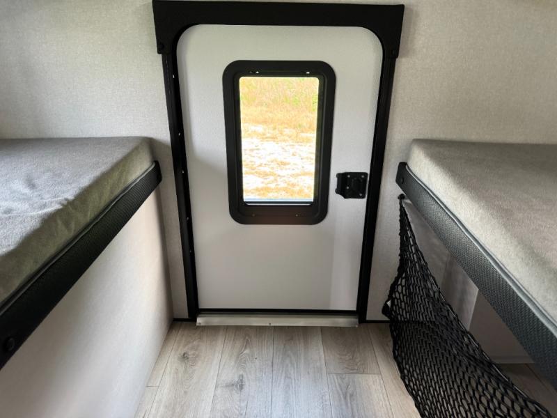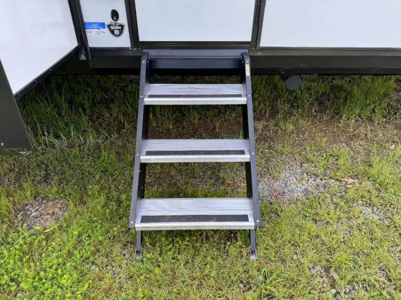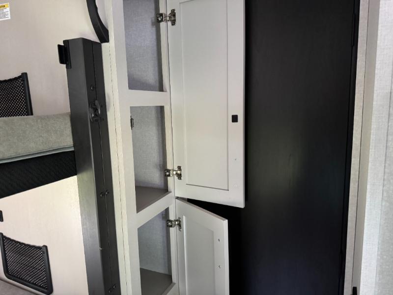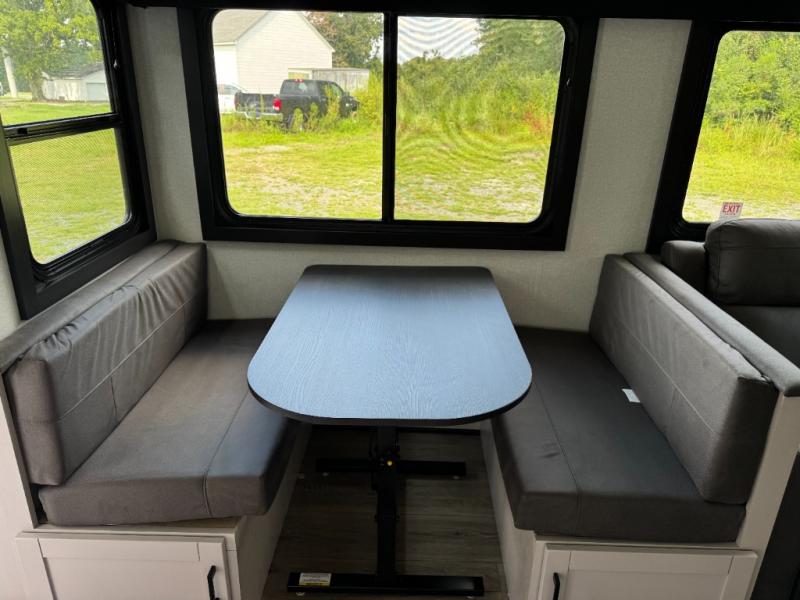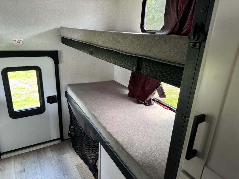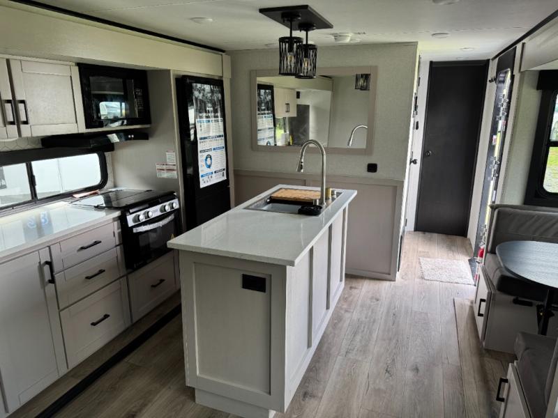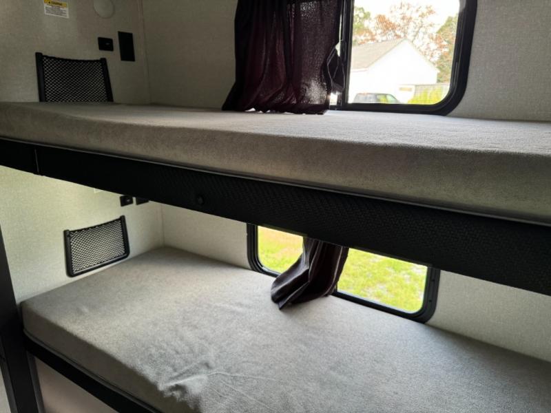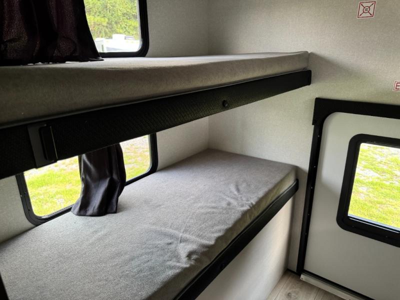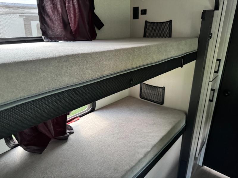 One look at the this travel trailer and you'll be sold! The rear bunkhouse features four bunks with ladders plus a bike door so you can easily pack in camp gear. You'll find your own space up front in the private bedroom, and the queen bed here will provide a great night's rest. Head to the combined kitchen and living area to relax on the tri-fold sofa across from the LED Smart TV, or play a game at the booth dinette after you've cleaned up from dinner. The exterior is just as accommodating with its outside kitchen and two power awnings!