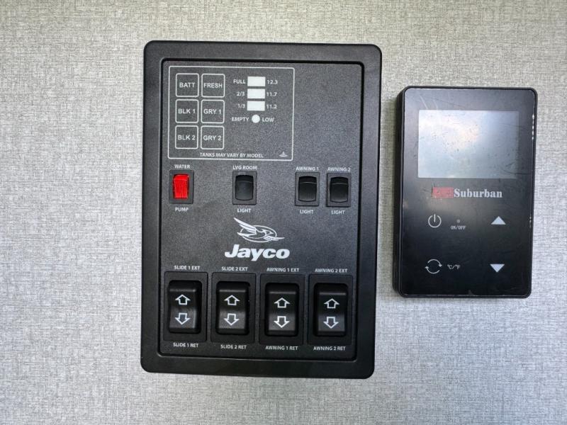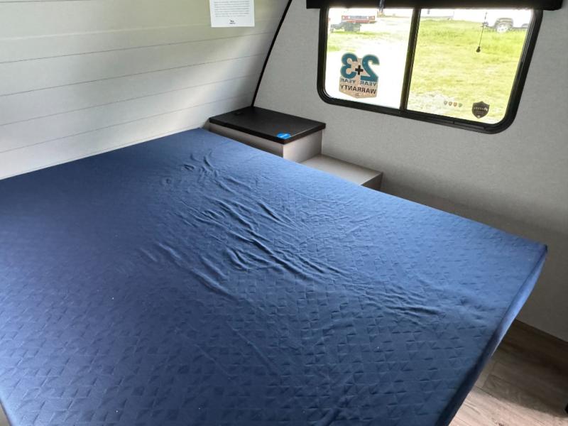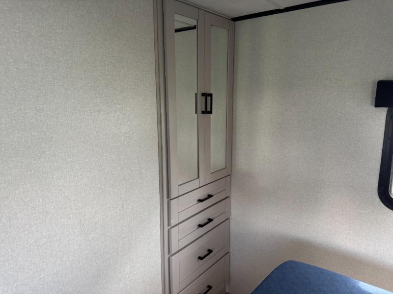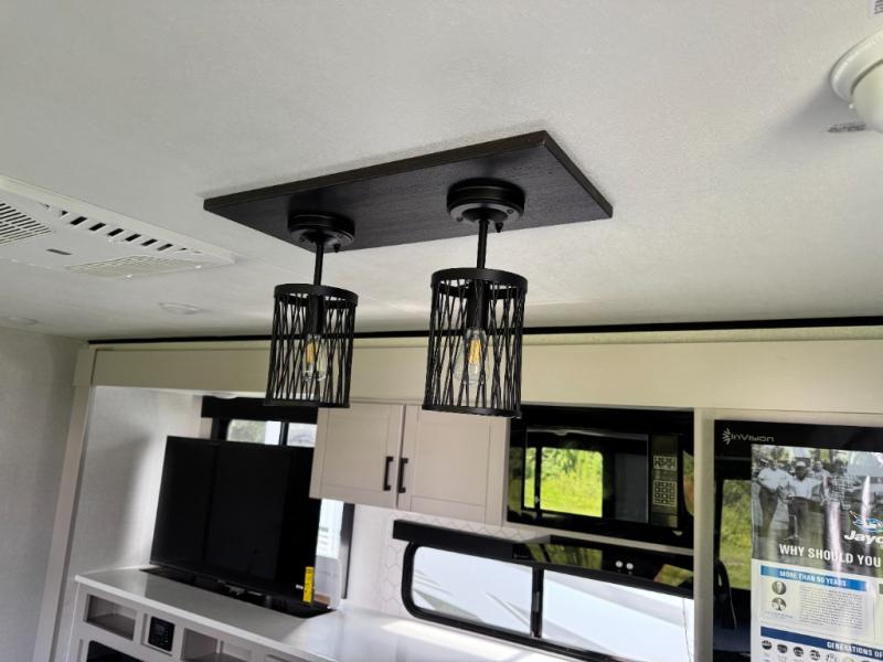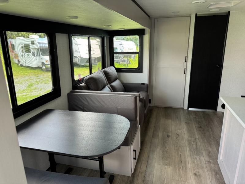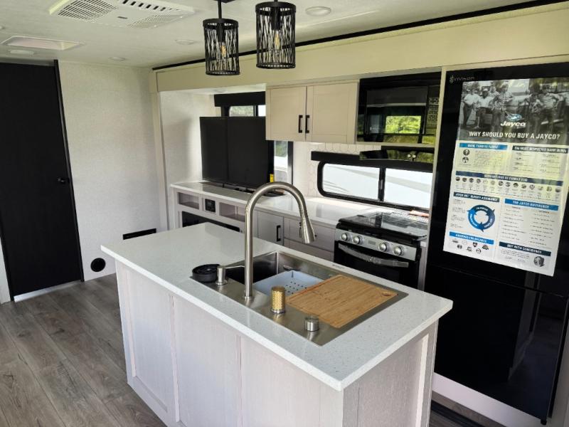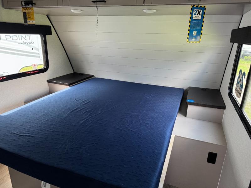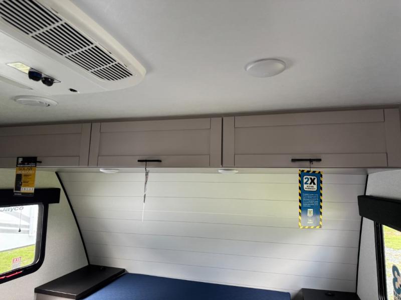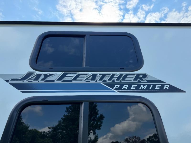 With any Jay Feather travel trailer by Jayco, you will enjoy lightweight towing, convenient exterior amenities, and at-home comforts inside! The Overlander 1 Solar Package included within the Jay Sport Package comes with a 200W solar panel and a 30-amp digital controller so you can enjoy some off-grid camping. There is also a modern graphics package with a dual-colored sidewall, LCI Solid Step fold-down aluminum tread steps on the main entry door, and Climate Shield 0 -100° F tested weather insulation package that will allow you to camp in all sorts of climates. The Customer Value Package will make time outdoors easier than ever with a power tongue jack and a Rock Solid stabilizer system, plus American-made nitro-filled Goodyear tires with self-adjusting electric brakes. More exterior features include a Keyed-Alike locking system, marine grade exterior speakers, a Magnum Truss roof system, and the list goes on! And we haven't even touched on the interior comforts, like the residential style seamless countertops and vinyl flooring throughout, decorative backsplash, handcrafted hardwood door/drawer fronts, and multiple USB charging ports to keep you going!