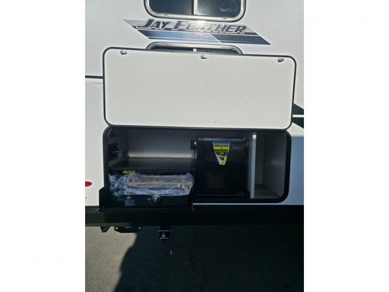 With any Jay Feather travel trailer by Jayco, you will enjoy lightweight towing, convenient exterior amenities, and at-home comforts inside! The Overlander 1 Solar Package included within the Jay Sport Package comes with a 200W solar panel and a 30-amp digital controller so you can enjoy some off-grid camping. There is also a modern graphics package, Solid fold-down step with aluminum tread steps on the main entry doorstep, and Climate Shield 0 -100° F tested weather insulation package that will allow you to camp in various types of climates. The Customer Value Package will make time outdoors easier than ever with a power tongue jack and Automotive-style aluminum rims, plus radial tires with self-adjusting electric brakes. More exterior features include a Keyed-Alike doors, a Magnum Truss roof system, and the list goes on! And we haven't even touched on the interior comforts, like the seamless countertops and Residential vinyl flooring throughout, decorative kitchen backsplash, handcrafted hardwood door/drawer fronts, and multiple USB charging ports to keep you going!