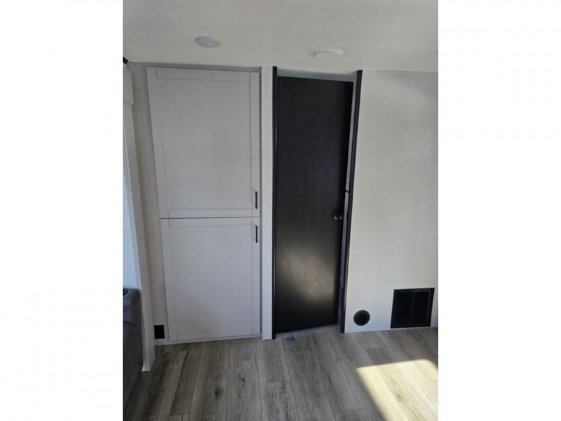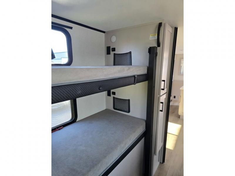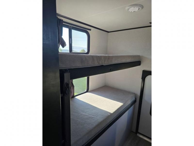 One look at this travel trailer and you'll be sold! The rear bunkhouse features four bunks with ladders plus a bike door so you can easily pack in camp gear. You'll find your own space up front in the private bedroom, and the 60" x 80" queen bed here will provide a great night's rest. Head to the combined kitchen and living area to relax on the tri-fold sofa across from the LED Smart TV or play a game at the booth dinette after you've cleaned up from dinner, Both the tri fold sofa and the dinette serve as extra sleeping space if needed. The exterior is just as accommodating with its outside kitchen and two power awnings!
