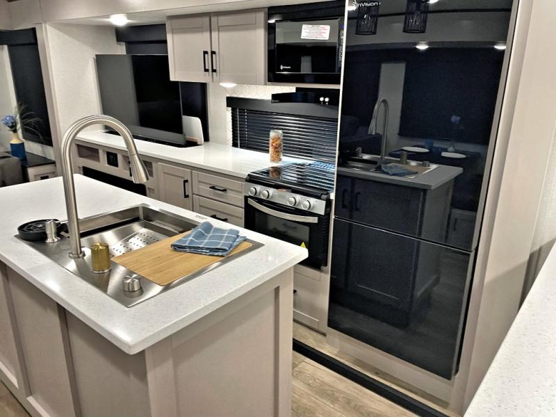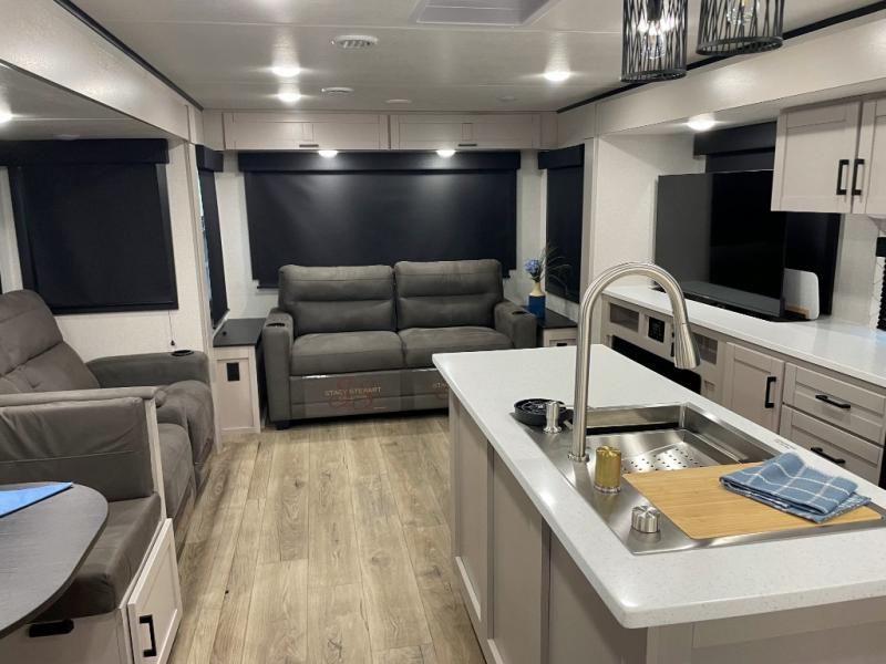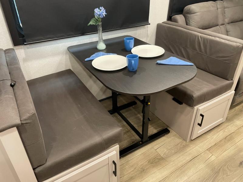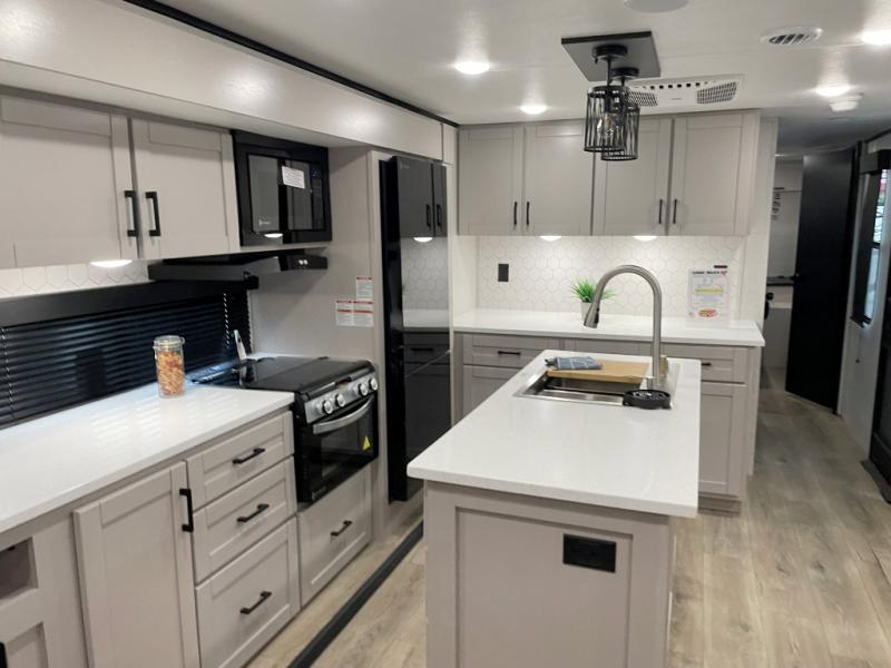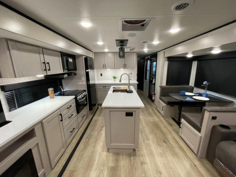 You'll love every minute spent in this rear living travel trailer! There are dual opposing slides in the combined kitchen and living area plus ample counter space and overhead storage for your things. Whether you're dining at the booth dinette, relaxing on the theater seating, or taking a rest on the rear tri-fold sofa, you're sure to have a great time. The full bath includes a shower with a skylight, a medicine cabinet, plus a linen closet to keep fresh towels close by. When you're ready for some shut-eye, the front private bedroom with a queen bed is sure to make you happy!