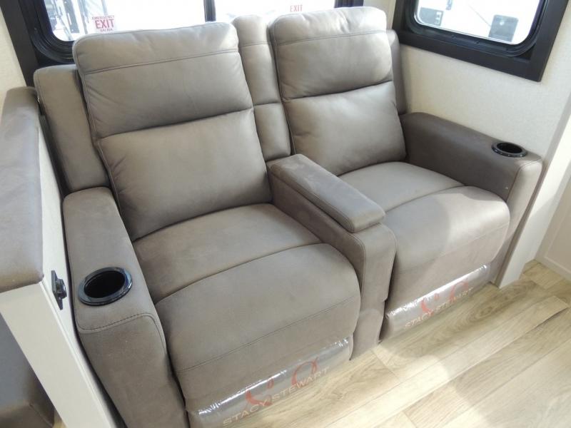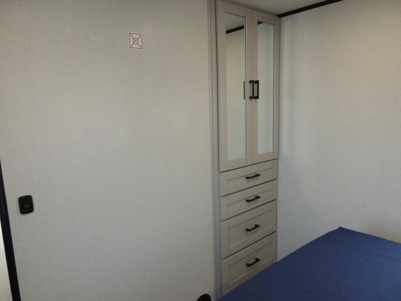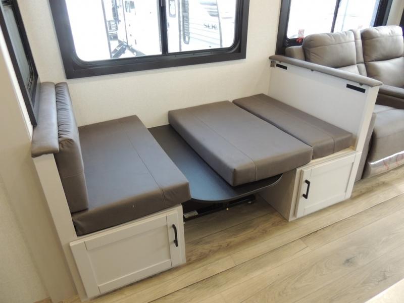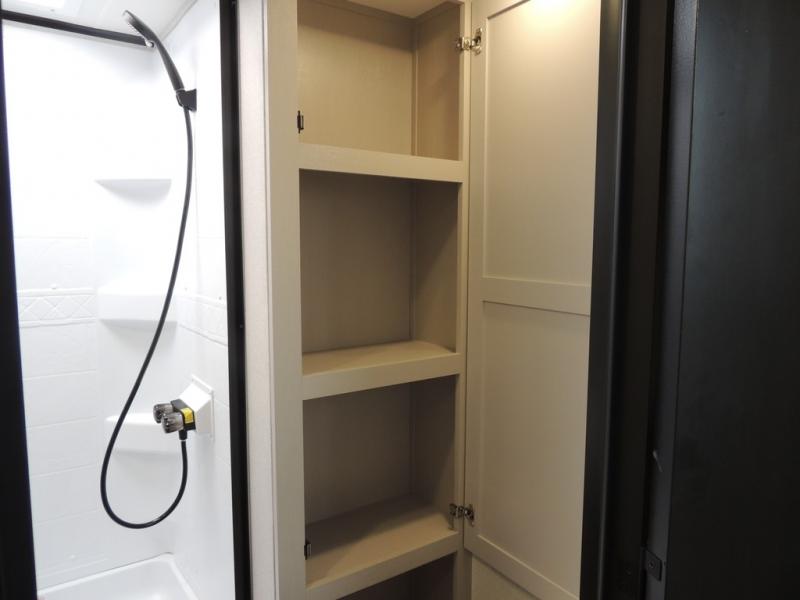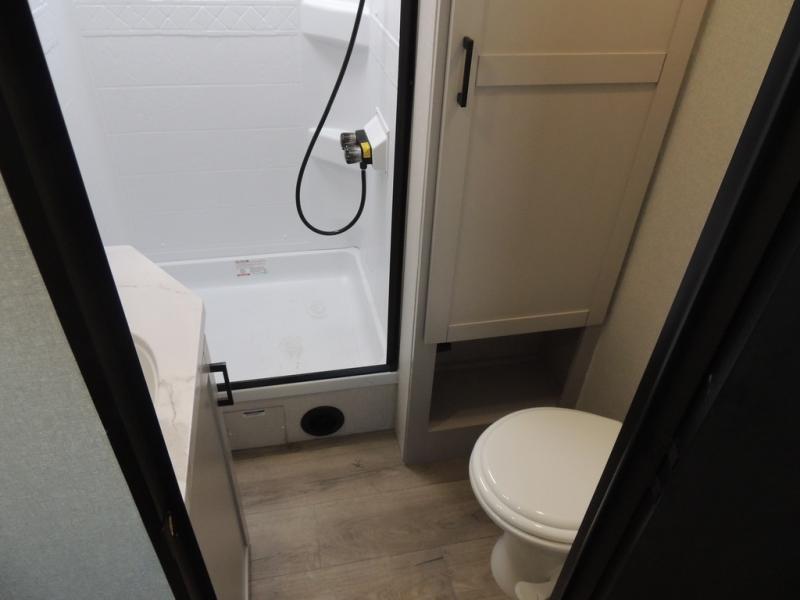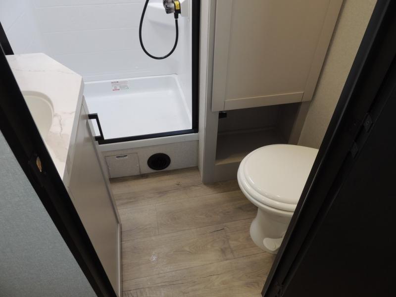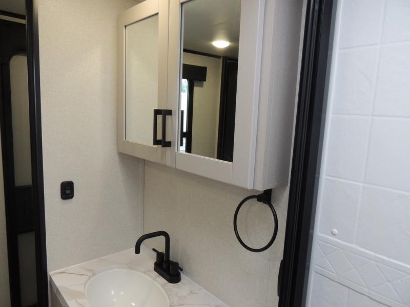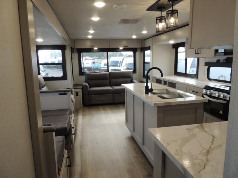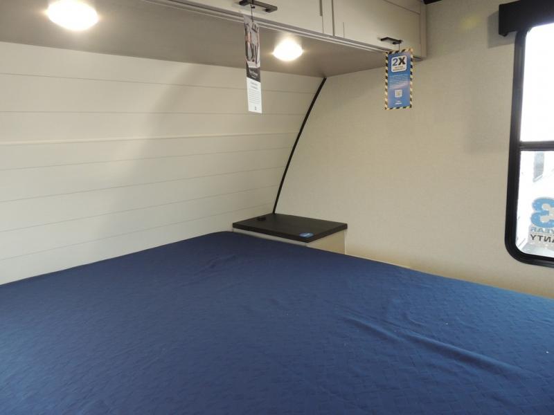 You'll love every minute spent in this rear living travel trailer! There are dual opposing slides in the combined kitchen and living area plus ample counter space and overhead storage for your things. Whether you're dining at the booth dinette, relaxing on the theater seating, or taking a rest on the rear tri-fold sofa, you're sure to have a great time. The full bath includes a shower with a skylight, a medicine cabinet, plus a linen closet to keep fresh towels close by. When you're ready for some shut-eye, the front private bedroom with a queen bed is sure to make you happy!