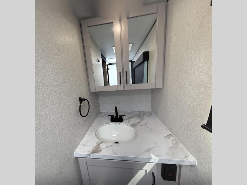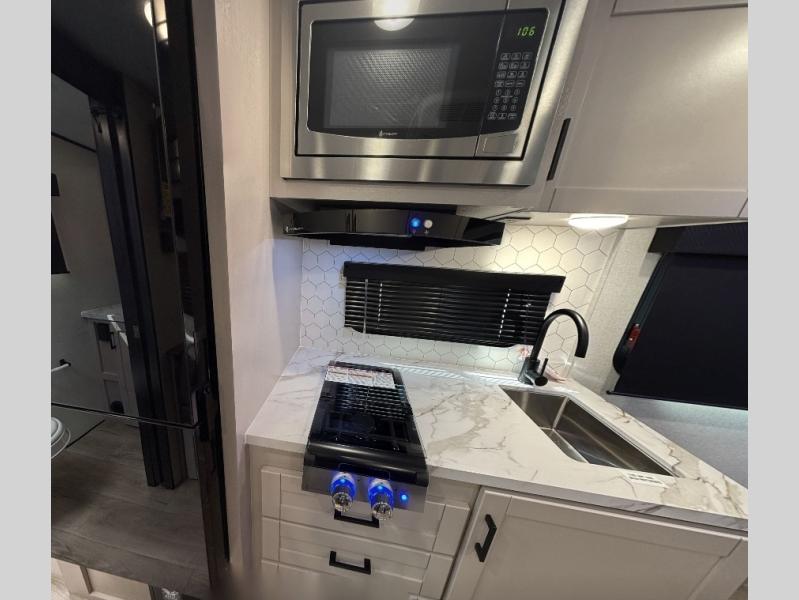 This is the perfect travel trailer for two to three campers! You'll have plenty of space during the day since there is a sofa up front, with a Murphy bed that can be folded down when you're ready for bed. There are also dual bedside wardrobes and nightstands to keep your space tidy. Breakfast can be made on the two burner cooktop or in the convection microwave, and there is a booth dinette where you can dine together. If the weather is nice, you may just find yourselves cooking on the exterior griddle and dining under the 13' awning! The full rear bath is sure to come in handy, and there is plenty of storage throughout to keep all your belongings put away!