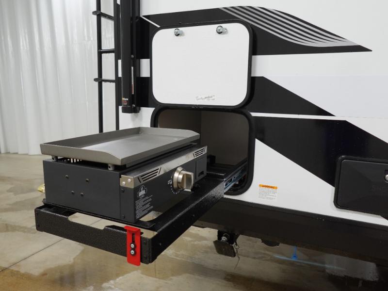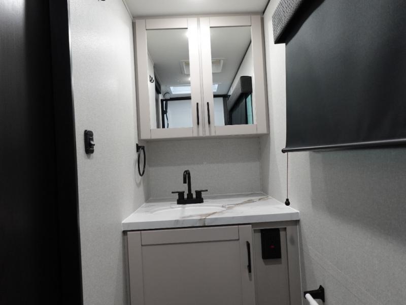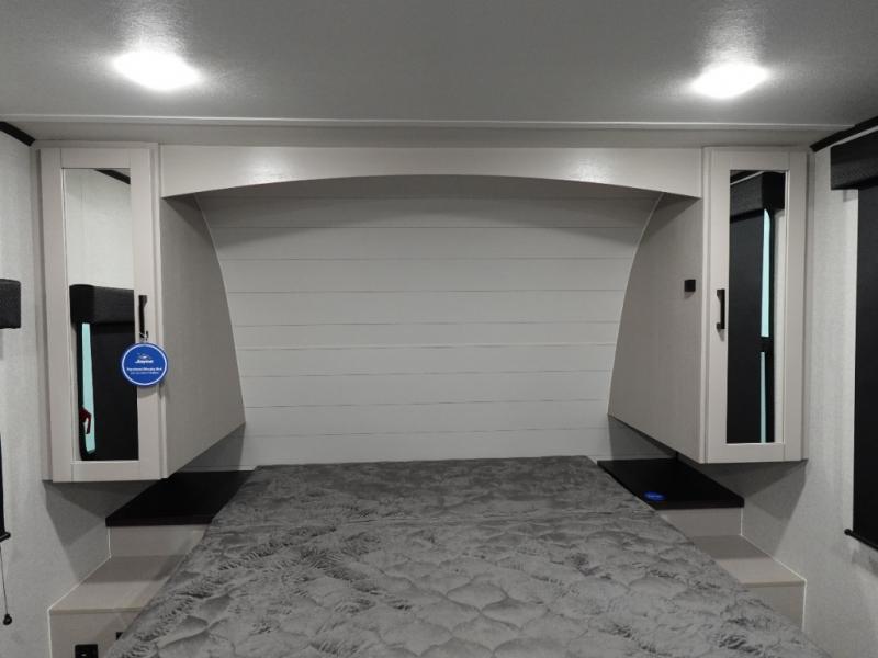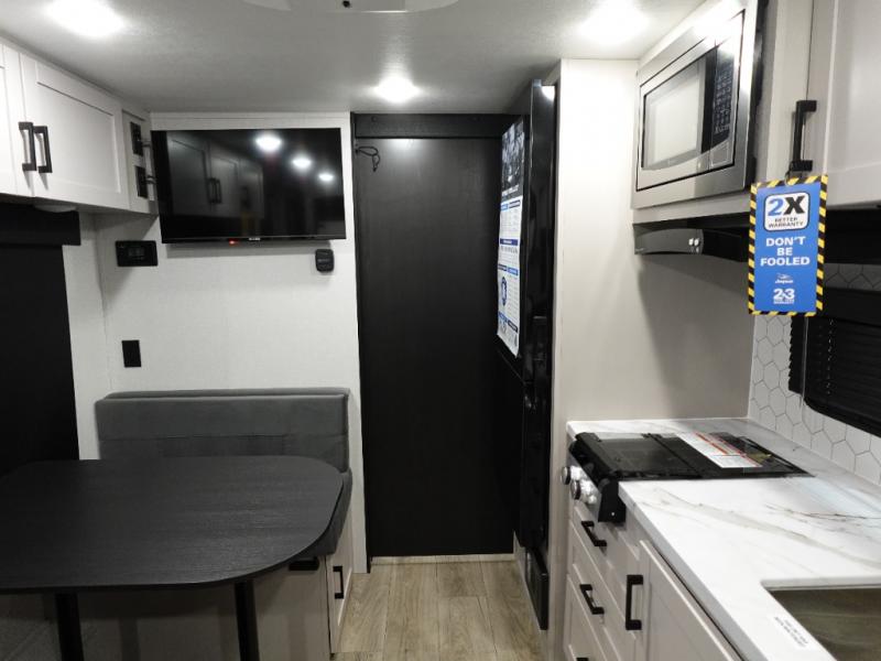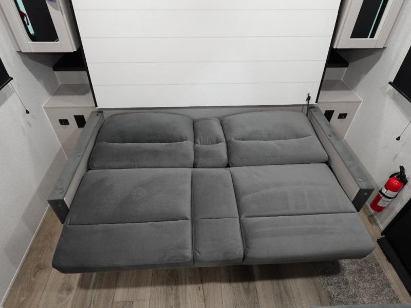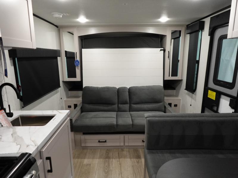 This is the perfect travel trailer for two to three campers! You'll have plenty of space during the day since there is a sofa up front, with a Murphy bed that can be folded down when you're ready for bed. There are also dual bedside wardrobes and nightstands to keep your space tidy. Breakfast can be made on the two burner cooktop or in the convection microwave, and there is a booth dinette where you can dine together. If the weather is nice, you may just find yourselves cooking on the exterior griddle and dining under the 13' awning! The full rear bath is sure to come in handy, and there is plenty of storage throughout to keep all your belongings put away!