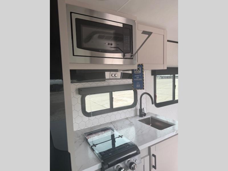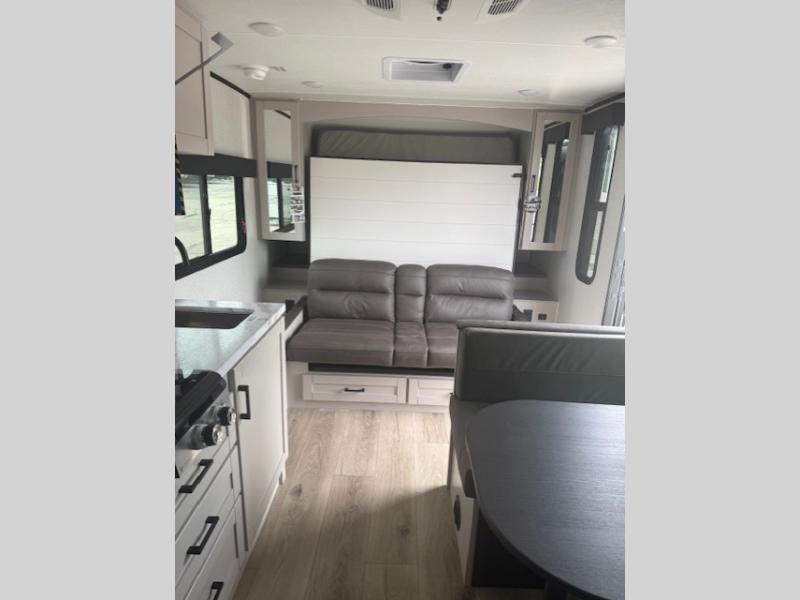 This is the perfect travel trailer for two to three campers! You'll have plenty of space during the day since there is a sofa up front, with a Murphy bed that can be folded down when you're ready for bed. There are also dual bedside wardrobes and nightstands to keep your space tidy. Breakfast can be made on the two burner cooktop or in the convection microwave, and there is a booth dinette where you can dine together. If the weather is nice, you may just find yourselves cooking on the exterior griddle and dining under the 13' awning! The full rear bath is sure to come in handy, and there is plenty of storage throughout to keep all your belongings put away!