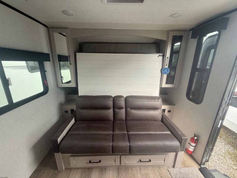 This is the perfect travel trailer for two to three campers! You'll have plenty of space during the day since there is a sofa up front, with a Murphy bed that can be folded down when you're ready for bed. There are also dual bedside wardrobes and nightstands to keep your space tidy. Breakfast can be made on the two burner cooktop or in the convection microwave, and there is a booth dinette where you can dine together. If the weather is nice, you may just find yourselves cooking on the exterior griddle and dining under the 13' awning! The full rear bath is sure to come in handy, and there is plenty of storage throughout to keep all your belongings put away!
