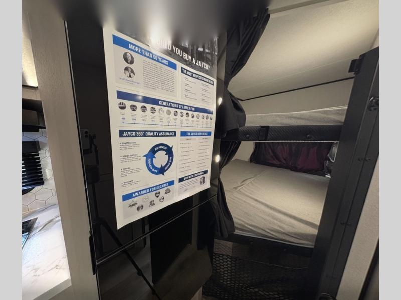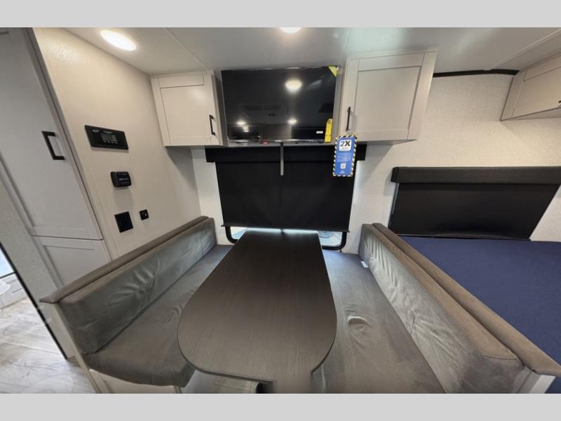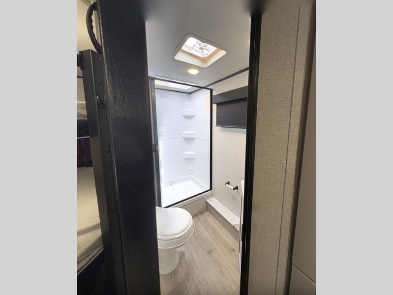 Step inside this travel trailer and you’re greeted by a spacious 60" x 80" queen bed, ensuring a restful night wherever your travels take you. At the foot of the bed, a wardrobe with drawers and overhead cabinets provides ample room for clothing and essentials. Centrally located, the kitchen is equipped with an 11 cu. ft. refrigerator, a two-burner cooktop, and a convection microwave, making it easy to whip up meals in no time. Across from the kitchen, the cozy dinette offers a comfortable place to enjoy meals or gather for board games after a day of adventure, and it conveniently converts into extra sleeping space at night. A large pantry nearby keeps dry goods and snacks organized. Toward the rear, you’ll find a full bathroom featuring a 30" x 36" shower, a linen closet, and a medicine cabinet, so you never have to rely on campsite facilities. In the opposite corner, 45" x 72" double bunks with storage below provide plenty of room for the whole gang, making every trip both fun and comfortable.