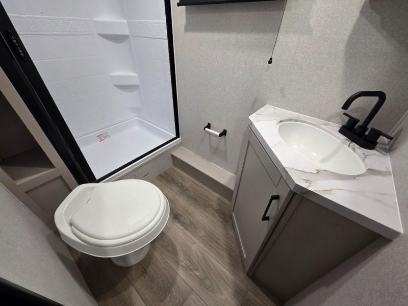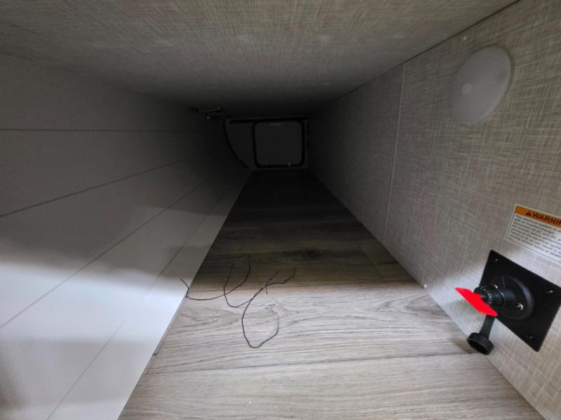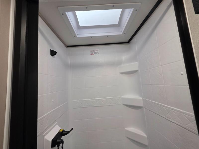 Step inside this travel trailer and you’re greeted by a spacious 60" x 80" queen bed, ensuring a restful night wherever your travels take you. At the foot of the bed, a wardrobe with drawers and overhead cabinets provides ample room for clothing and essentials. Centrally located, the kitchen is equipped with an 11 cu. ft. refrigerator, a two-burner cooktop, and a convection microwave, making it easy to whip up meals in no time. Across from the kitchen, the cozy dinette offers a comfortable place to enjoy meals or gather for board games after a day of adventure, and it conveniently converts into extra sleeping space at night. A large pantry nearby keeps dry goods and snacks organized. Toward the rear, you’ll find a full bathroom featuring a 30" x 36" shower, a linen closet, and a medicine cabinet, so you never have to rely on campsite facilities. In the opposite corner, 45" x 72" double bunks with storage below provide plenty of room for the whole gang, making every trip both fun and comfortable.