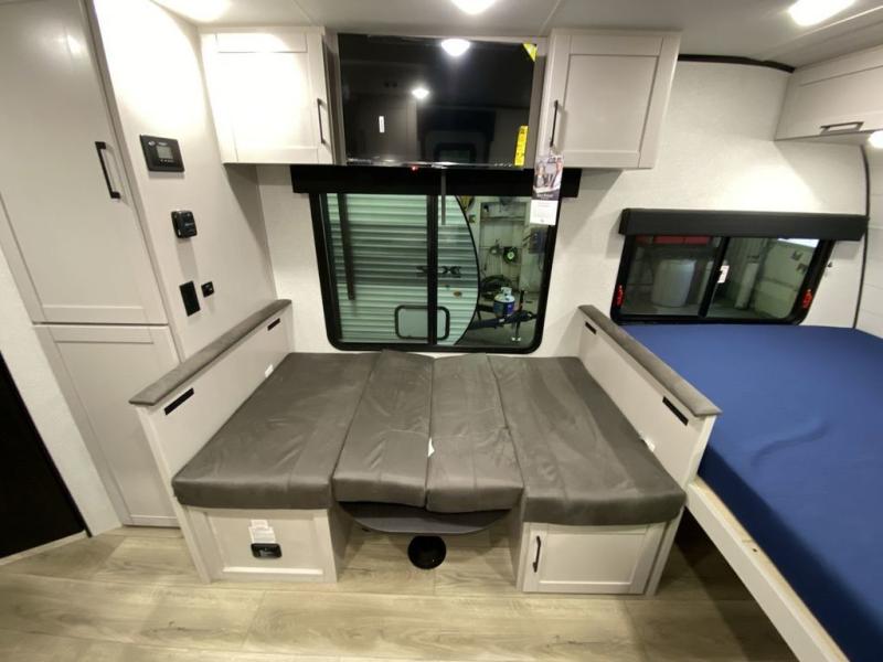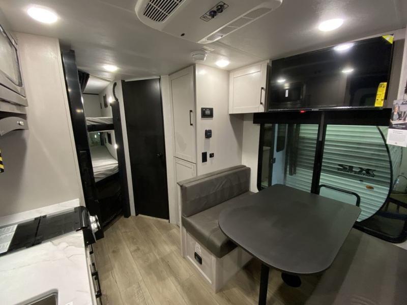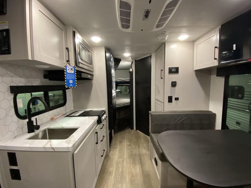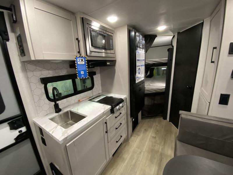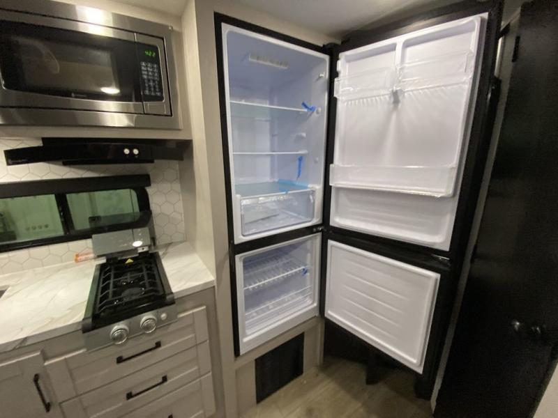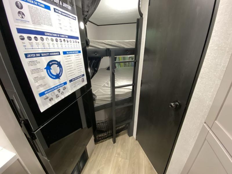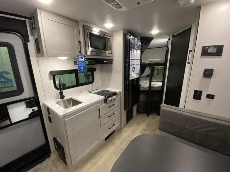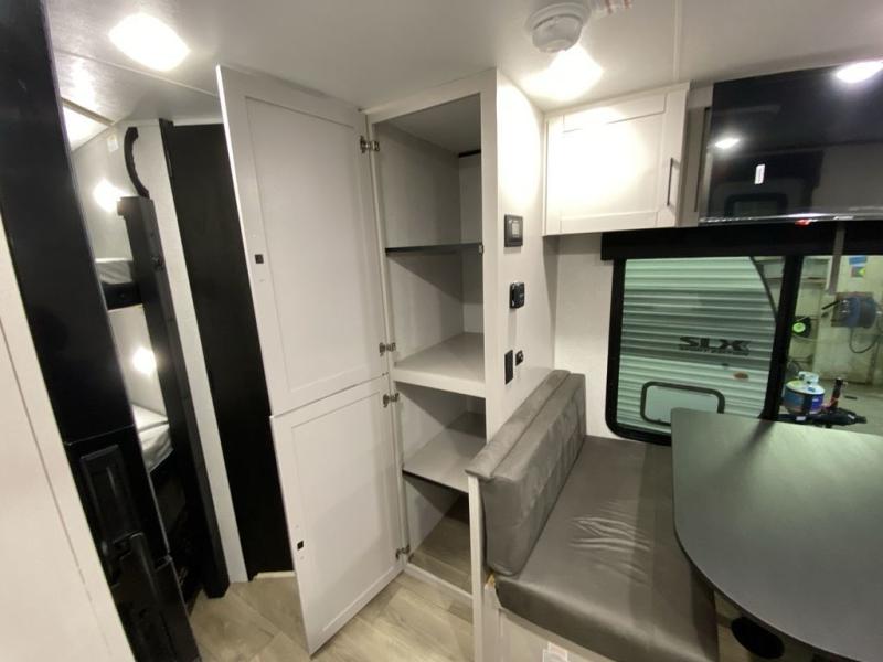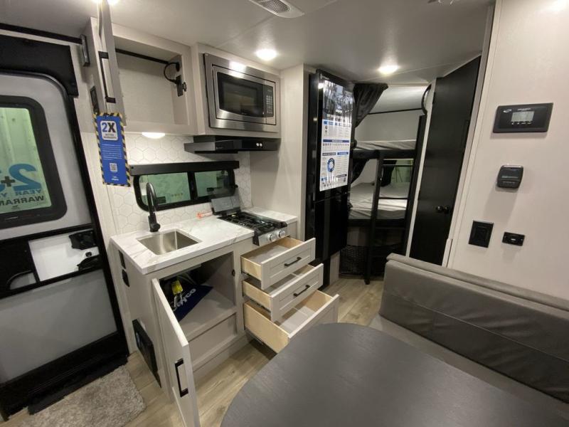 Step inside this travel trailer and you’re greeted by a spacious 60" x 80" queen bed, ensuring a restful night wherever your travels take you. At the foot of the bed, a wardrobe with drawers and overhead cabinets provides ample room for clothing and essentials. Centrally located, the kitchen is equipped with an 11 cu. ft. refrigerator, a two-burner cooktop, and a convection microwave, making it easy to whip up meals in no time. Across from the kitchen, the cozy dinette offers a comfortable place to enjoy meals or gather for board games after a day of adventure, and it conveniently converts into extra sleeping space at night. A large pantry nearby keeps dry goods and snacks organized. Toward the rear, you’ll find a full bathroom featuring a 30" x 36" shower, a linen closet, and a medicine cabinet, so you never have to rely on campsite facilities. In the opposite corner, 45" x 72" double bunks with storage below provide plenty of room for the whole gang, making every trip both fun and comfortable.