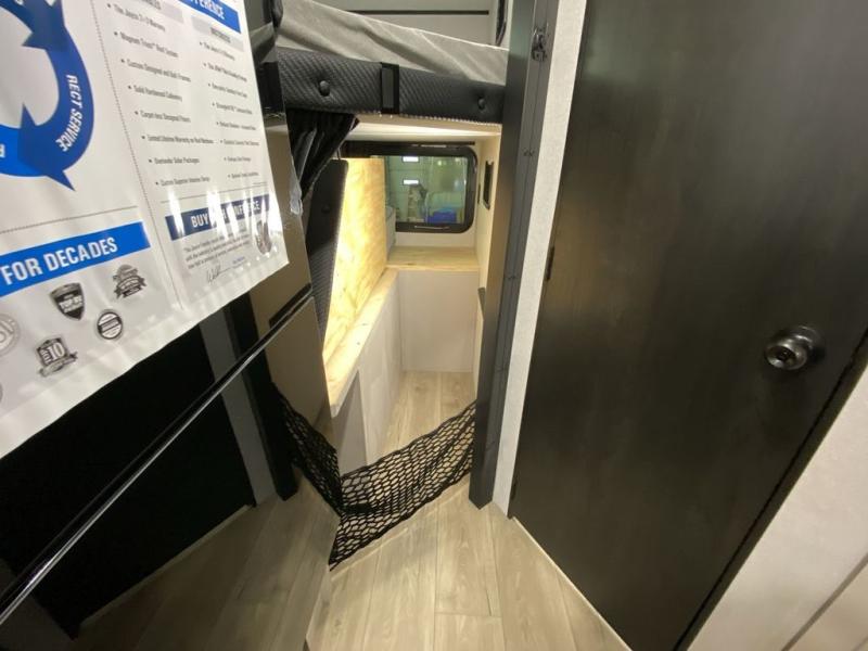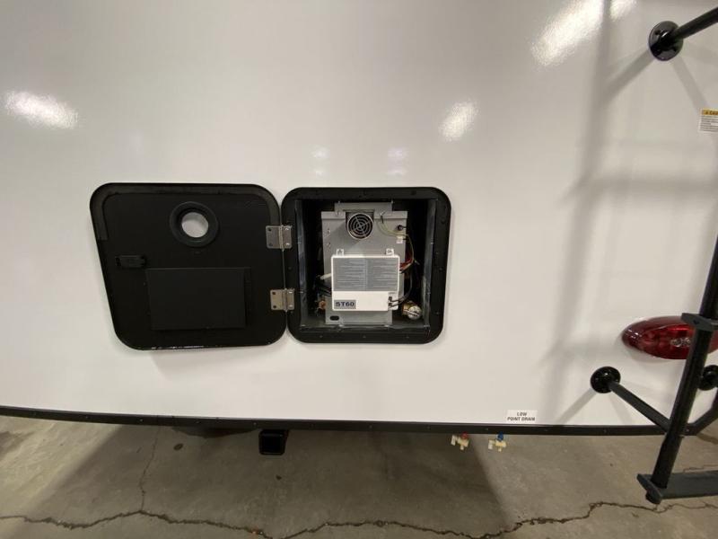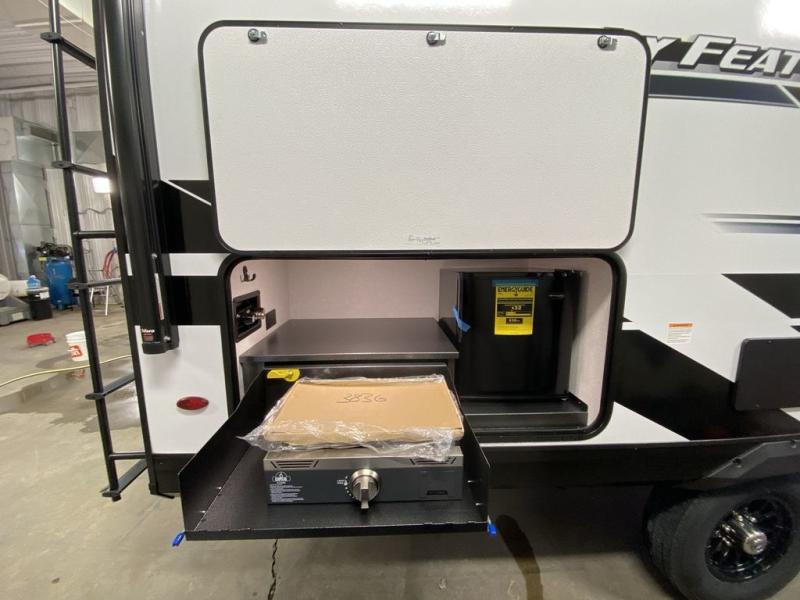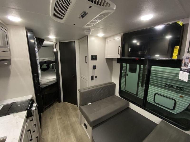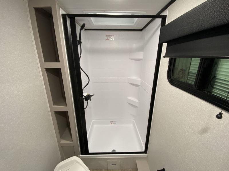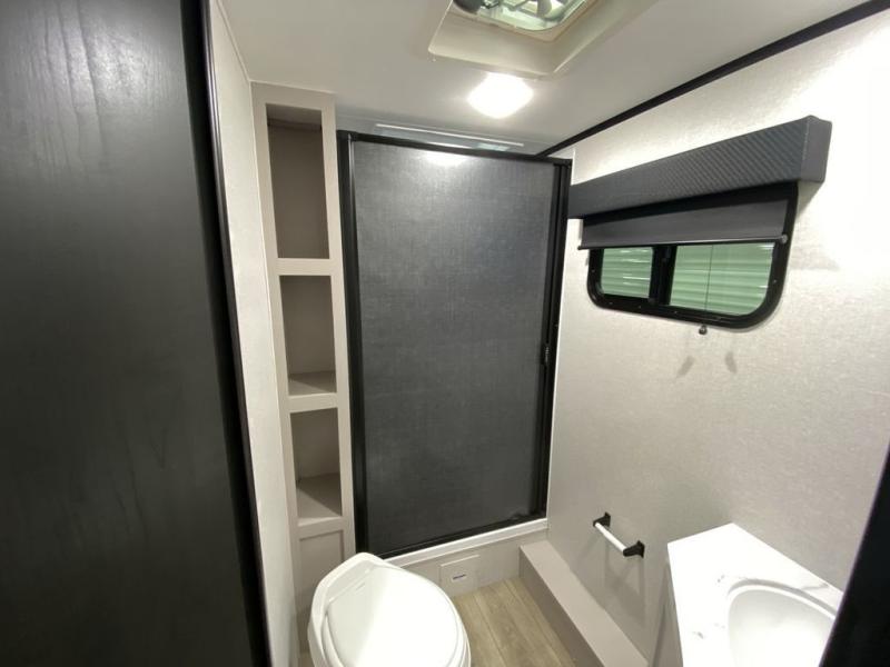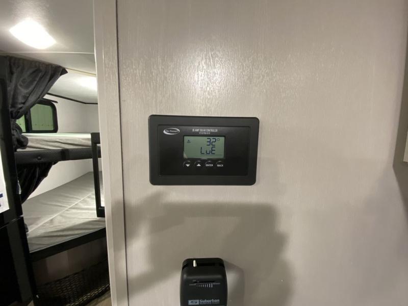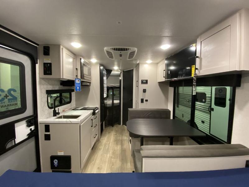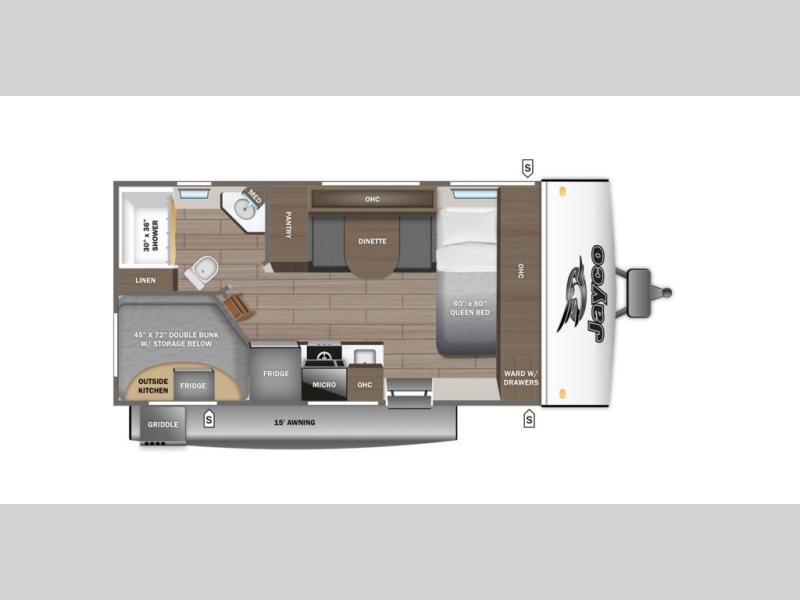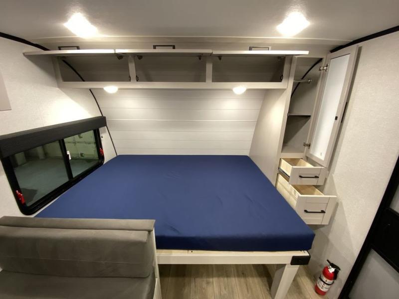 Step inside this travel trailer and you’re greeted by a spacious 60" x 80" queen bed, ensuring a restful night wherever your travels take you. At the foot of the bed, a wardrobe with drawers and overhead cabinets provides ample room for clothing and essentials. Centrally located, the kitchen is equipped with an 11 cu. ft. refrigerator, a two-burner cooktop, and a convection microwave, making it easy to whip up meals in no time. Across from the kitchen, the cozy dinette offers a comfortable place to enjoy meals or gather for board games after a day of adventure, and it conveniently converts into extra sleeping space at night. A large pantry nearby keeps dry goods and snacks organized. Toward the rear, you’ll find a full bathroom featuring a 30" x 36" shower, a linen closet, and a medicine cabinet, so you never have to rely on campsite facilities. In the opposite corner, 45" x 72" double bunks with storage below provide plenty of room for the whole gang, making every trip both fun and comfortable.