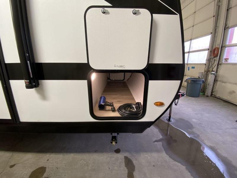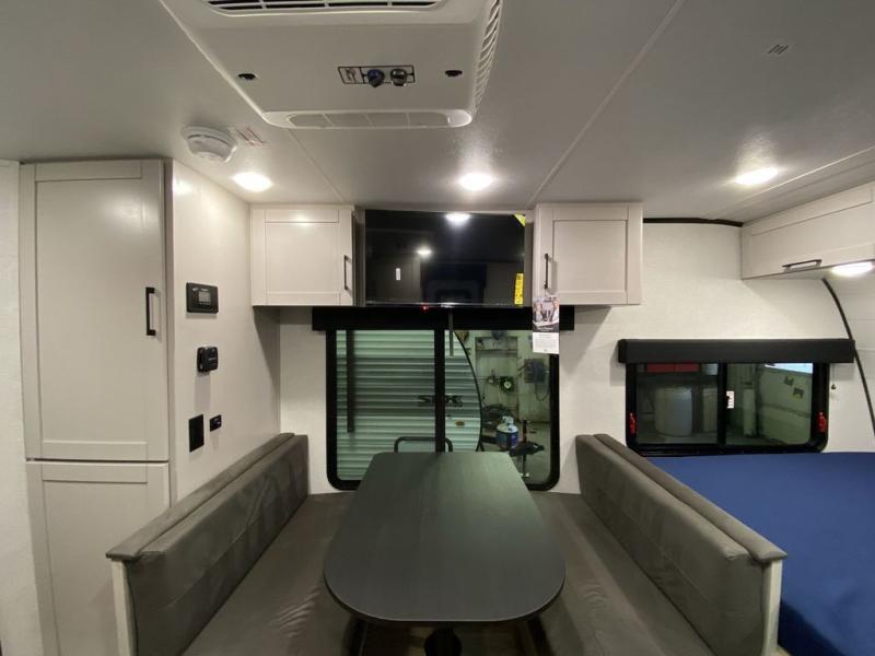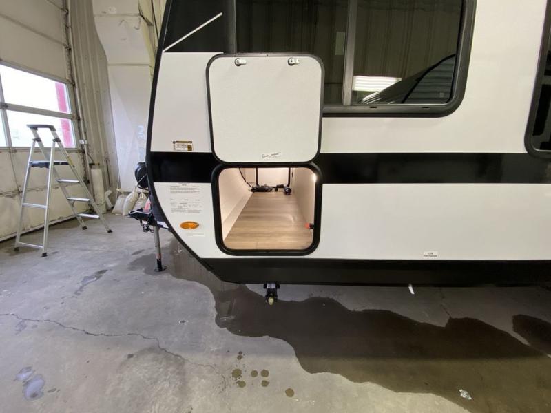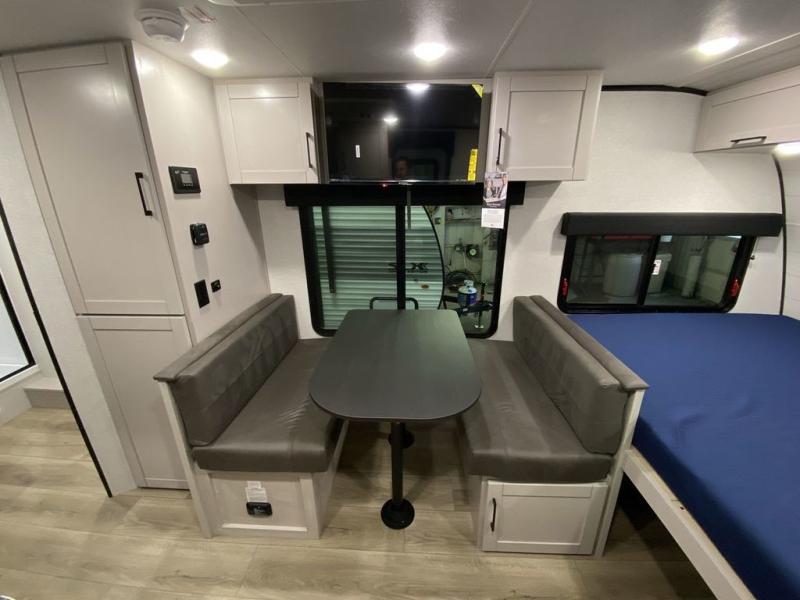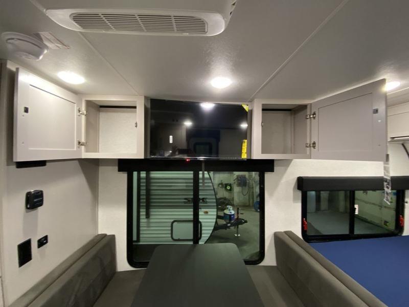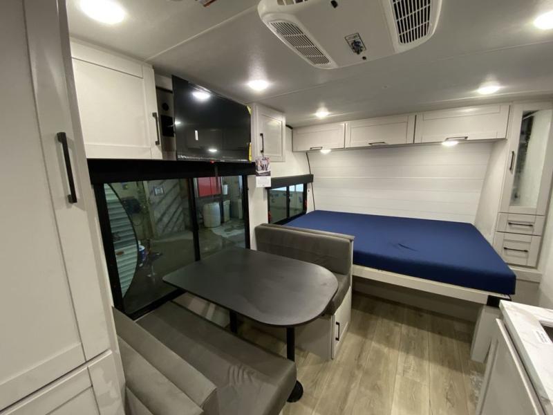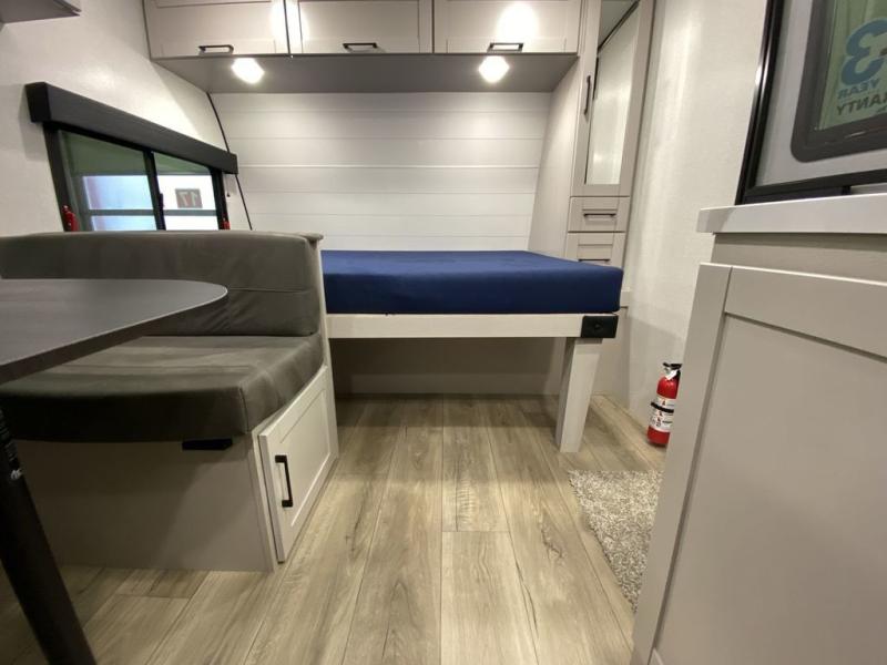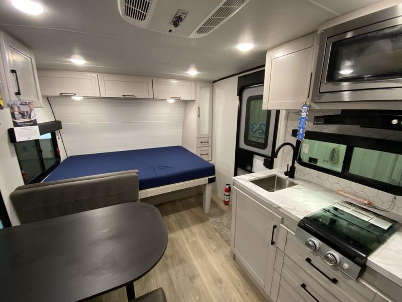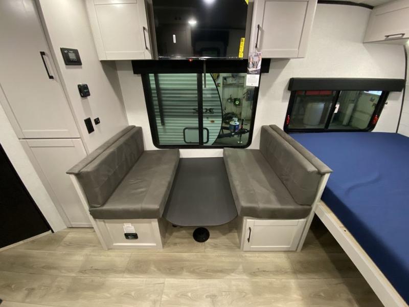 Step inside this travel trailer and you’re greeted by a spacious 60" x 80" queen bed, ensuring a restful night wherever your travels take you. At the foot of the bed, a wardrobe with drawers and overhead cabinets provides ample room for clothing and essentials. Centrally located, the kitchen is equipped with an 11 cu. ft. refrigerator, a two-burner cooktop, and a convection microwave, making it easy to whip up meals in no time. Across from the kitchen, the cozy dinette offers a comfortable place to enjoy meals or gather for board games after a day of adventure, and it conveniently converts into extra sleeping space at night. A large pantry nearby keeps dry goods and snacks organized. Toward the rear, you’ll find a full bathroom featuring a 30" x 36" shower, a linen closet, and a medicine cabinet, so you never have to rely on campsite facilities. In the opposite corner, 45" x 72" double bunks with storage below provide plenty of room for the whole gang, making every trip both fun and comfortable.