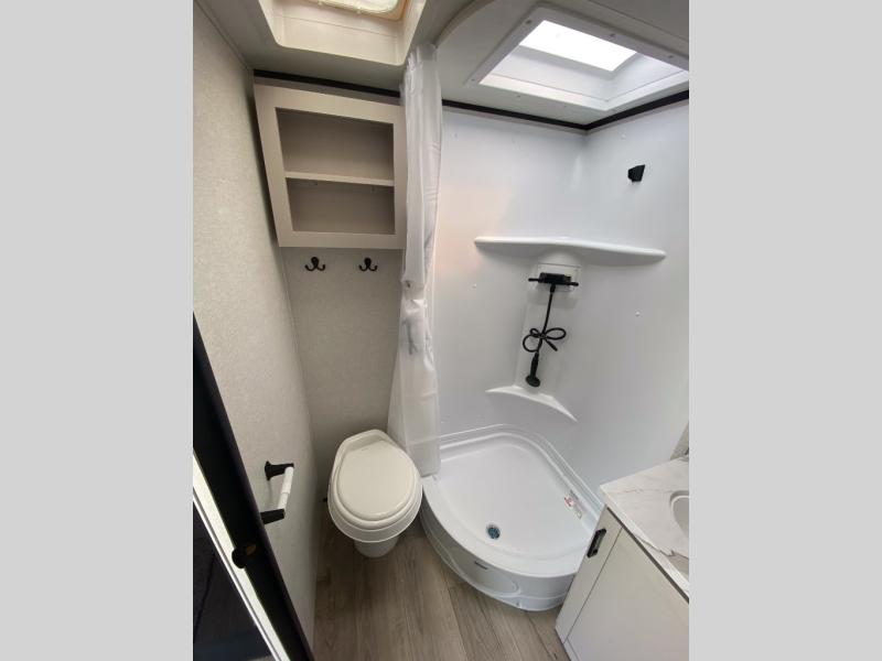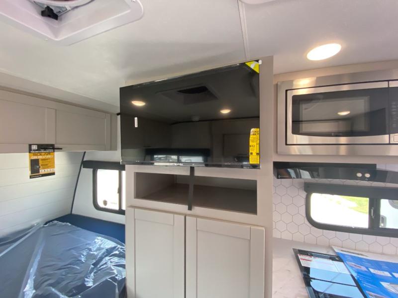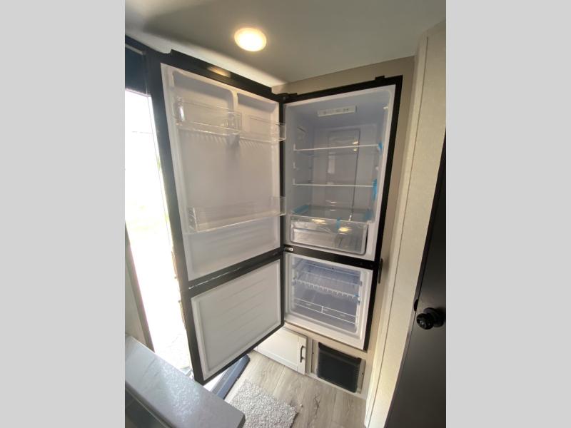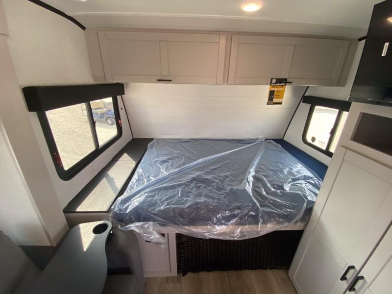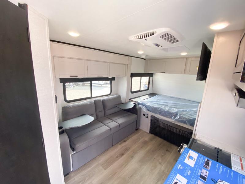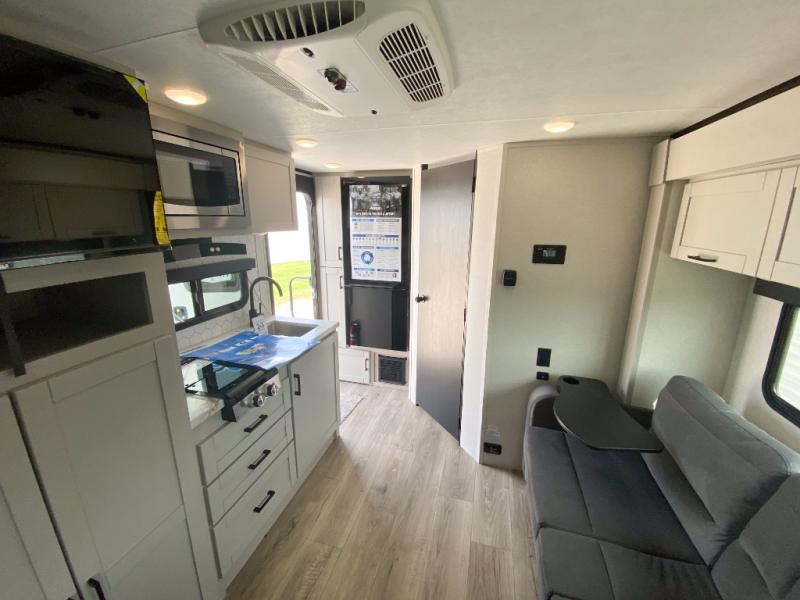 The perfect couple's trailer is found with this Jay Feather Air! You can sleep soundly each night on the front queen bed that includes a large overhead cabinet for books, board games and more. There is also a TV cabinet with a wardrobe below for even more storage. A Jack-knife sofa slide out includes table trays, giving you a place to dine together, and an overnight guest could sleep here if needed. Whip up your best meals on the two burner cooktop or in the microwave, and there is a refrigerator plus a pantry for food storage. The full bath includes a radius shower, a sink with a medicine cabinet, and a toilet with an overhead cabinet to keep all your toiletries tucked away.